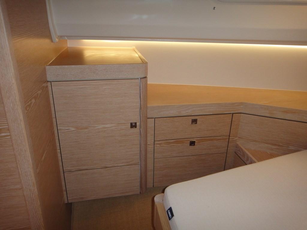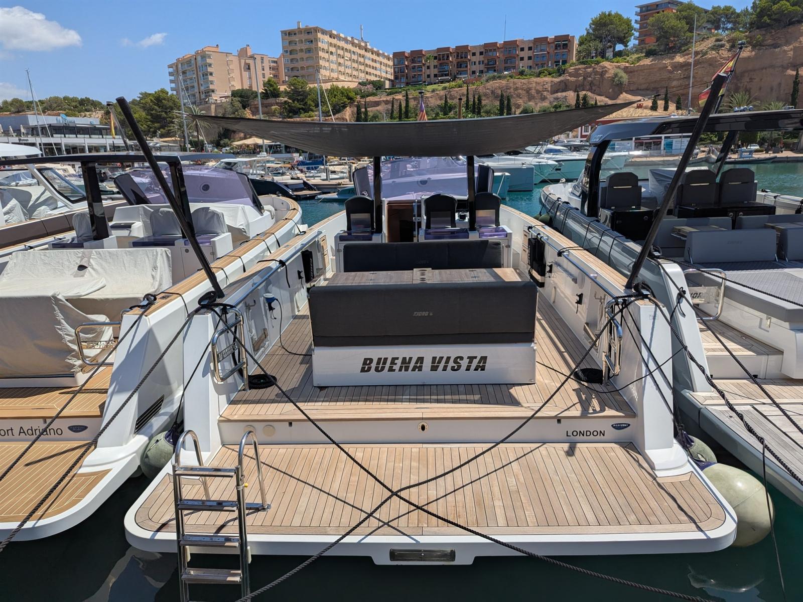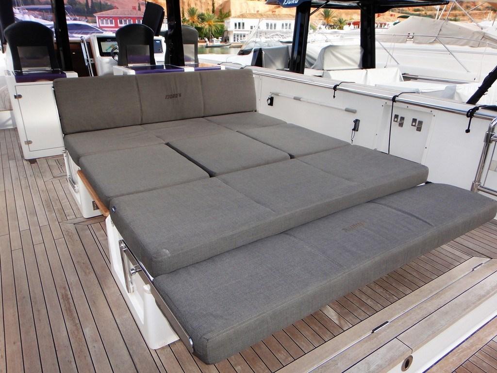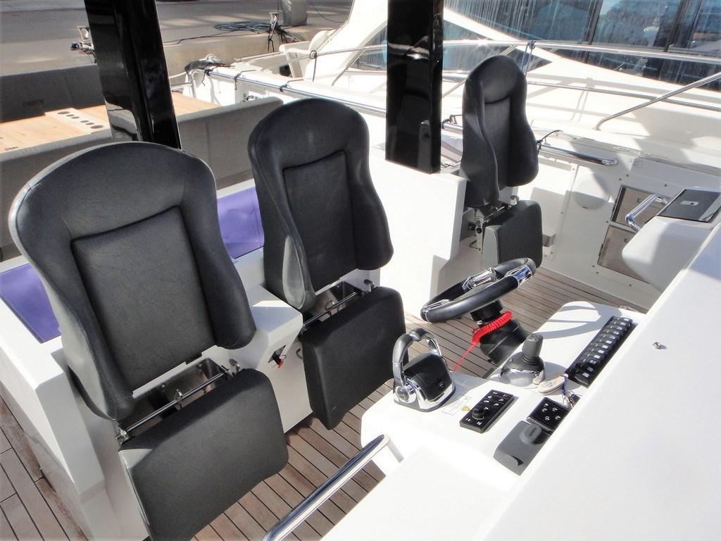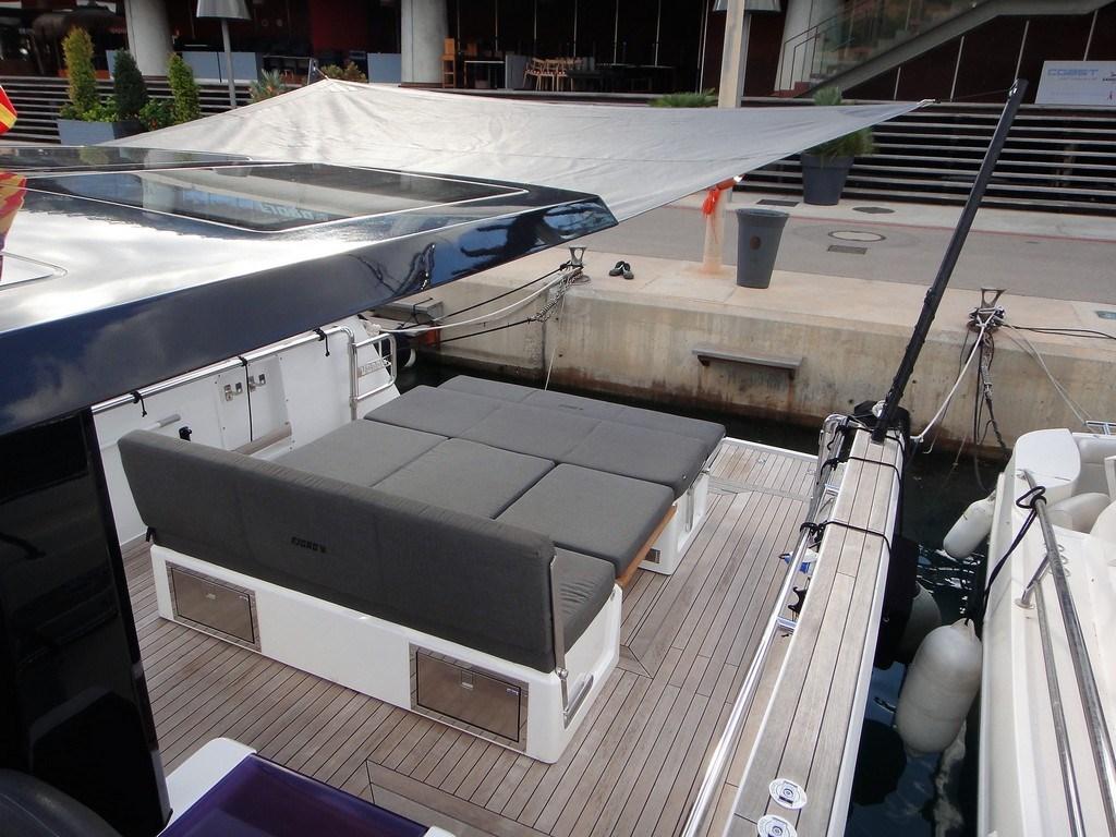 Bilge Alarm, Alternator, Water pressure pump, 6 Folding cleats, Draining System, Teak Side Decks, Deck Shower, Electric Flaps (Volvo Penta BTS), Fire Extinguishing System (Fire buoy), Flaps Indicators, Washbasin in the cockpit, Platform (enlarged swimming platform), Automatic Bilge Pump, Manual Bilge Pump, Teak deck, Entry door (sliding), Shorepower connector, Electric Windlass, swimming ladder, cockpit table (with teak and electric pedestal), 2 guard rails with gates, T-Top.