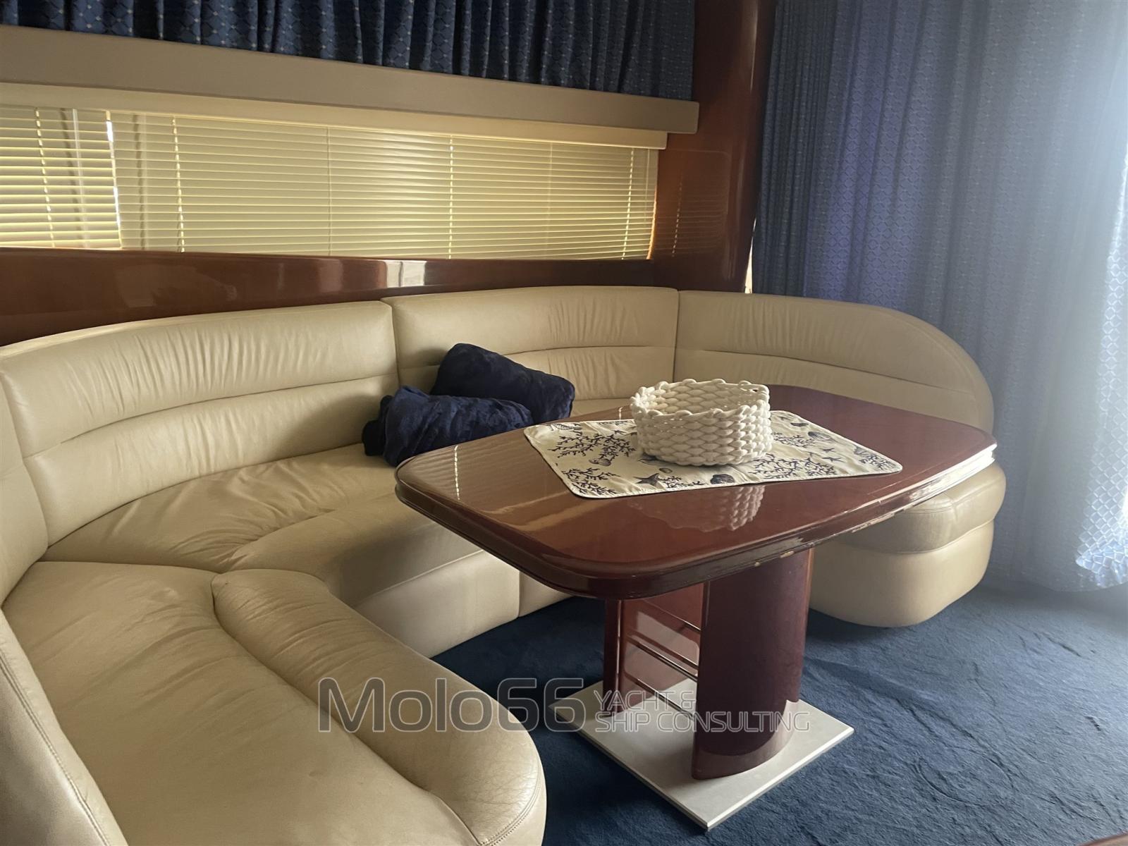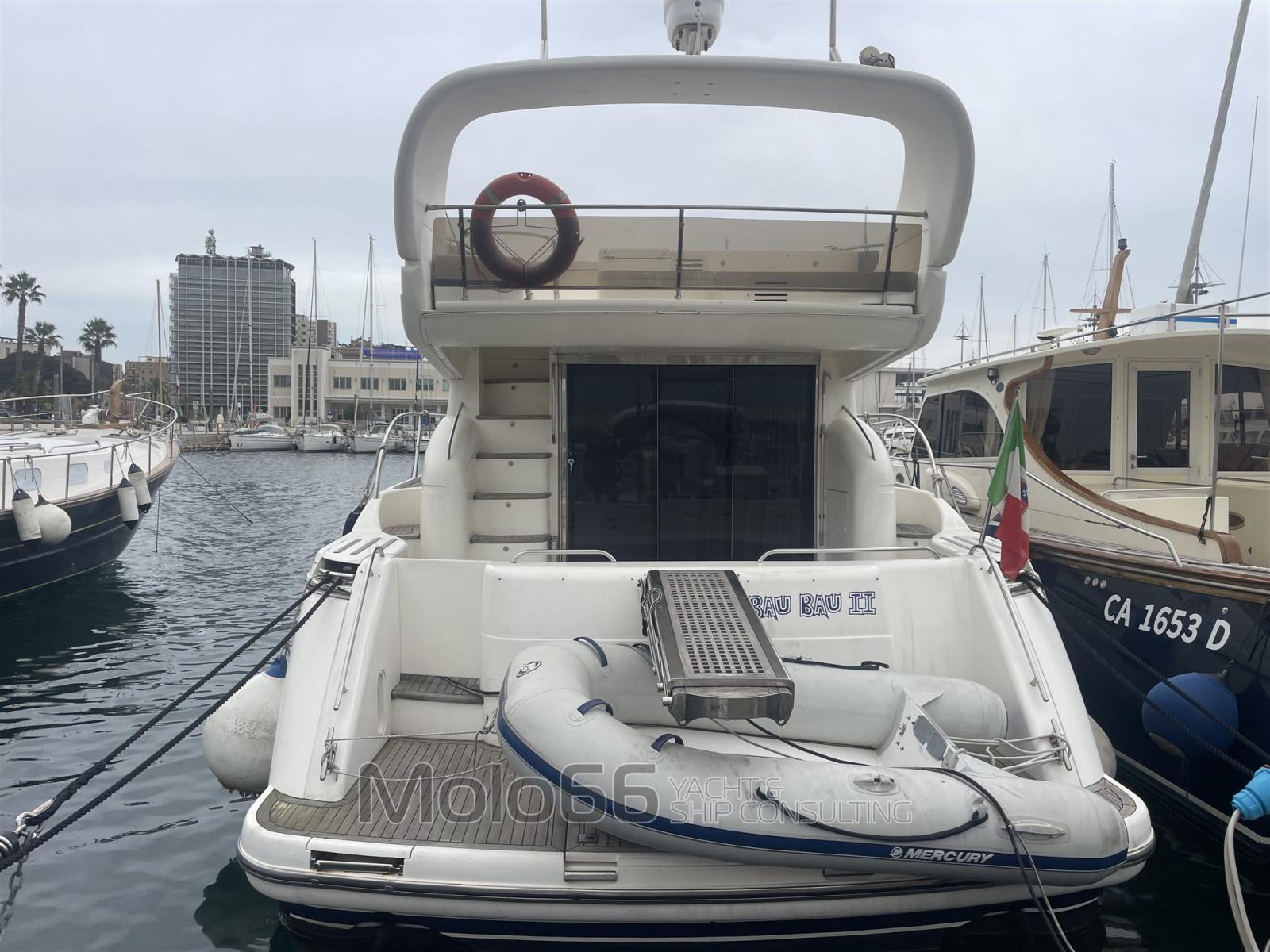 Engine Alarm, Bilge Alarm, Water pressure pump, Deck Shower, Twin Steering, Directional Spotlight, Hydraulic Flaps, Fire Extinguishing System, Gangway (elettrica), Teak Cockpit, Shorepower connector, Electronic instrumentation repeater, Electric Windlass, swimming ladder, Tender.