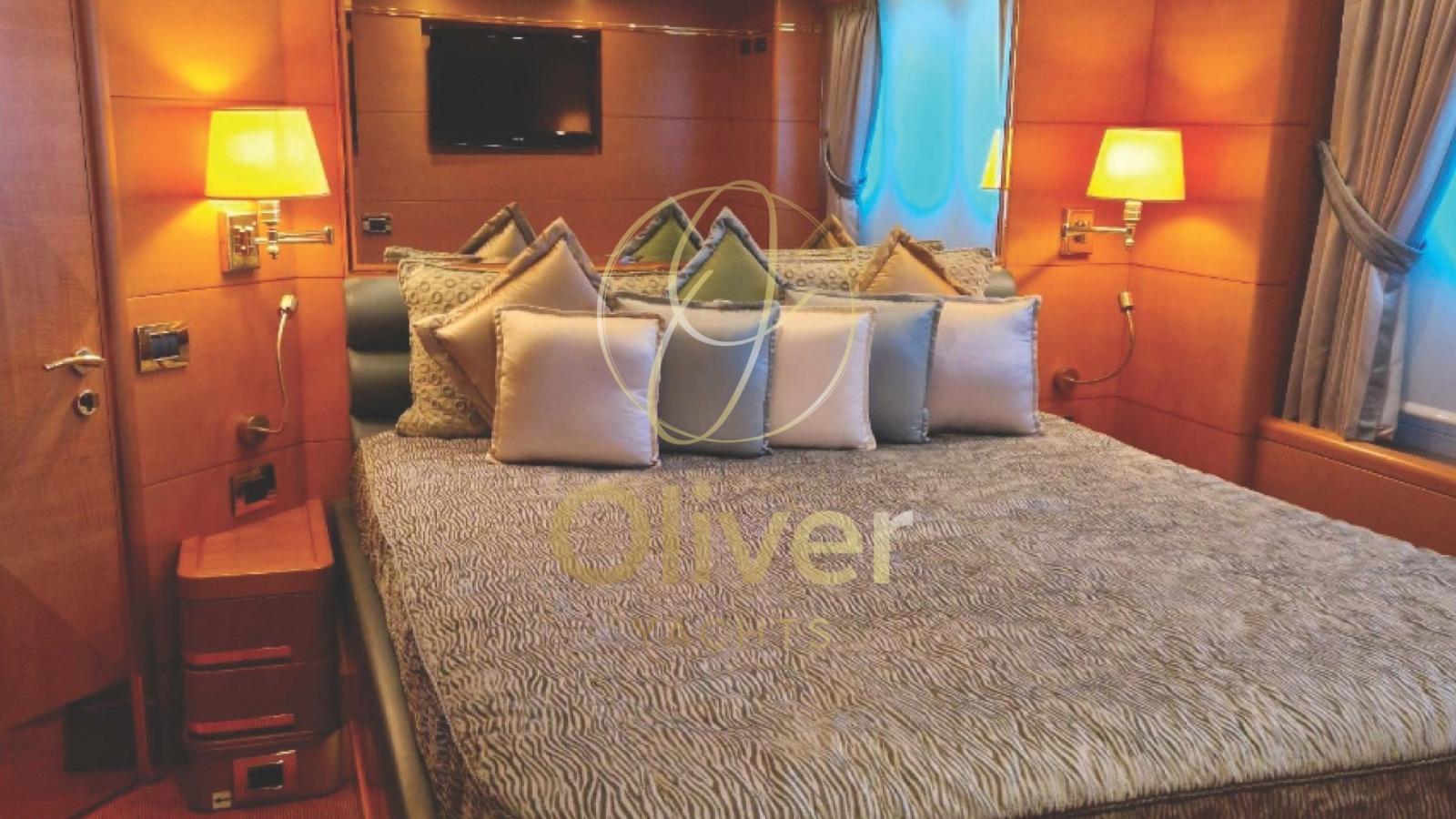The full-beam owner's suite on the main deck enjoys a 180-degree panoramic view and two separate "his & hers" bathrooms, while the guest area includes three double cabins with en-suite bathrooms and two twin cabins, each equipped with a pullman bed.