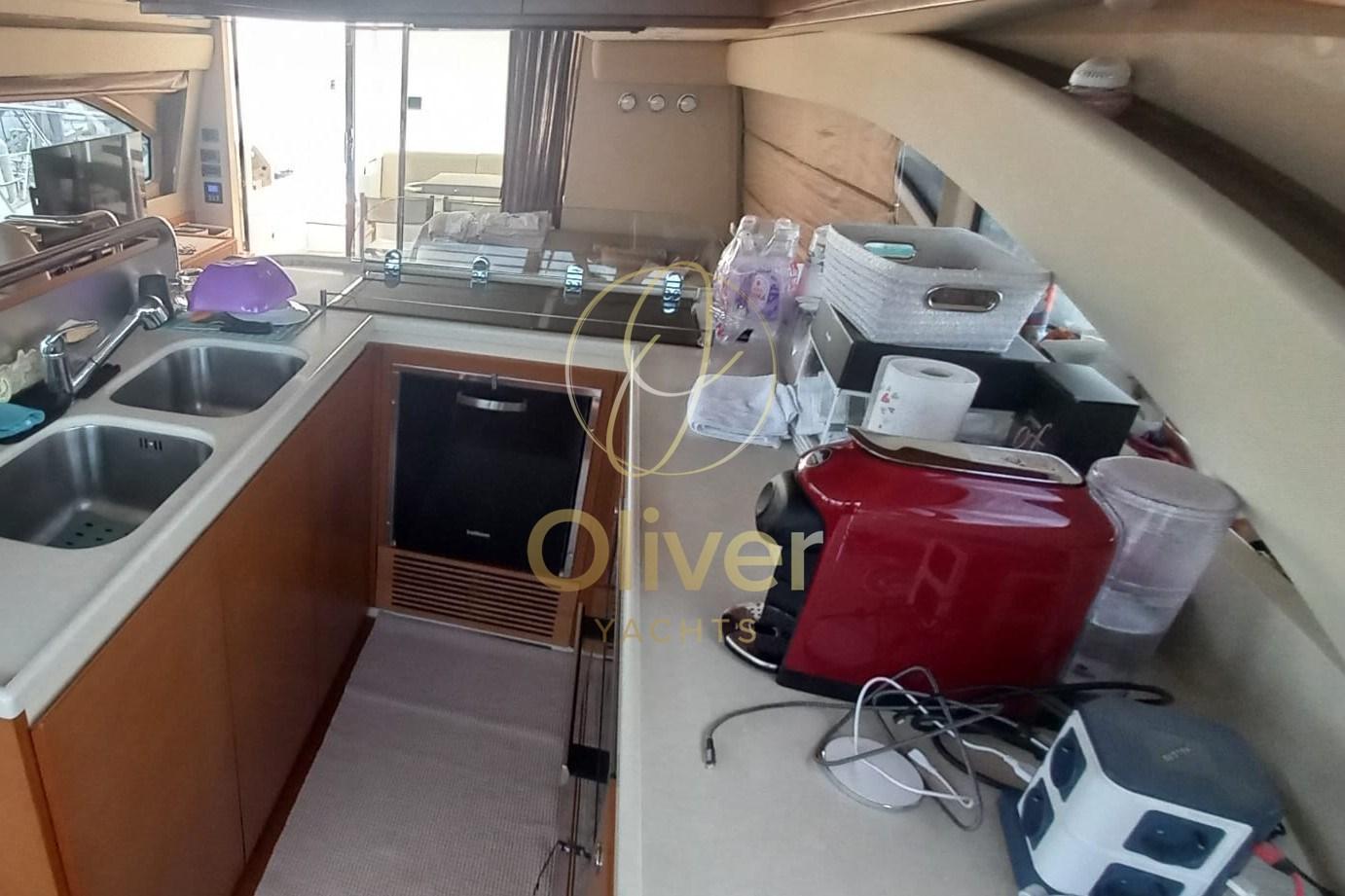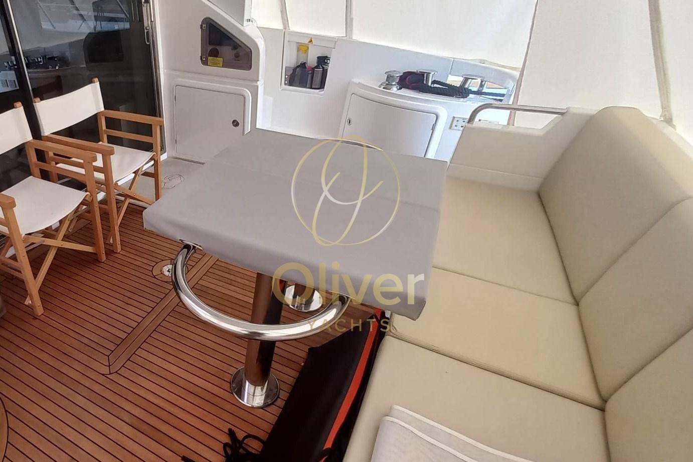 The living area is organized with a double dinette, ideal for accommodating guests at different times of the day, and a fully equipped U-shaped galley, which combines functionality and design. Everything is designed to offer maximum comfort, even during long cruises.