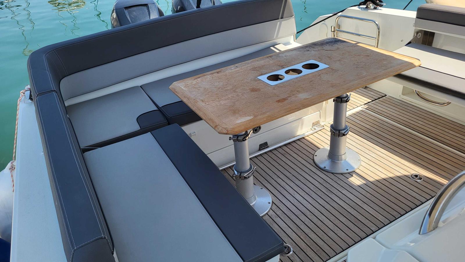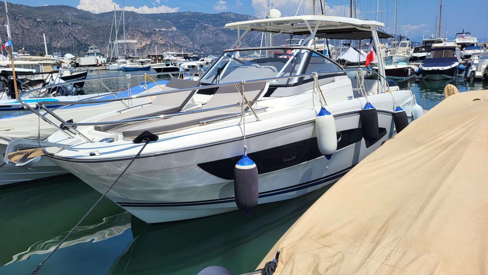 Ideal configuration for cruising and day trips, this boat offers comfort, power and top-of-the-range equipment. It has a generator, two fridges (inside and cockpit), an outside plancha, a large convertible cockpit saloon, forward sundeck, enclosed double cabin with additional berth, shower room with electric WC and shower, equipped cockpit, GPS plotter, VHF, electric windlass, flaps, sun awning, cockpit shower, bathing platform, upholstery in excellent condition,