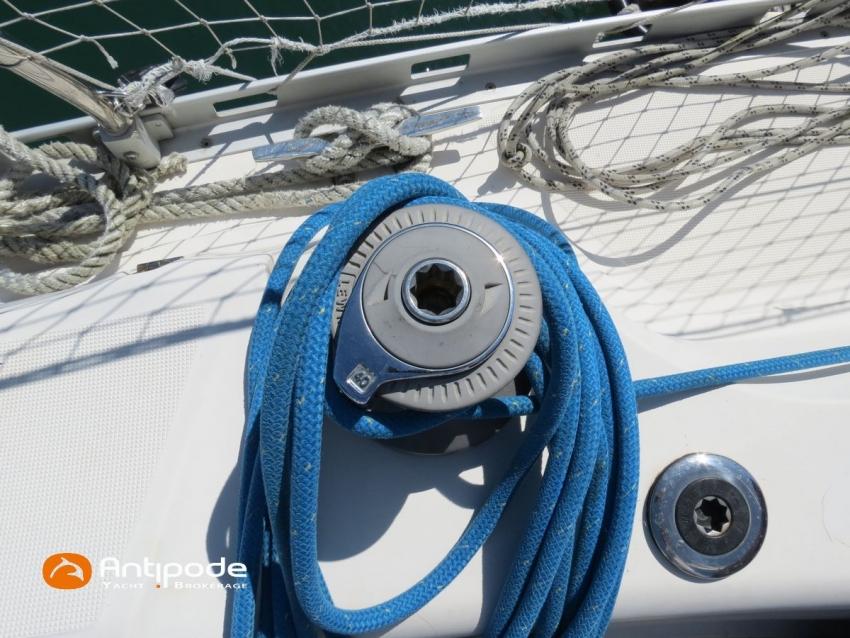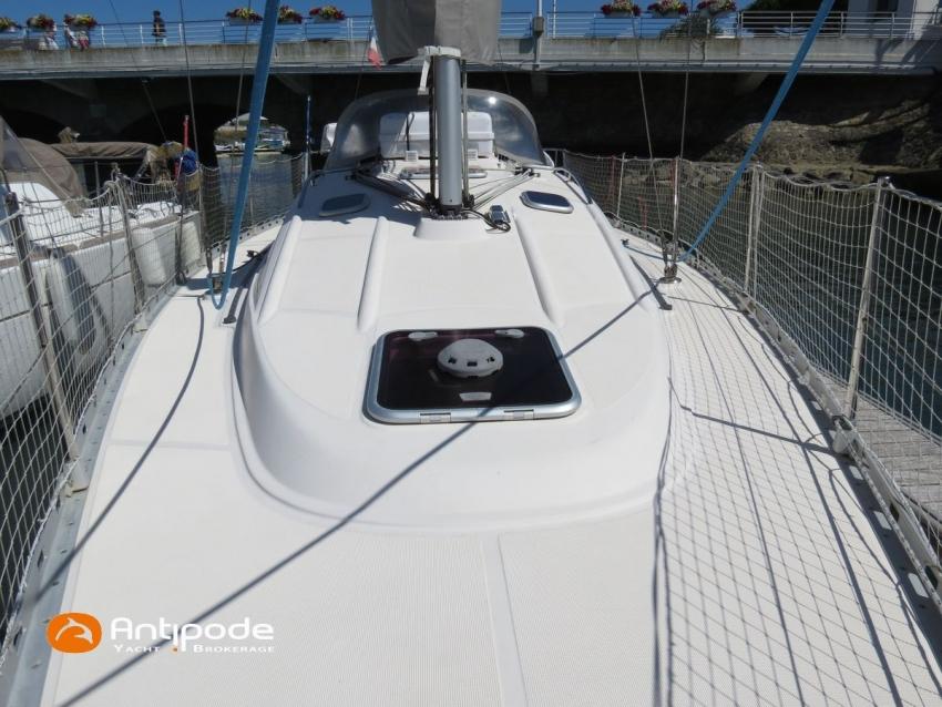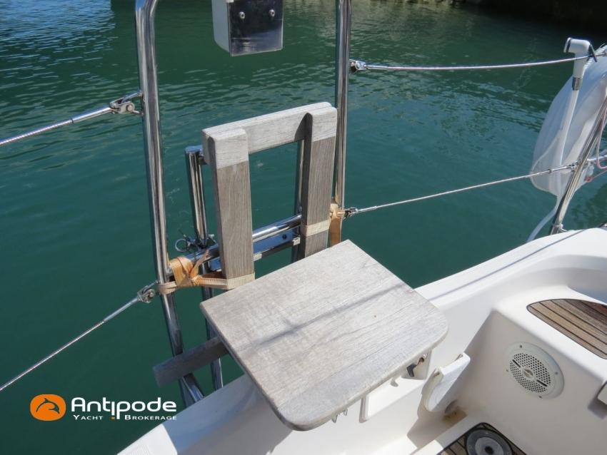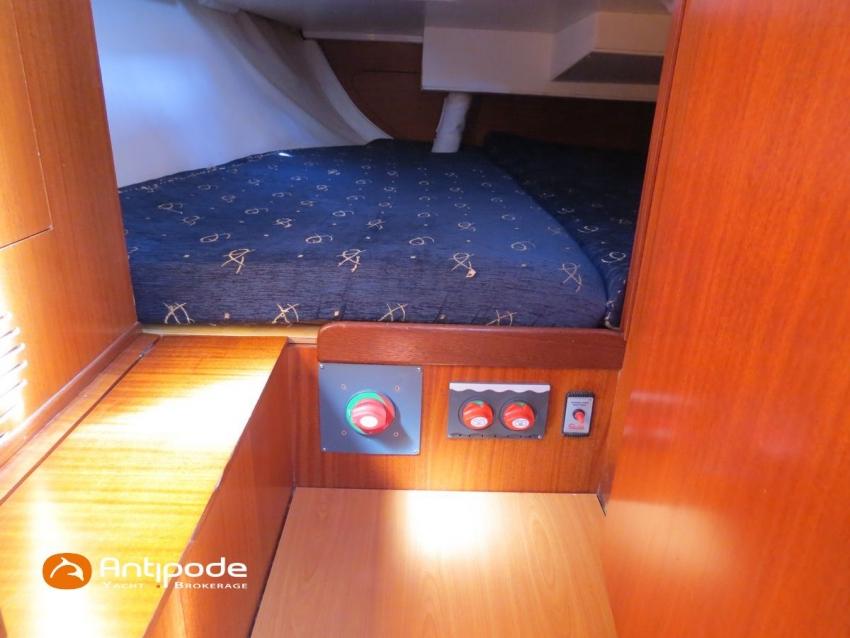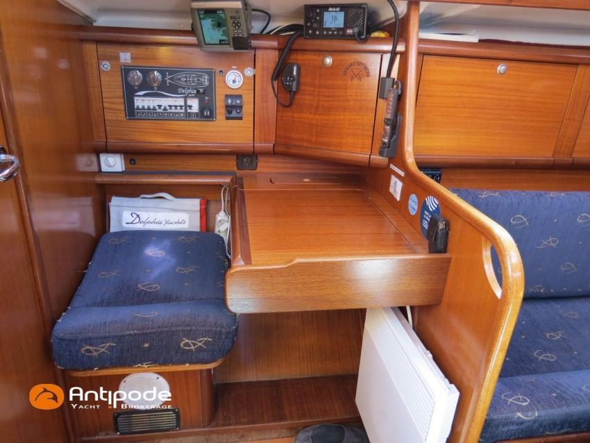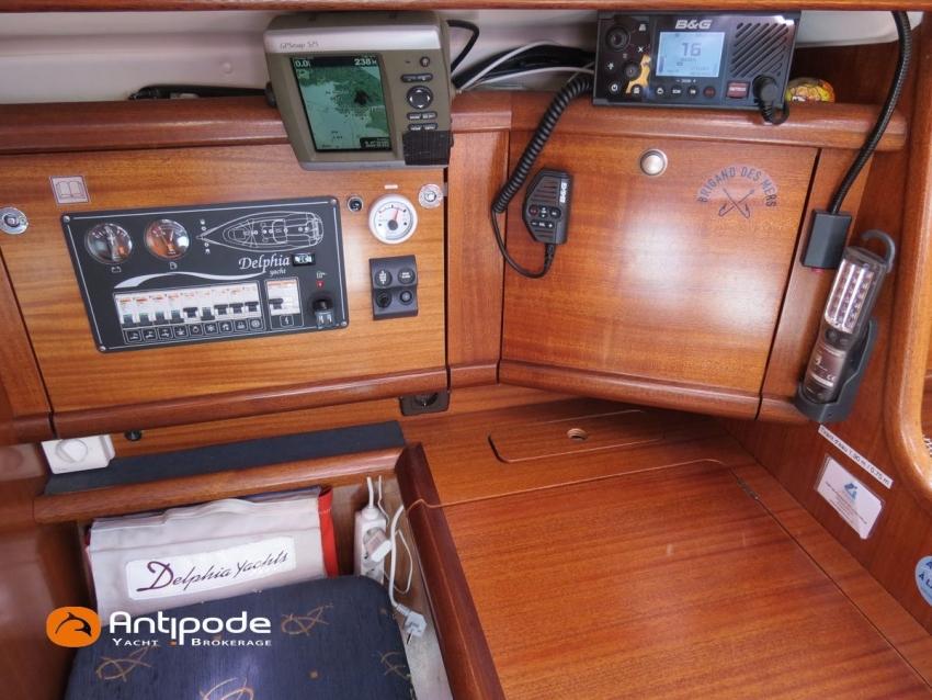 DELPHIA 33, 2009, Volvo D1-20, 20 hp (2070 hrs), Interior layout version 1 forward cabin, 1 aft cabin, 1 heads (toilets + shower), Mahogany interior woodwork, 2 cockpit primary genoa winches - Lewmar 40ST, 2 roof winches for adjustment and sail handling - Lewmar 30ST, Roof mounted main sheet traveller, Teak slatted cockpit floor, Teak cockpit seats, Teak bathing platform, Aluminium toerail, Carbonautica wheel steering system (2022), Cockpit sprayhood, Electric windlass (700W), Deck stepped aluminium classic mast and boom - Selden, Classic full batten main sail - Sextant 27m² (2014), 2 x Single line main sail reefing system, Main sail lazy bag (2024), Genoa roller furling with above deck drum - Furlex 200S, Furling genoa - Sextant 31m² (2015), Asymmetric spinnaker (2021), Spinnaker snuffer, Raymarine SPX 10 in board autopilot , Raymarine ST 60 navigation system, GPS and chartplotter (nav station) - Garmin - GPS Map 525, GPS and chartplotter (cockpit) - Raymarine Axiom 7 (2022), Electronic navigation charts, DSC AIS VHF at chart table - B&G V60 (2022), Fridge unit 12 V (top opening door), Hot and cold pressurized water, 220 V shore power + battery charger (2019), Service batteries - 3 x 100Ah, Heating system in saloon working with Volvo engine, Holding tank, Hot and cold cockpit shower, Leds interior lights, No liferaft, No safety equipments, Kobra 14kg anchor + 30m lenght of chain, Second anchor + chain, Fenders and warps, Only 2 private owners, no charter, Located Brittany. For more information or to make an appointment for a visit, contact : Jean-Baptiste Lemaire +33 6 10 25 00 03 - jb@antipode-yachts.com
