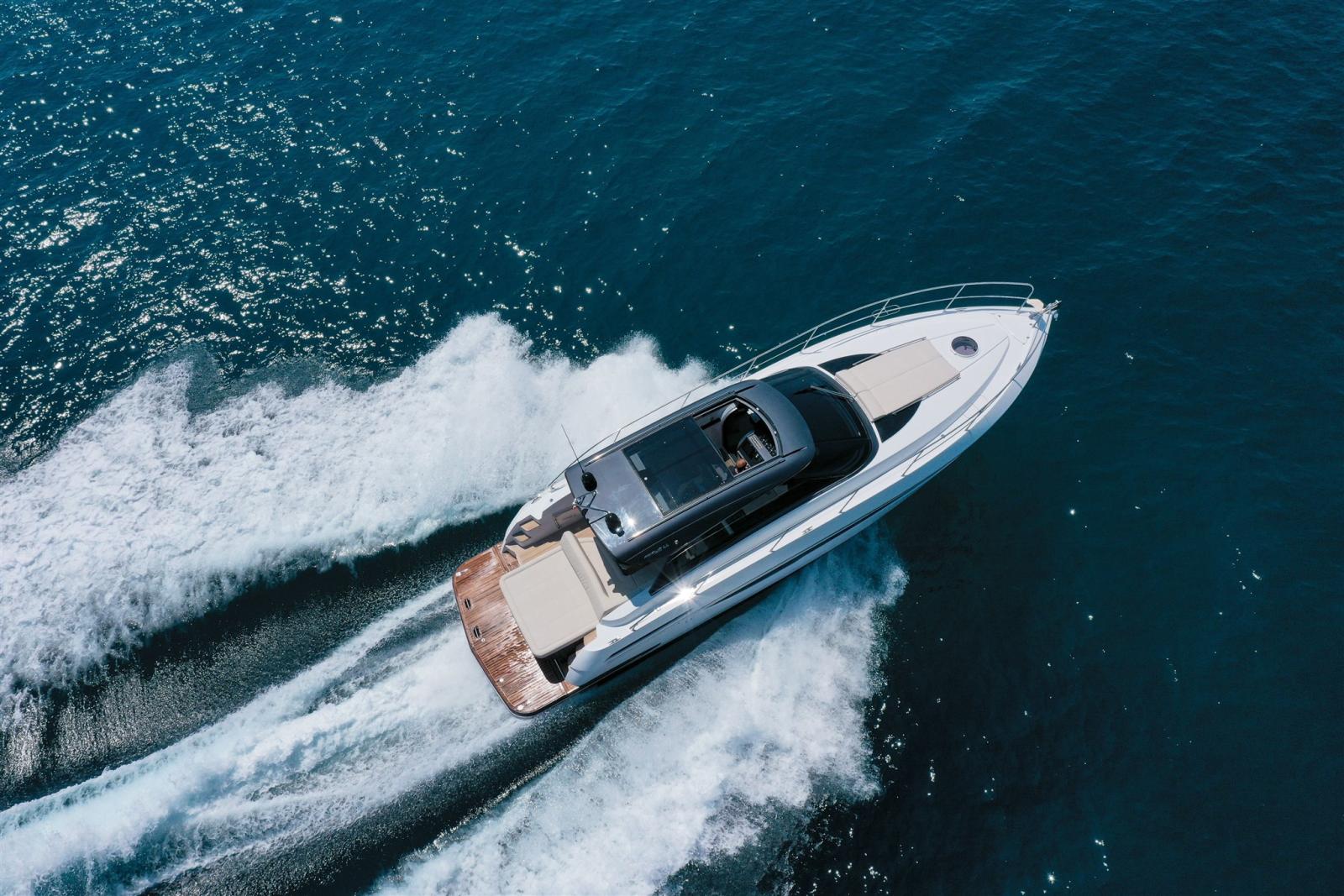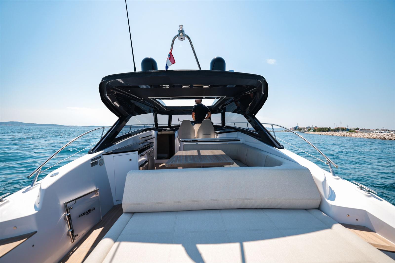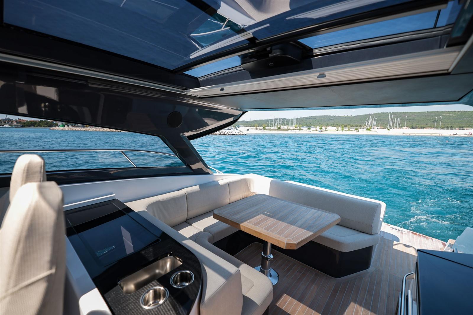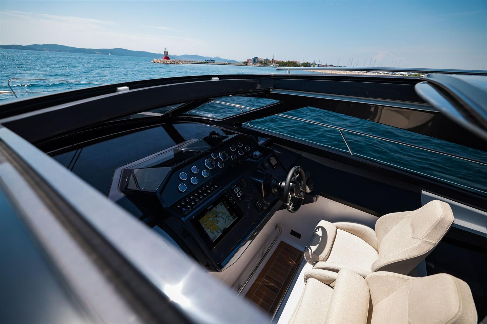 Fume/Gas Detector, Engine Alarm, Bilge Alarm, Anchor (Ultramarine), Auto Dynamic Trim Interceptor, Water pressure pump, Auto-Trim, Special Colour (hardtop (awlgrip)), Deck Shower, Electric Flaps, Hard top (in vetro con apertura elettrica), Flaps Indicators, Washbasin in the cockpit, Underwater lights (4), Gangway, Platform, Automatic Bilge Pump, Manual Bilge Pump, Entry door, Teak Cockpit, Shorepower connector, Water harbor connector system, Electric Windlass, swimming ladder, Waste Water Purifier System, cockpit table (con meccanismo saliscendi elettrico), Living Room Foldable Table, Bow Winches.