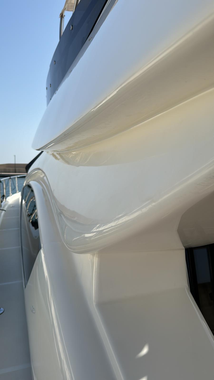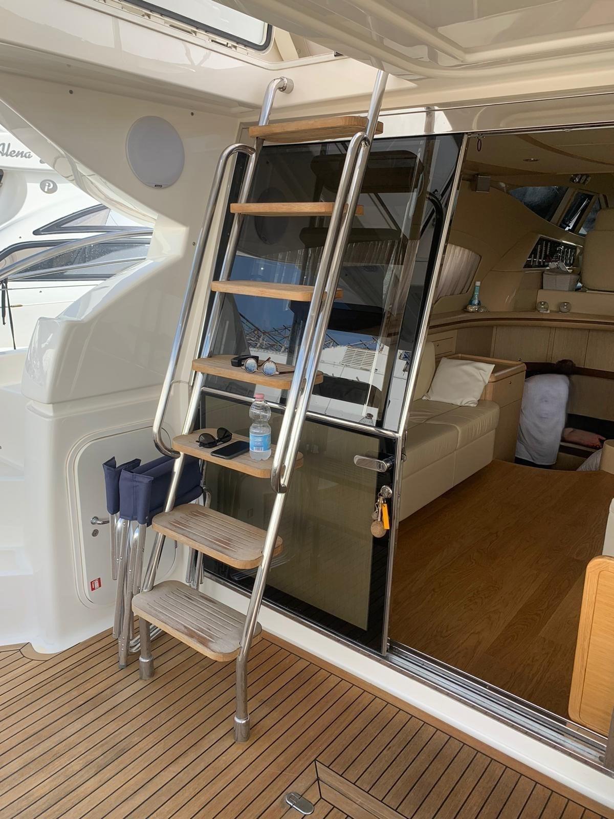 Engine Alarm, Water pressure pump, Deck Shower, Twin Steering, Directional Spotlight, Electric Flaps, Flaps Indicators, Courtesy Lights, Gangway (a scomparsa), Platform, Automatic Bilge Pump, Manual Bilge Pump, Entry door, Teak Cockpit, Shorepower connector, Water harbor connector system, Voltage Rectifier, Electric Windlass, swimming ladder, Saddles for tender, cockpit table, Horn, Stern Winches.