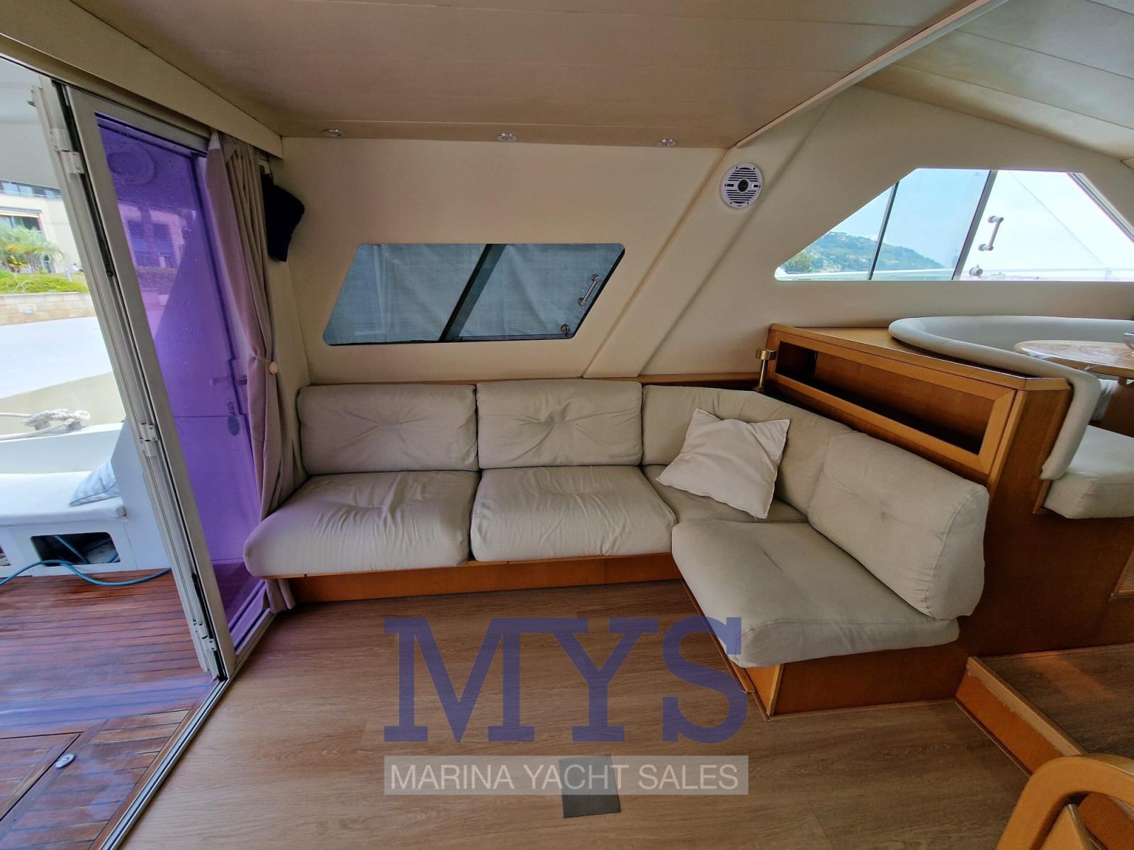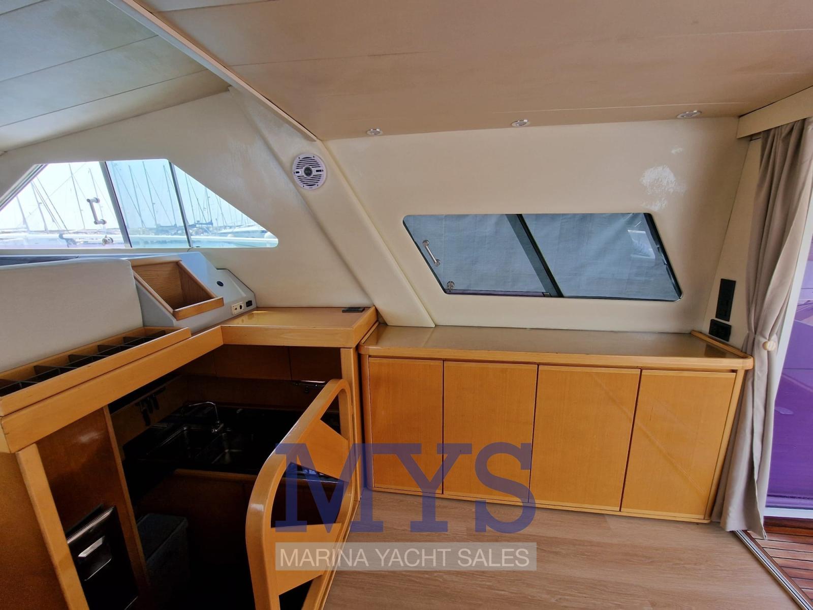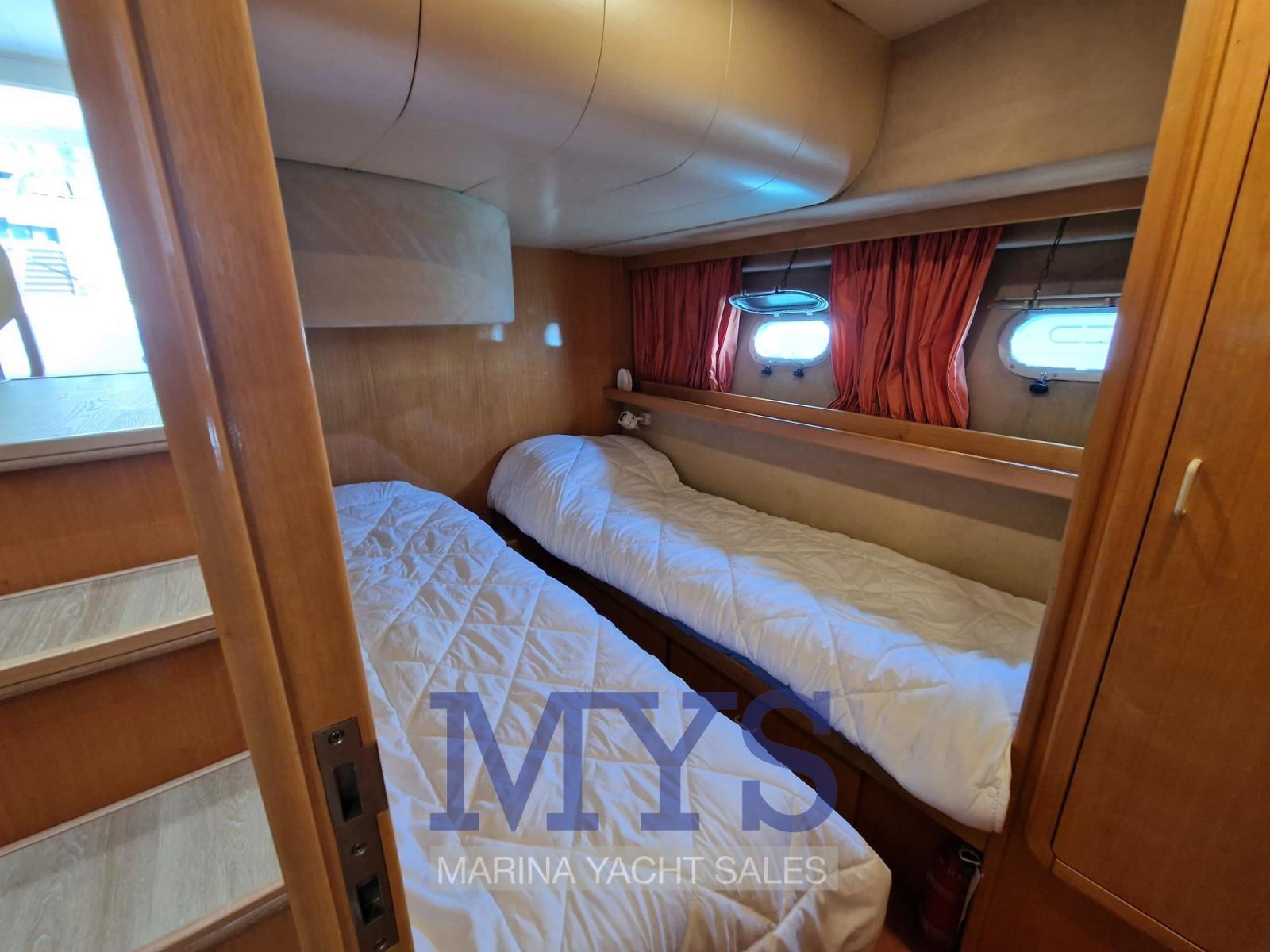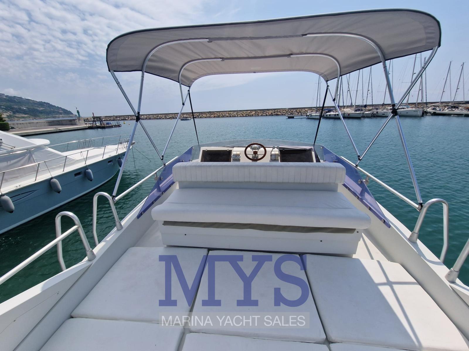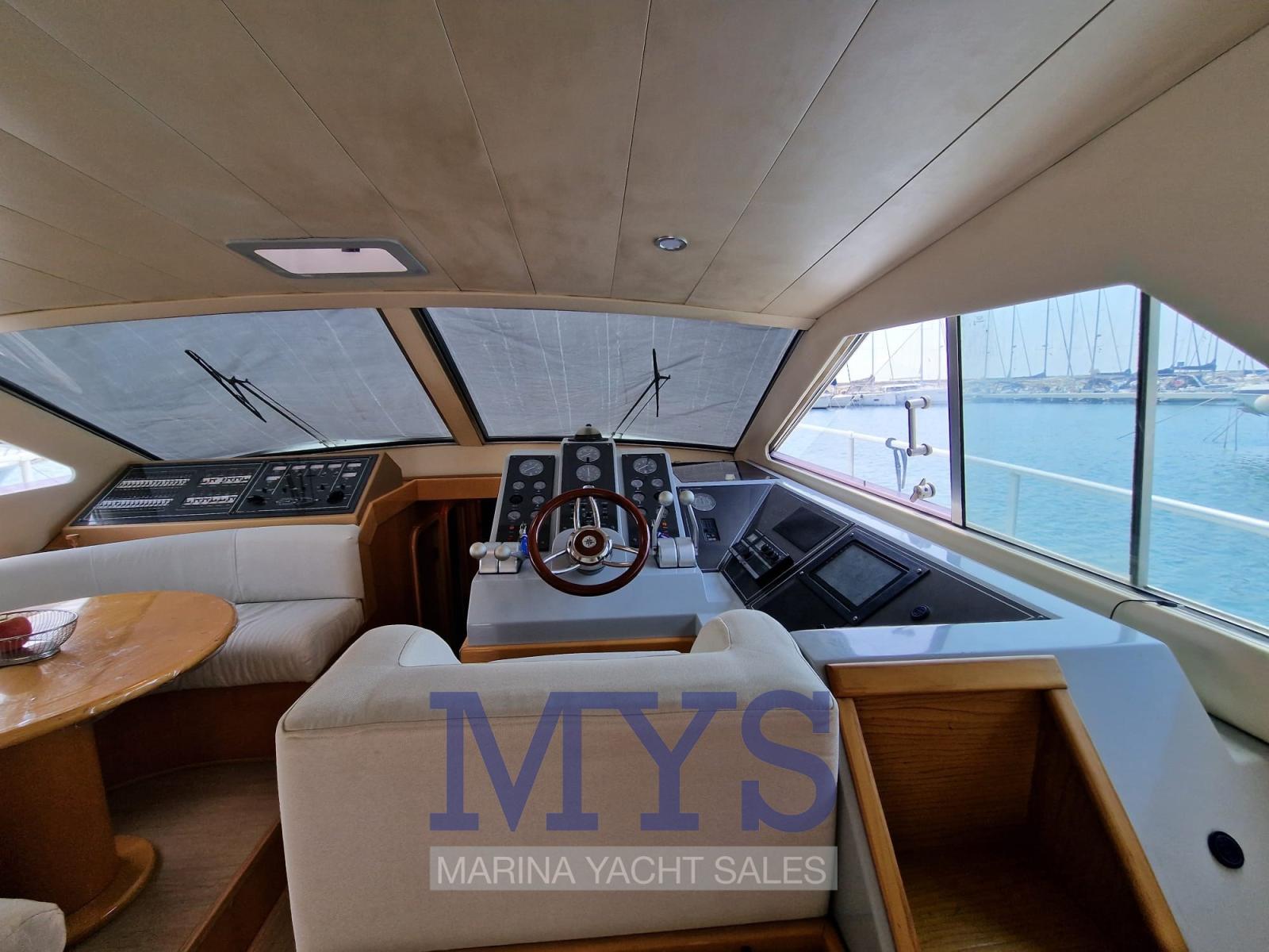 Engine Alarm, Bilge Alarm, Spare shaft, Water pressure pump, 6 Batteries, Deck Shower, Twin Steering, Hydraulic Flaps, Tender Crane, Fire Extinguishing System, Flaps Indicators, Gangway (Manuale), Platform, Automatic Bilge Pump, Manual Bilge Pump, Entry door, Teak Cockpit, Shorepower connector, Rollbar, Electric Windlass, swimming ladder, Horn, Bow Winches.