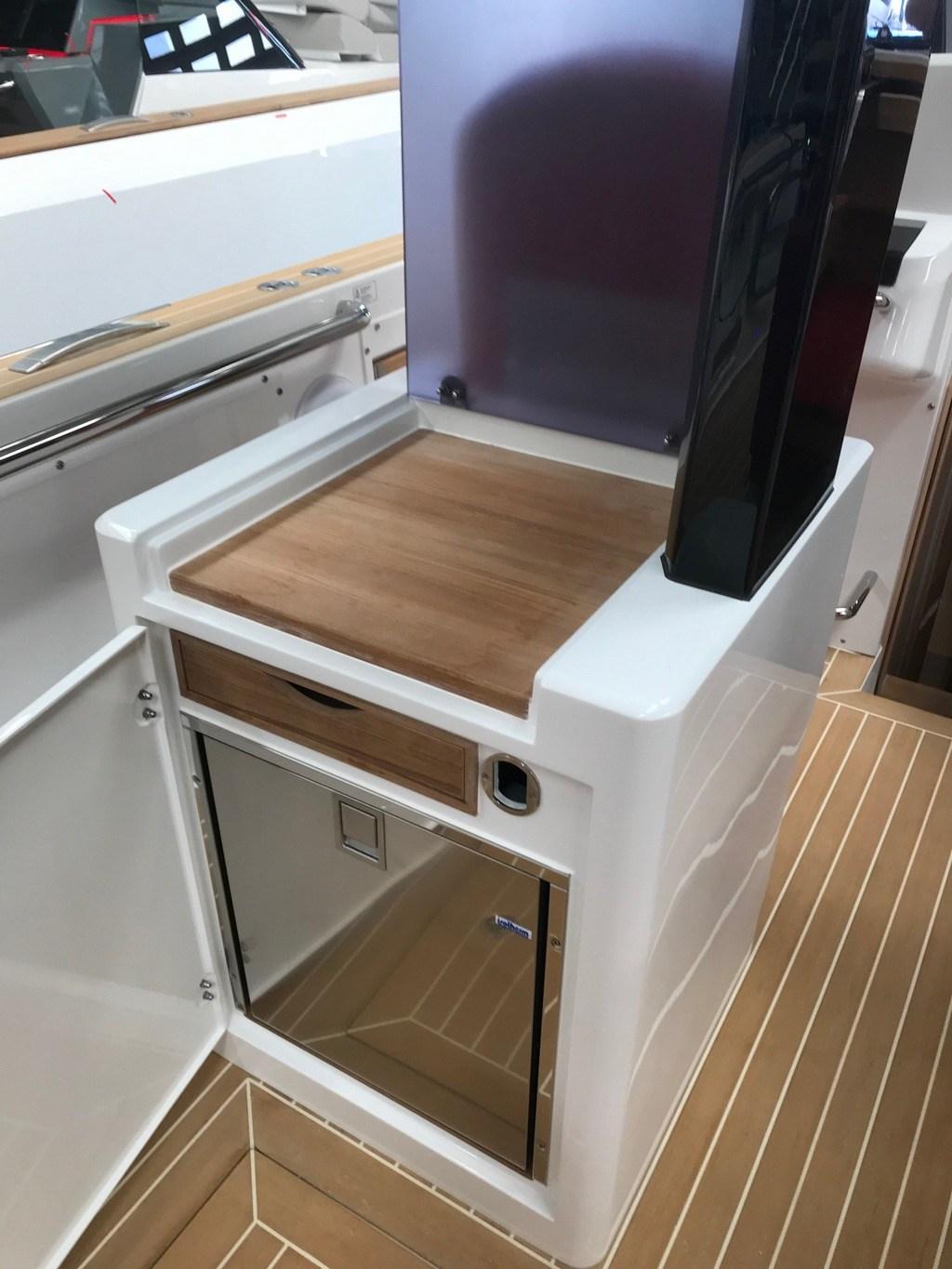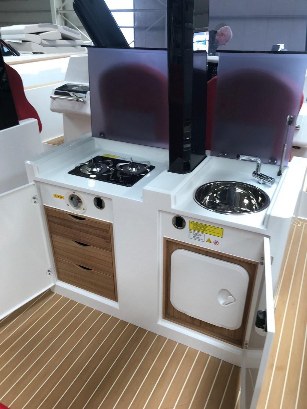 Galley (Exterior - under TTOP), 3 Deck Refrigerator (Std + 2 drawers under cockipt bench), Electric hot plate (Vitroceramic).