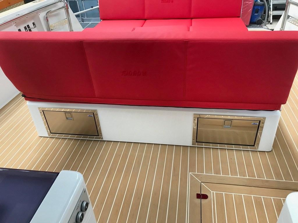 Bilge Alarm, 2 Alternator, Anchor (12kg + 50m chain), Water pressure pump, Auto-Trim, Batteries (2x90Ah+ 4x165Ah AGM), 6 Folding cleats, Draining System, Shore power cable, Deck Shower, 2 Trim Tabs / Trimflaps (Volvo Penta BTS), Fire Extinguishing System (automatic fireboy), Flaps Indicators, Washbasin in the cockpit, Courtesy Lights, Fenders, Platform (extended), Automatic Bilge Pump, 3 Electric Bilge Pump, Manual Bilge Pump, Teak deck (synthetic Flexi Teak), Entry door (sliding), Shorepower connector, Electric Windlass, swimming ladder (foldable), cockpit table (on electric pedestal convertible into sunpad with fill in cushion), 2 guard rails with gates, Horn, T-Top (Jet Black).
