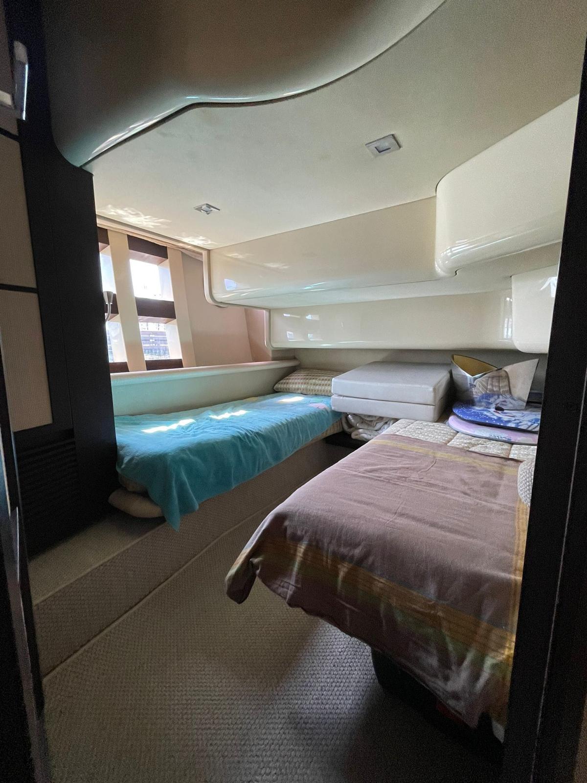 Owner's cabin in the bow with side windows and en-suite bathroom with separate shower cubicle.