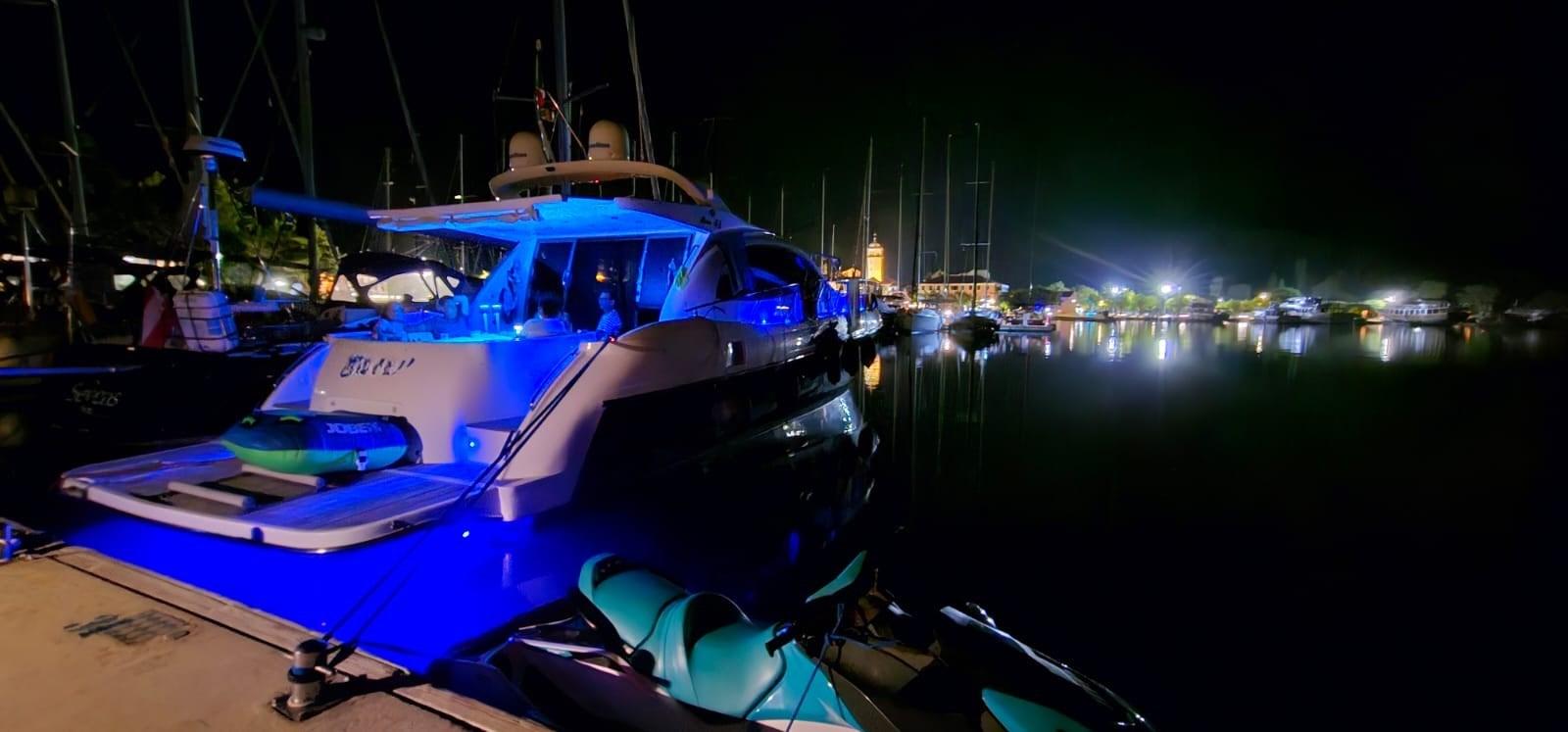 2 Engine Alarm, Bilge Alarm, Electric Engine Compartment Opening (sala macchine ,locale tecnico , locale stiva tutti alzabili elettricamente), Water pressure pump, Batteries (nuove 2022), Special Colour (blu), Deck Shower, 2 Hydraulic Flaps, Hard top (con tettuccio apribile), Fire Extinguishing System, Flaps Indicators, Courtesy Lights, Underwater lights, 2 Solar panels, Gangway (a scomparsa), Platform (tenderlift), Automatic Bilge Pump, Entry door, Teak Cockpit, Shorepower connector, Water harbor connector system, Voltage Rectifier, Electric Windlass, swimming ladder, cockpit table (abbattibile), Living Room Foldable Table (12 persone), Horn, T-Top, Bow Winches.