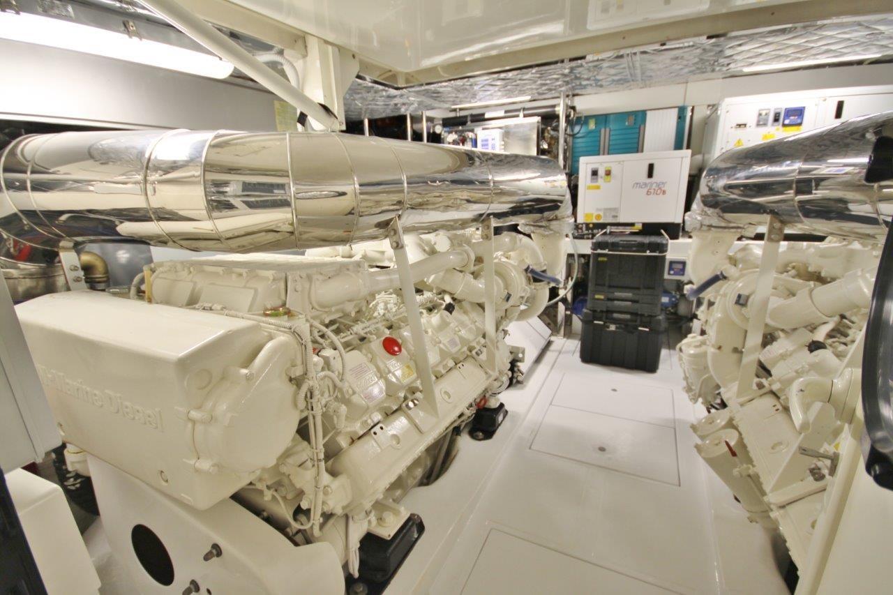 Engine Alarm, Bilge Alarm, 2 Water pressure pump, 8 Batteries, Teak Side Decks, Deck Shower, Twin Steering, Directional Spotlight, Hydraulic Flaps, Tender Crane, Fire Extinguishing System, Flaps Indicators, Anchor Chain Washdown, Underwater lights, Gangway (a scomparsa nuova 2019), Platform, 4 Automatic Bilge Pump, Entry door (elettrica), Side door, Teak Cockpit, Shorepower connector, Water harbor connector system, Voltage Rectifier, Electronic instrumentation repeater, Rollbar, Electric Windlass, swimming ladder (idraulica), cockpit table, Horn, 2 Stern Winches.
