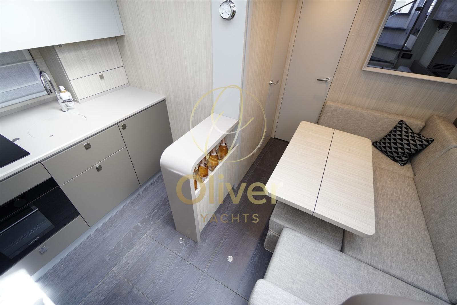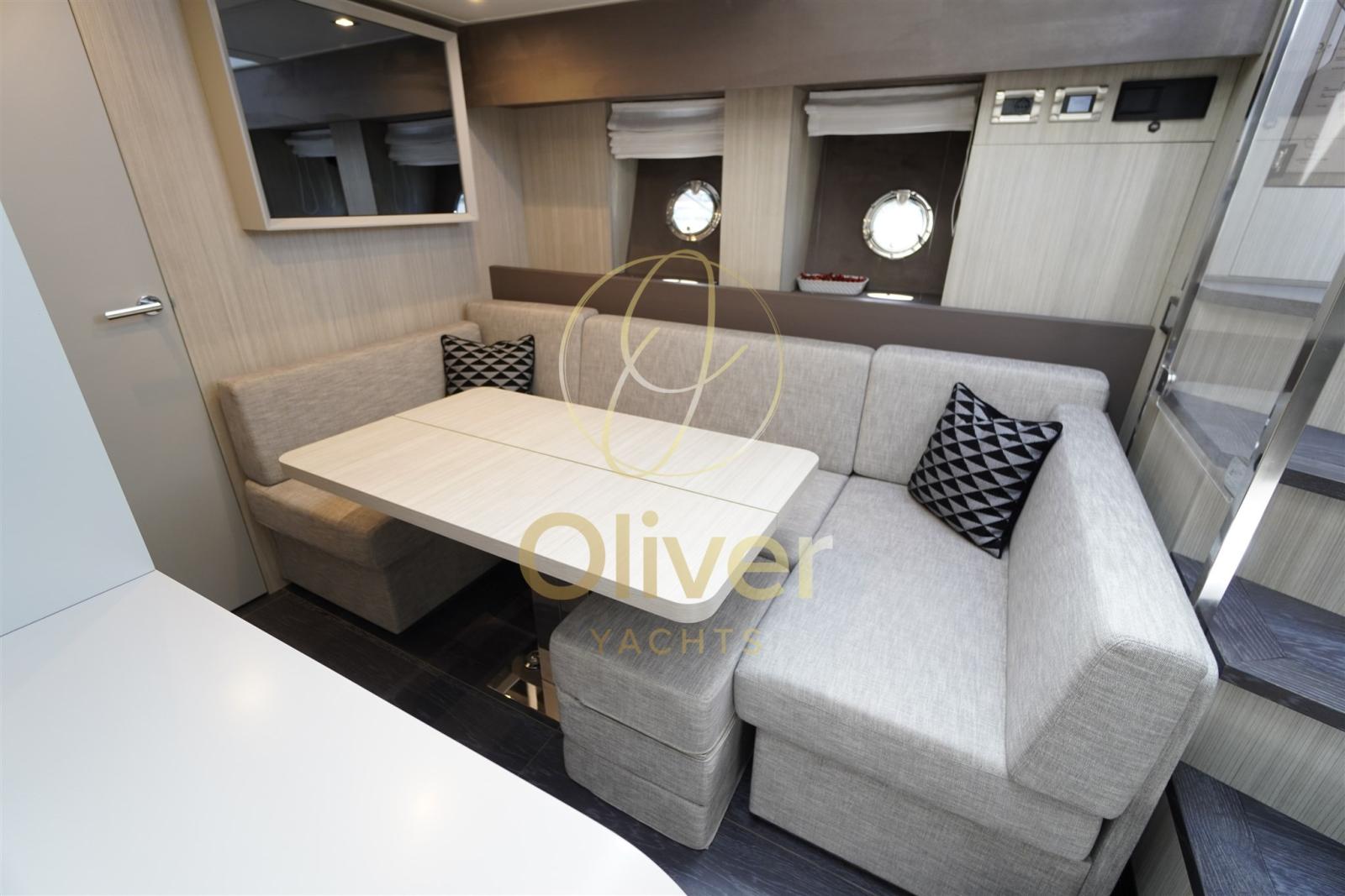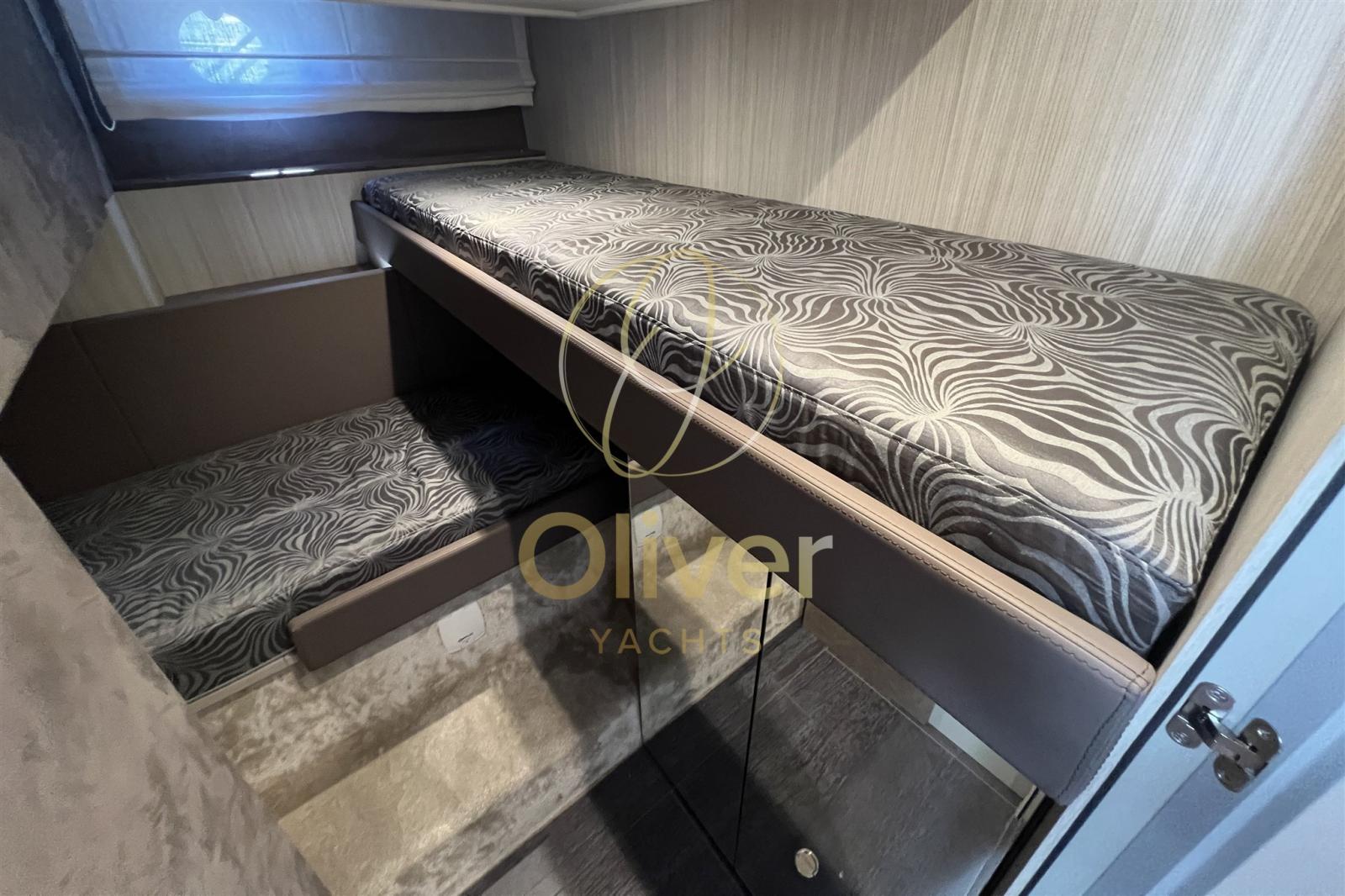 The interiors of the Cranchi 60 ST are a triumph of contemporary design, comfort and functionality, designed to offer an elegant and relaxing atmosphere during every navigation. The materials are selected with extreme care: light upholstery with a brushed wood effect, fine fabrics, dark oak slatted flooring and alcantara inserts create a warm and sophisticated environment. The layout includes a large saloon with convertible dining area, a kitchen equipped with induction hob, oven, dishwasher and ample storage space. There are three guest cabins. The master cabin amidships is a true suite, complete with a private bathroom and large wardrobe. The VIP cabin in the bow accommodates two people with great comfort, while the third cabin with crossed beds is perfect for children or guests. The well-thought-out LED lighting, the numerous portholes and the panoramic windows guarantee natural light and airiness in every room. The interiors of the 60 ST are designed to experience the sea with style and practicality, with intelligent solutions that optimize every space and materials that convey timeless elegance. It is a real yacht to experience, not just to admire.