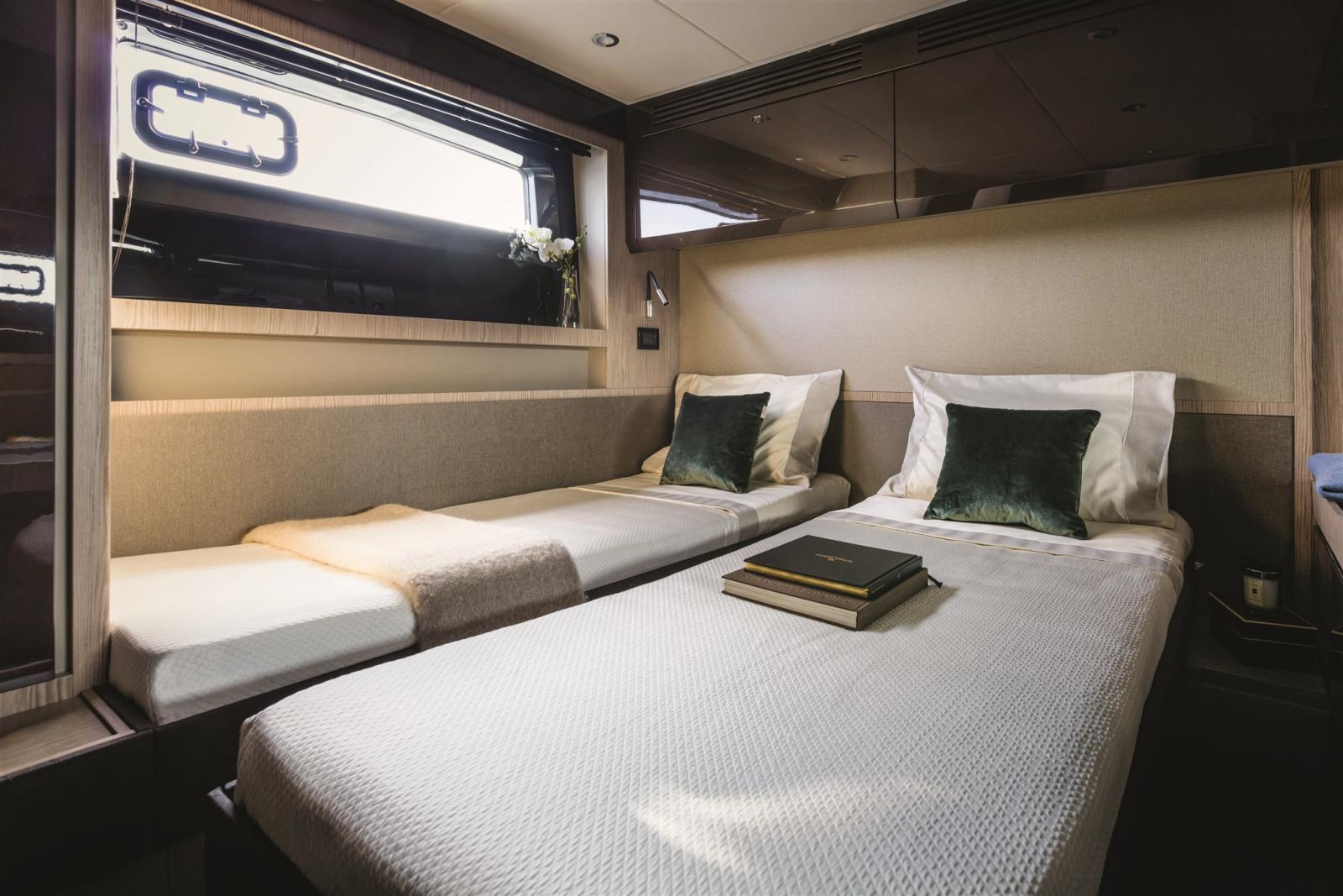 2 Engine Alarm, Bilge Alarm, Auto Dynamic Trim Interceptor (Volvo Interceptor), Water pressure pump, Deck Shower, Electric Flaps, Tender Garage, Hard top (elettrico), Fire Extinguishing System, Washbasin in the cockpit, Courtesy Lights, Gangway (idraulica a scomparsa), Platform (idraulica con piano in teak), 3 Automatic Bilge Pump, Entry door, Teak Cockpit, Shorepower connector, Voltage Rectifier, Electric Windlass, swimming ladder, Saddles for tender (sistema di alaggio), cockpit table (con finitura in carbonio), Horn, Stern Winches, Bow Winches.