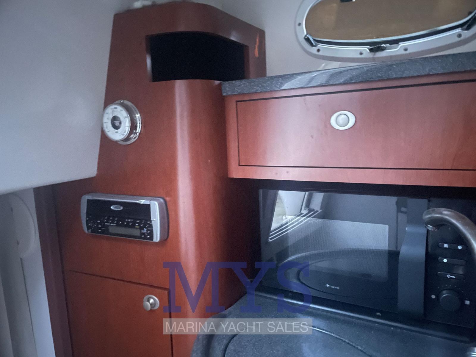 The Boston Whaler 305 Conquest boasts an impressive cockpit space, perfect for fishing or short cruises. The 305's hull design combines fast planing capabilities with a smooth, dry ride. The helm deck area is elevated for superior visibility fore and stern, with a sofa on the port side to relax while quietly watching the sea. The fully adjustable helm seat features a folding cushion that converts it into a padded seat for standing operation. The recessed bow walkaround provides safer access to the anchor locker and bow area. The cabin interior is warm and inviting, thanks to rich amenities including cherry wood furniture, granite-colored countertops and vinyl, and decorative accents.
