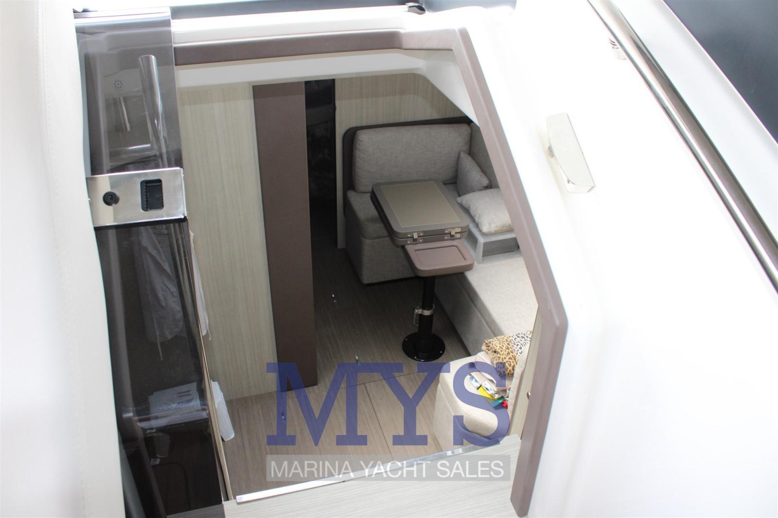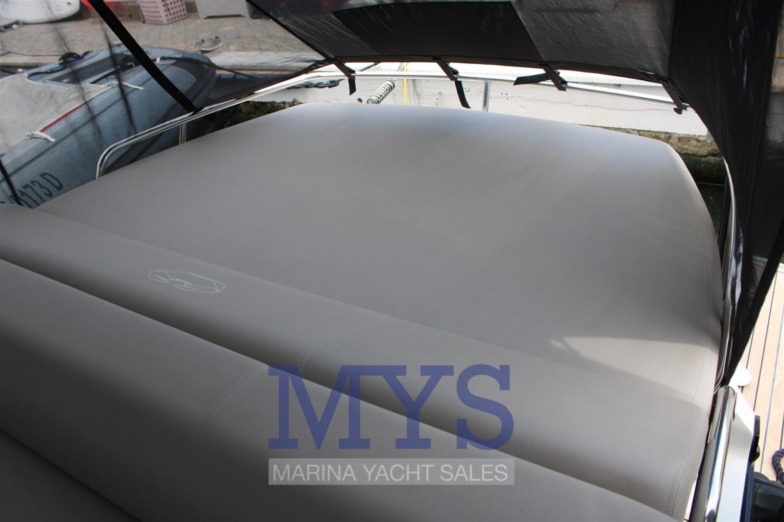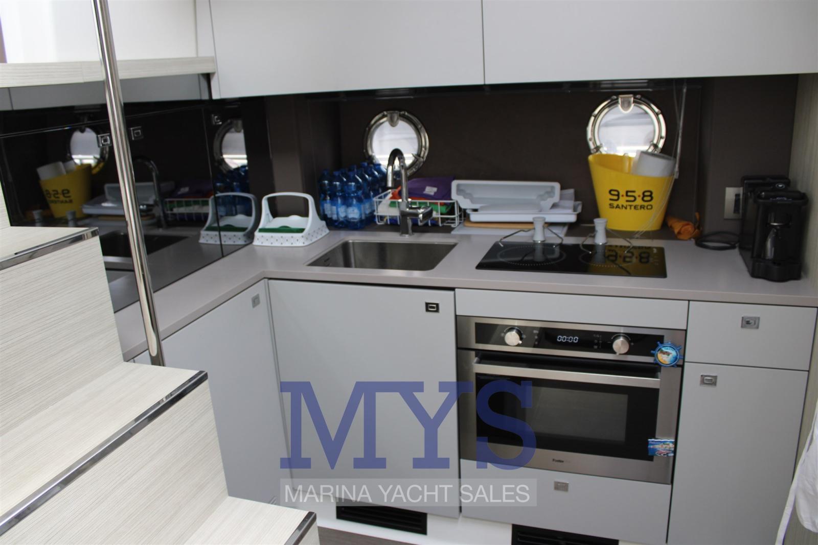 Engine Alarm, Alternator, Water pressure pump, Teak Side Decks, Deck Shower, Directional Spotlight, Hydraulic Flaps, Tender Garage, Hard top, Fire Extinguishing System, Flaps Indicators, Washbasin in the cockpit, Courtesy Lights, Underwater lights, Gangway (SCOMPARSA), Platform, Automatic Bilge Pump, Teak Cockpit, Shorepower connector, Water harbor connector system, Electric Windlass, swimming ladder, cockpit table.