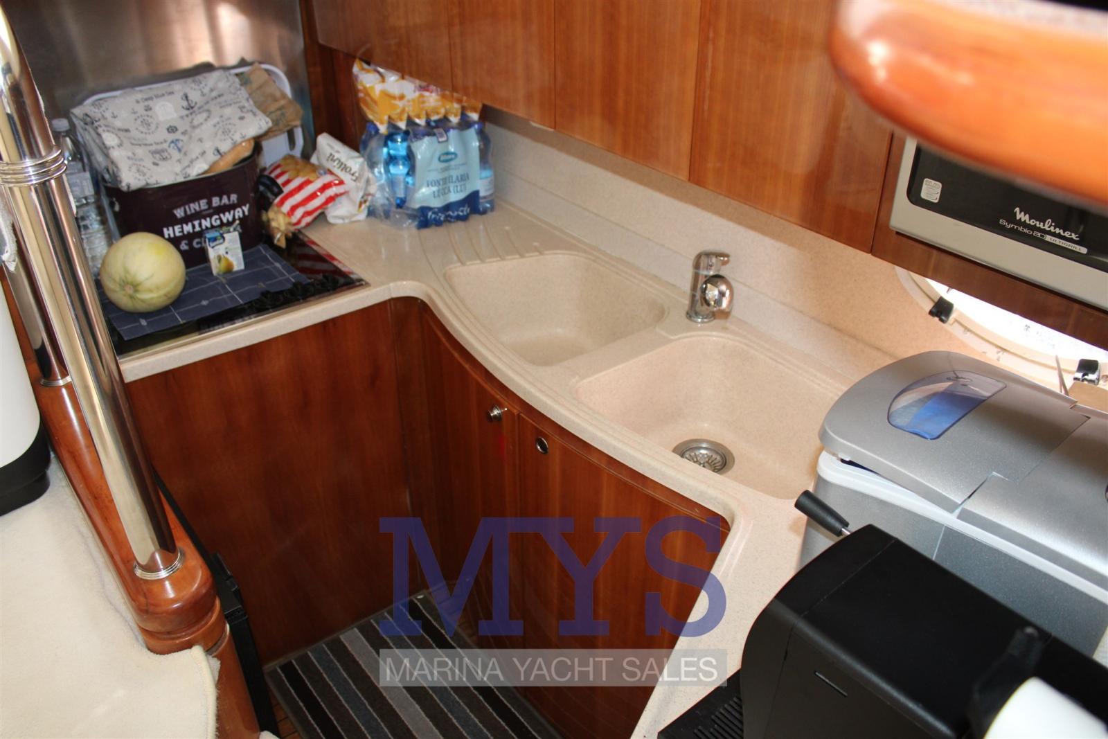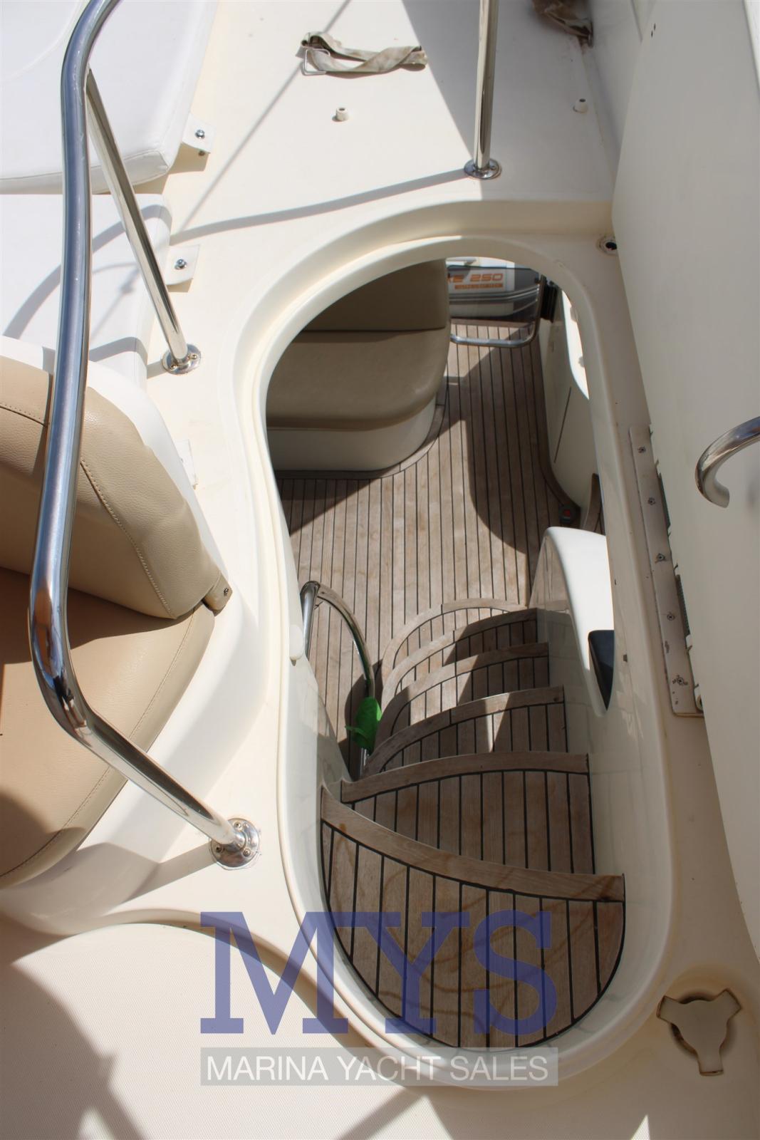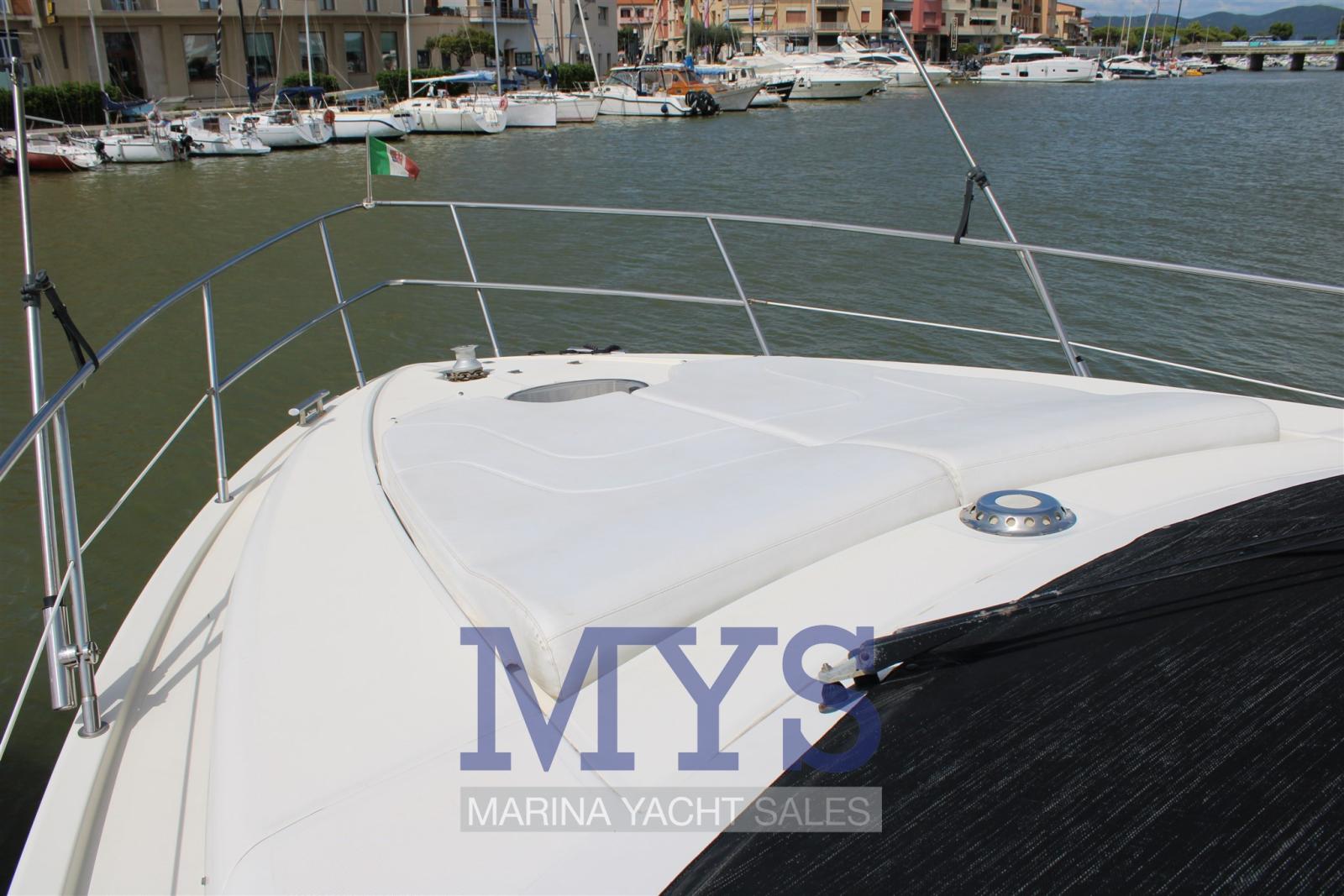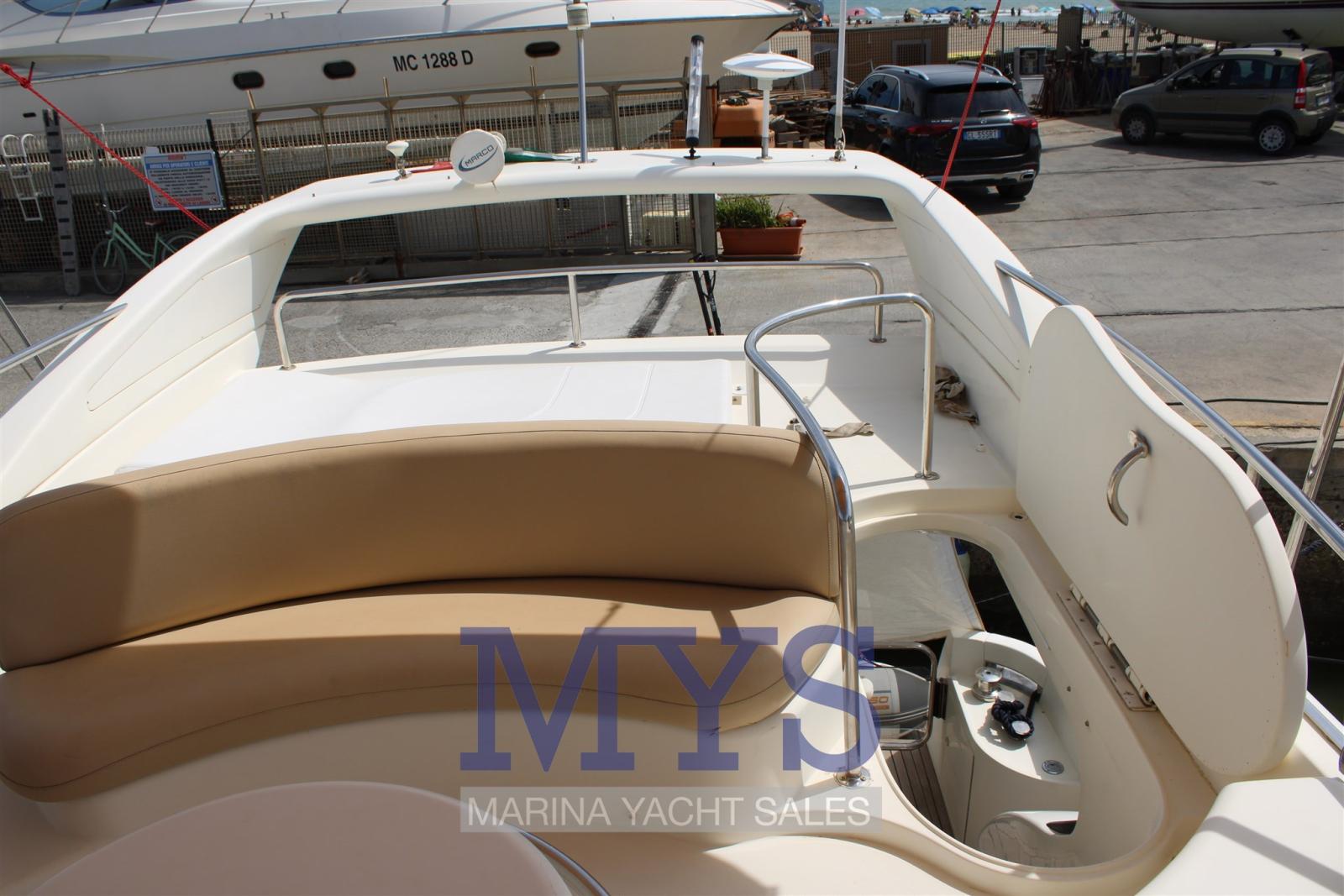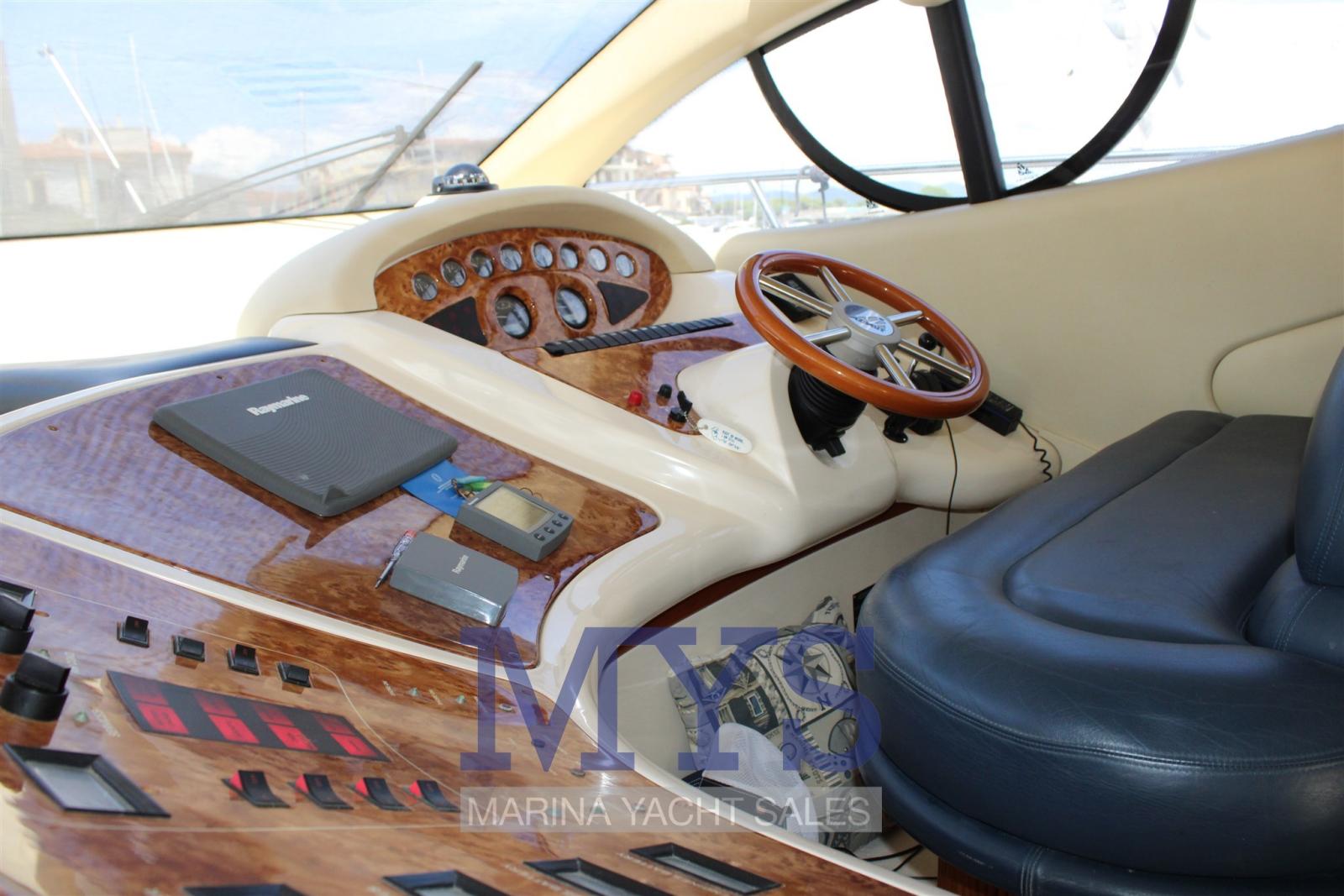 Engine Alarm, Alternator, Water pressure pump, Deck Shower, Twin Steering, Directional Spotlight, Hydraulic Flaps, Fire Extinguishing System, Flaps Indicators, Courtesy Lights, Underwater lights, Gangway, Platform, Automatic Bilge Pump, Entry door, Teak Cockpit, Shorepower connector, Water harbor connector system, Electronic instrumentation repeater, Rollbar, Electric Windlass, swimming ladder, Saddles for tender, Horn, Stern Winches.