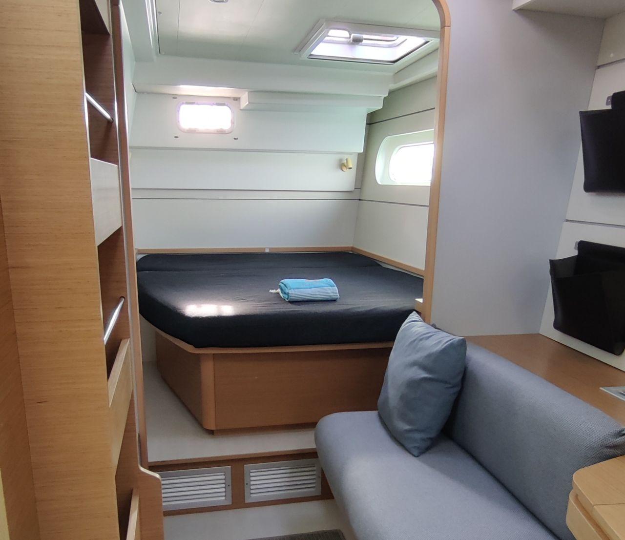 One aft double bed with wardrobe, chest under the bunk and storage space