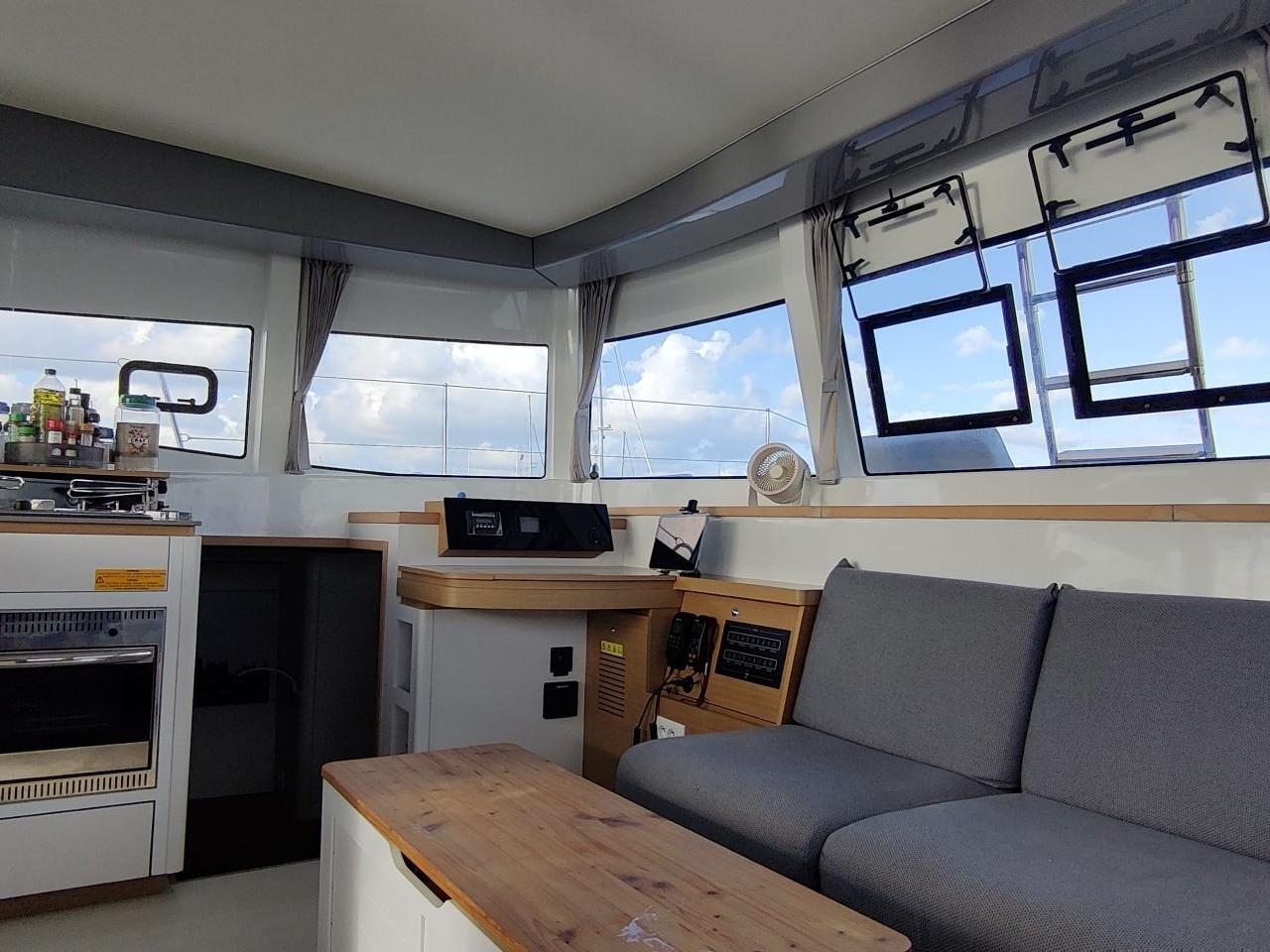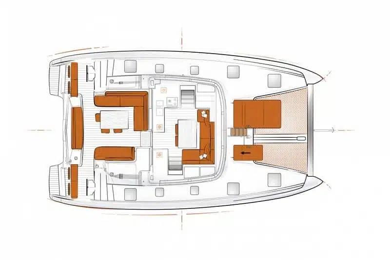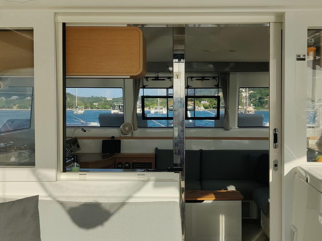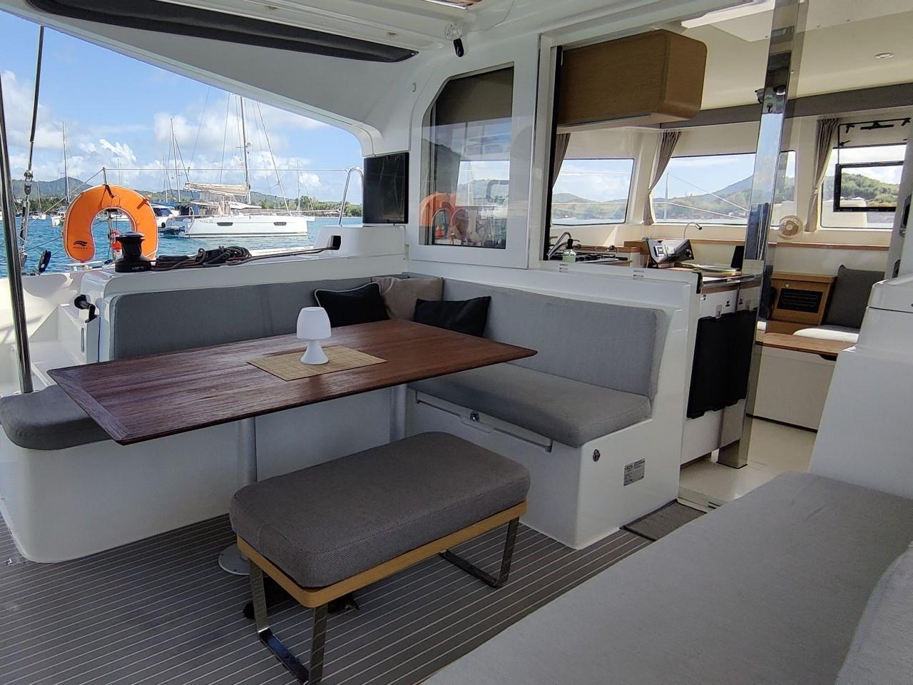 Outside saloon with L-shaped bench seat on the port side and cockpit table