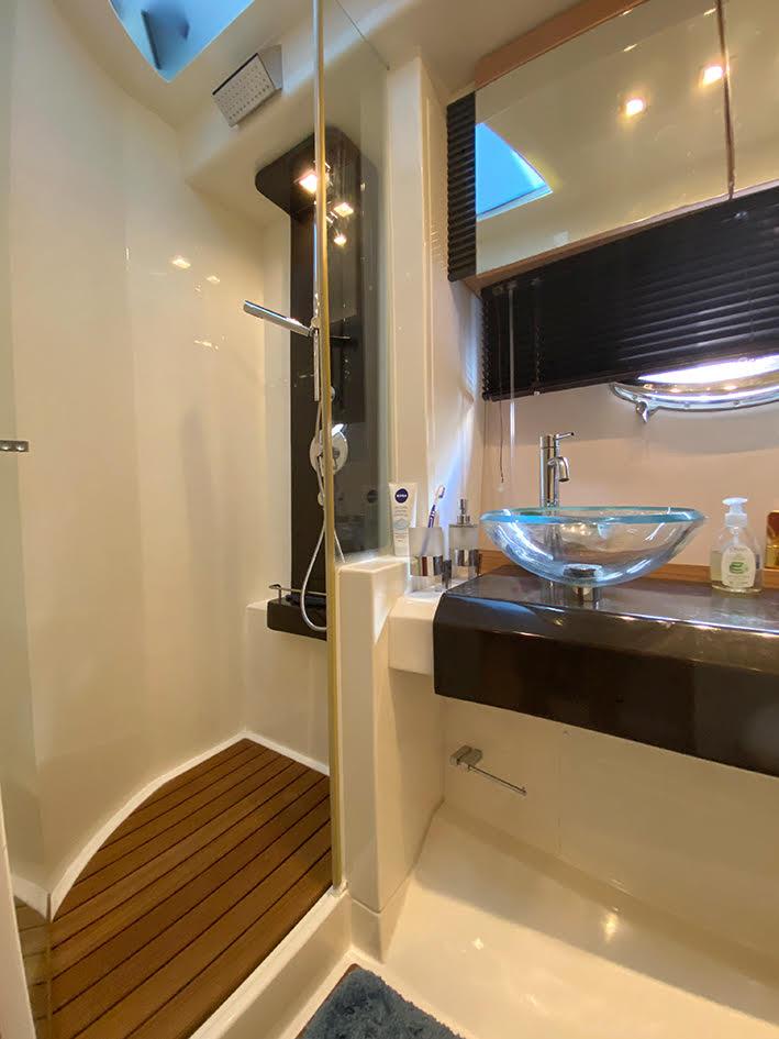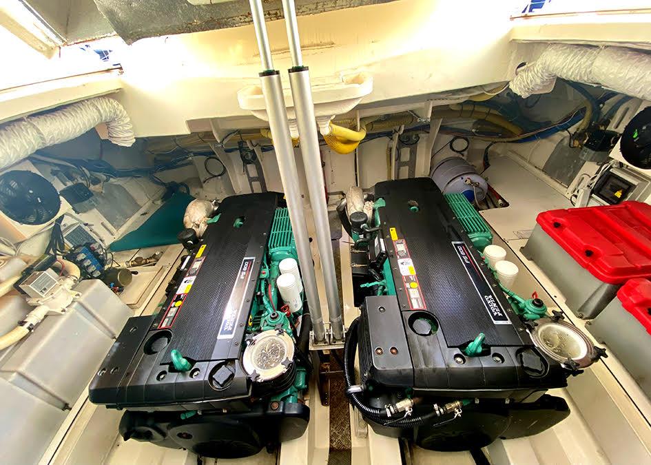 Powered by two 435 hp Volvo IPS 600 engines with joystick control and bow thruster, it offers smooth, quiet cruising and easy docking.