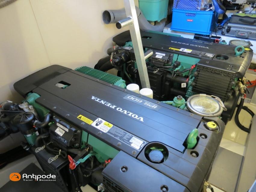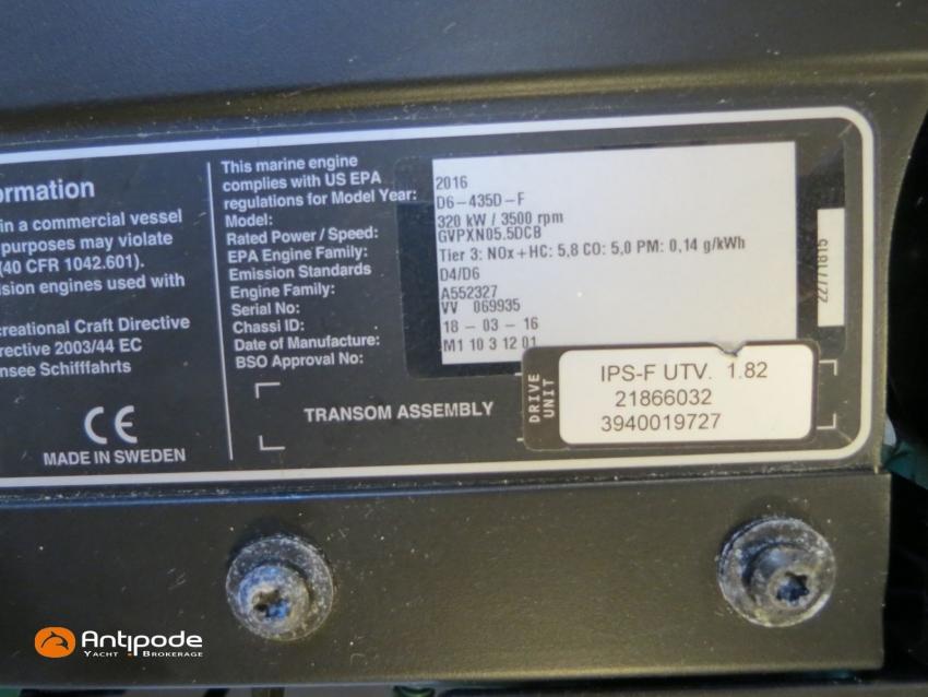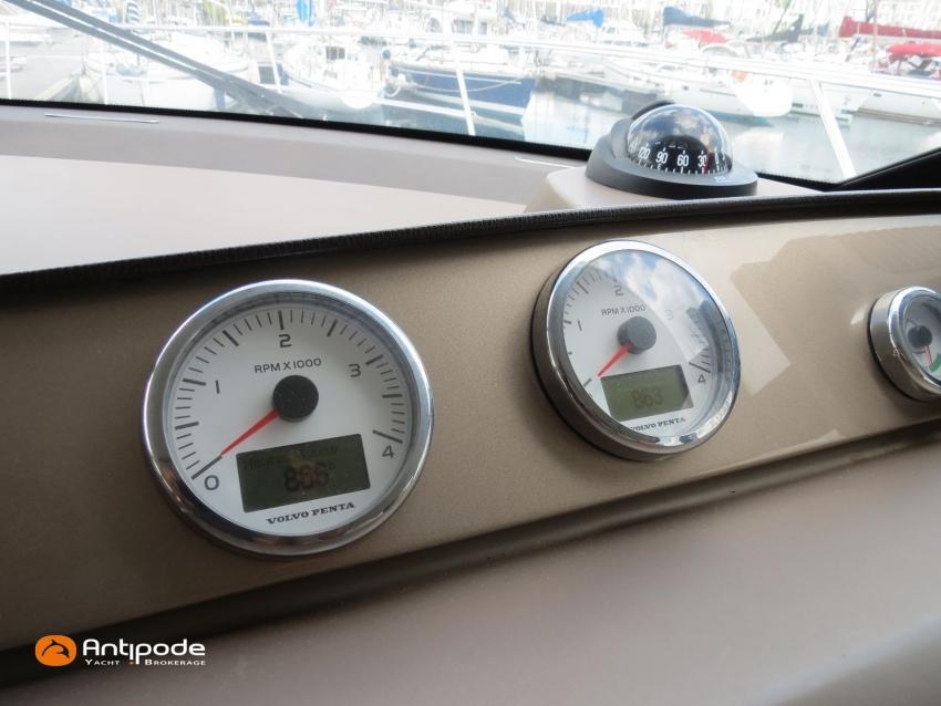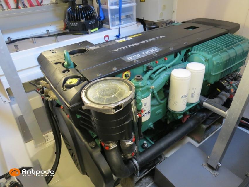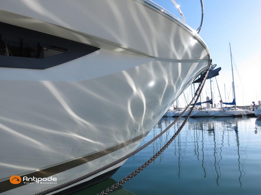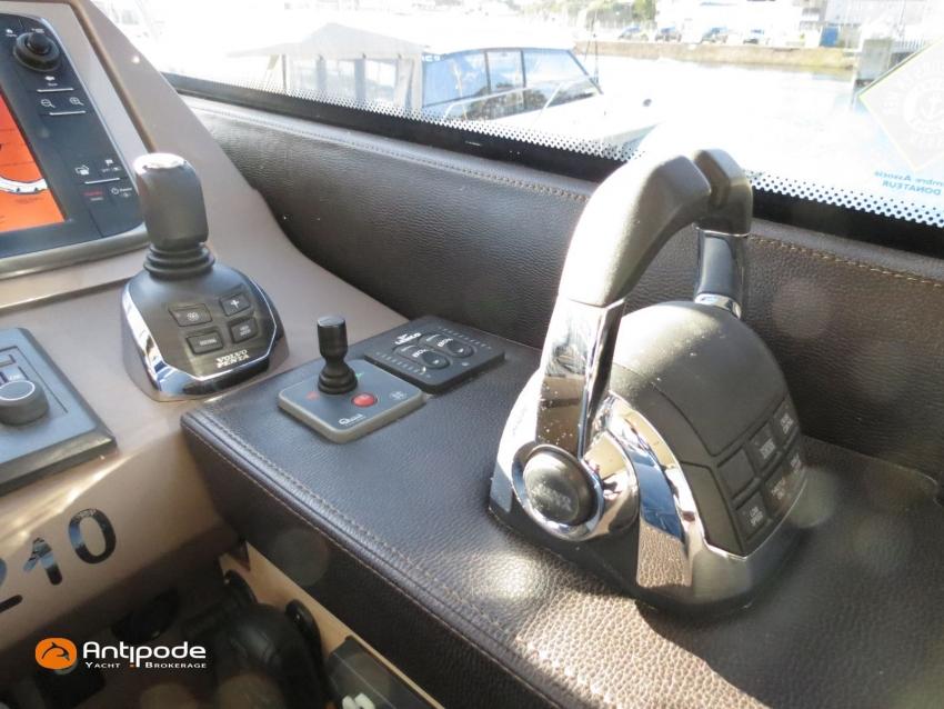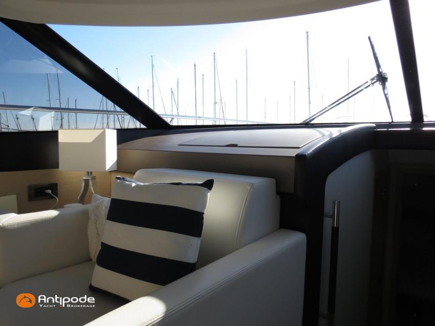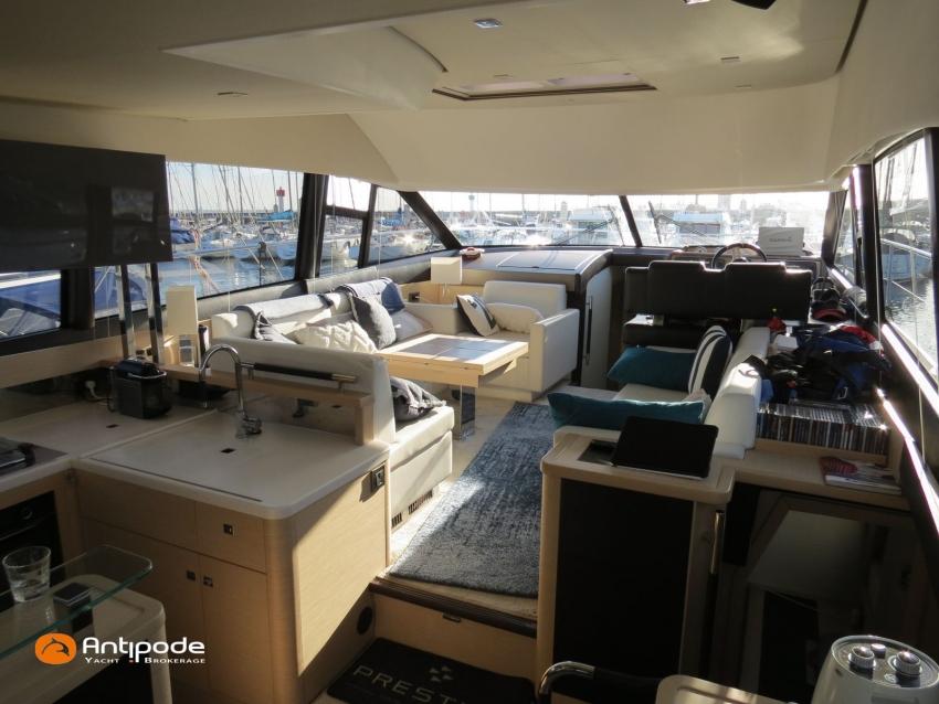 PRESTIGE 500 FLY, 2017, second hand, never chartered, owner boat, VOLVO IPS 600, 435 x2 hp (866 hrs), Bow thruster, Interior layout version 1 forward cabin, 2 aft cabins, Crew cabin , 2 heads (toilets + shower), Oak interior woodwork, Leather saloon upholstery, Electric Saloon table , Teak slatted cockpit floor, Teak cockpit table, Cockpit chain counter, Stanless dinghy berth, Hydrolic platform, Flying bridge, Flying bridge bimini top, Full cockpit enclosure - 2023, Raymarine in board autopilot, 2x GPS and chartplotter (pilot station) - Raymarine, GPS and chartplotter (Flybridge) - Raymarine, Radar with radome, Lenco trim tabs, FUSION system in all cabines, 2 burners cooker (GAZ), Flybridge and cockpit plancha, Micro wave owne 220 V + Grill, Underwater lighting, Aft camera - Raymarine, Electric winch (capstan), Heating system EBERSPACER, Generator 220 V - ONAN , services invoices available, Located Brittany. For more information or to make an appointment for a visit, contact : François Mouchel 06 62 30 97 30 - francois@antipode-yachts.com