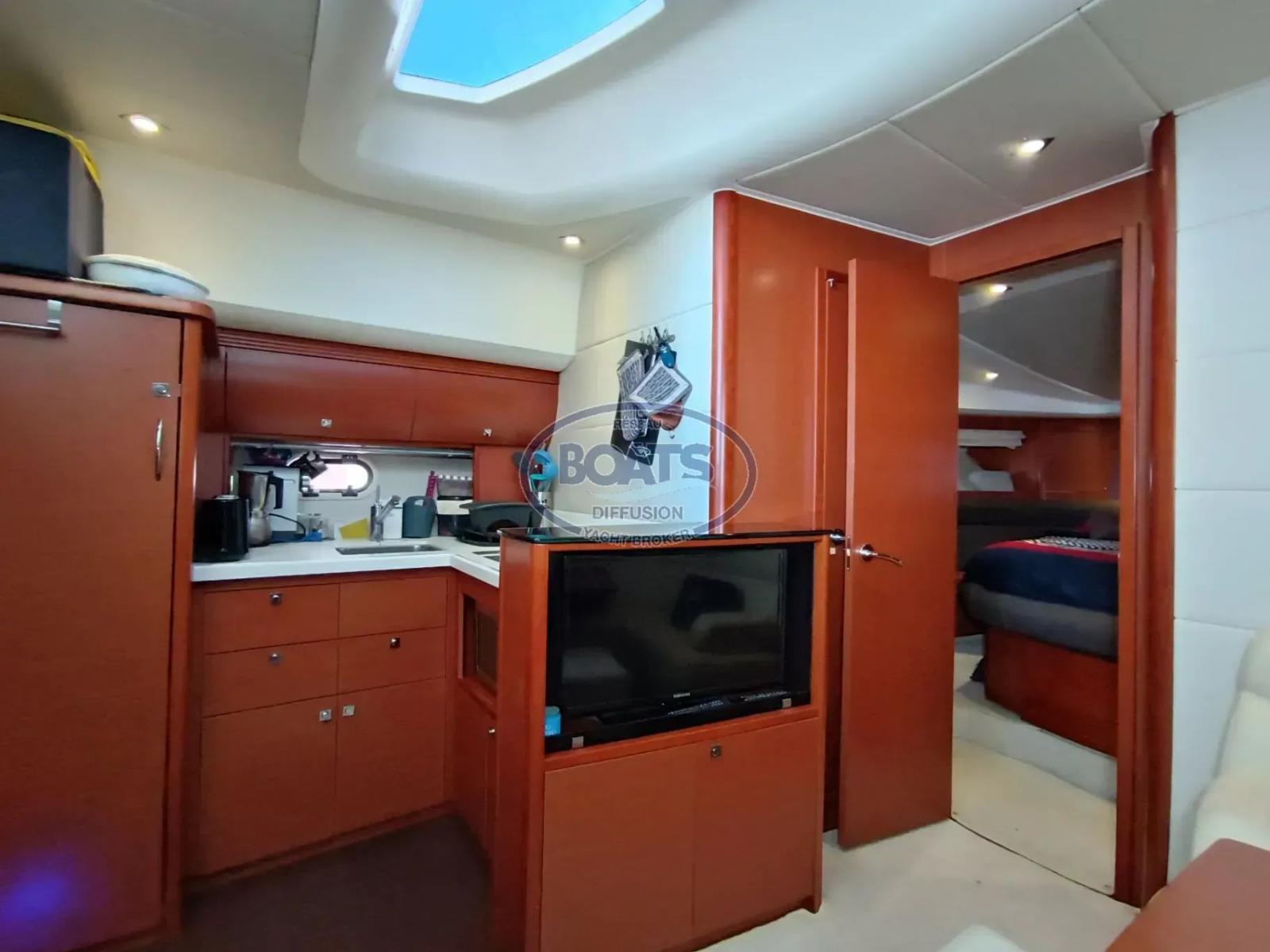 2 cabins + 2 shower/WC + square living room fitted kitchen. 1 large cockpit with indoor and outdoor lounge. + Garage.