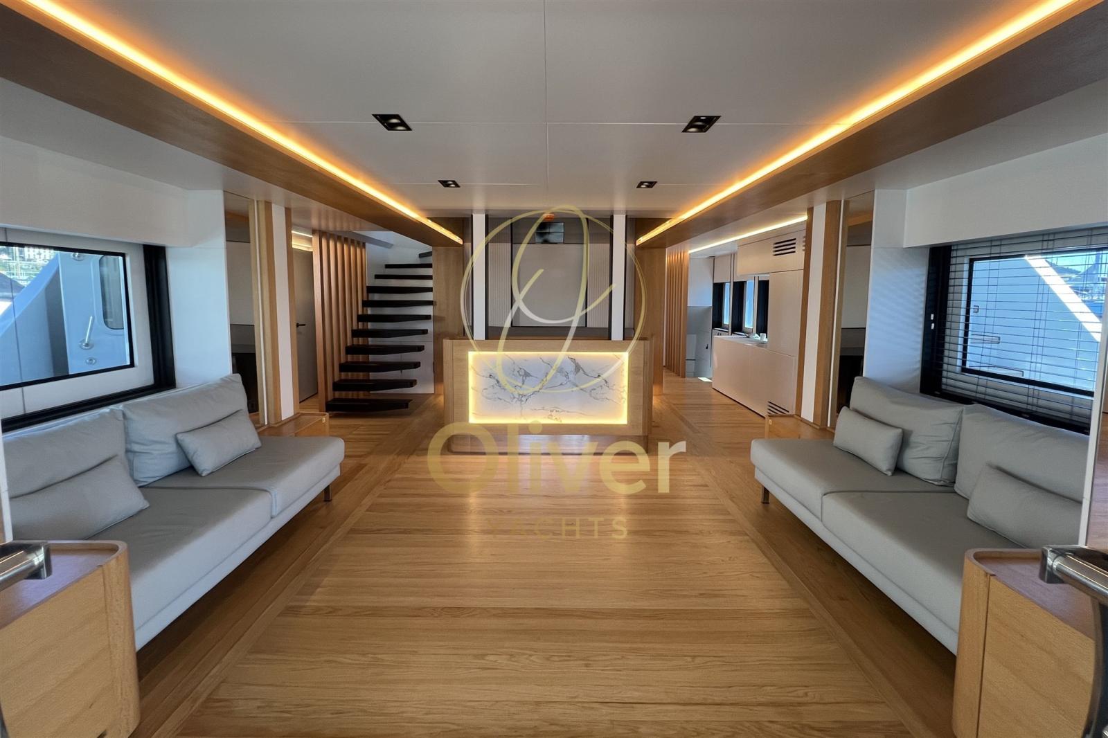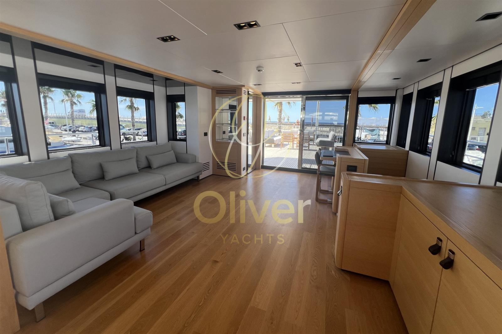 The main living area is spread over the main deck with a large open plan saloon, which includes a living area with deep sofas, dining table and a large separable equipped kitchen. The interior design is modular and suitable for both family and luxury charter life.