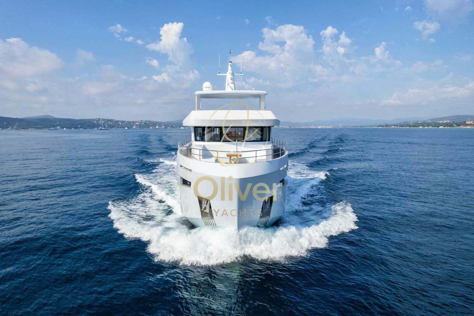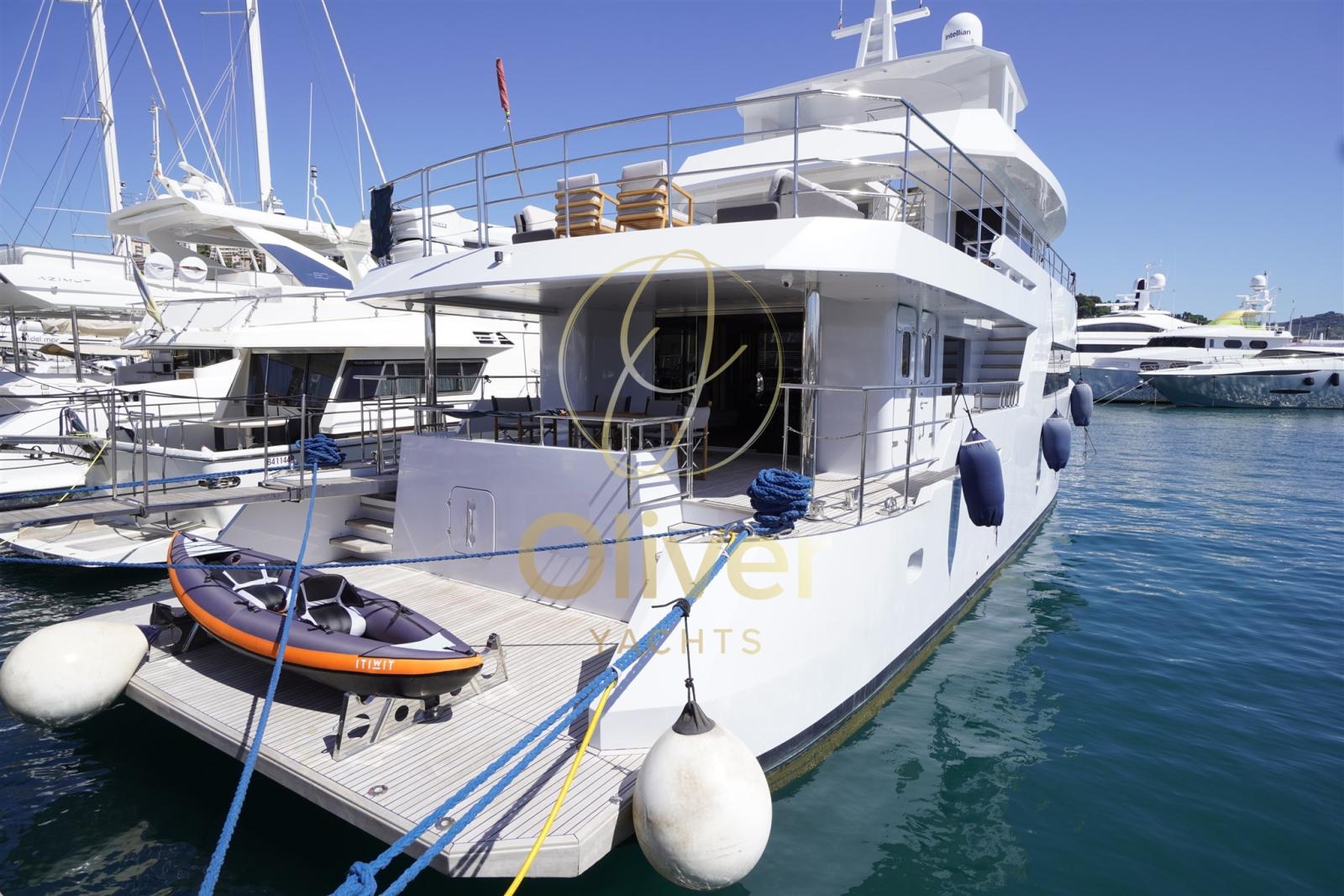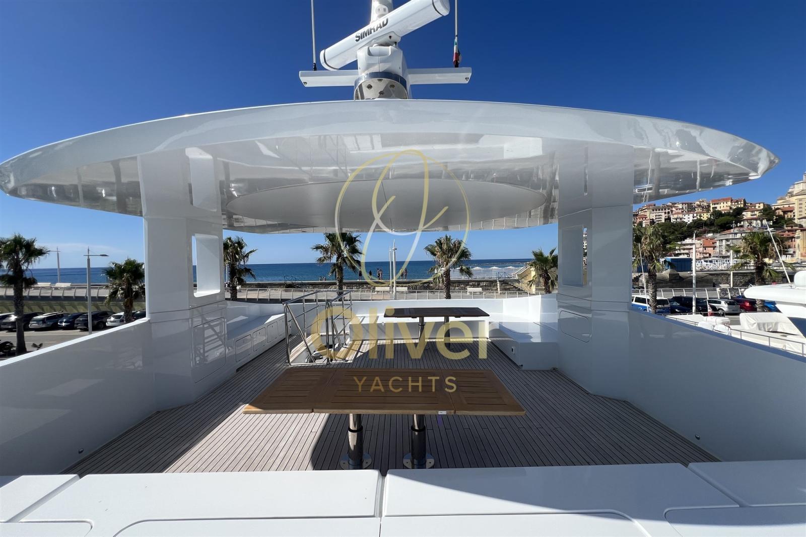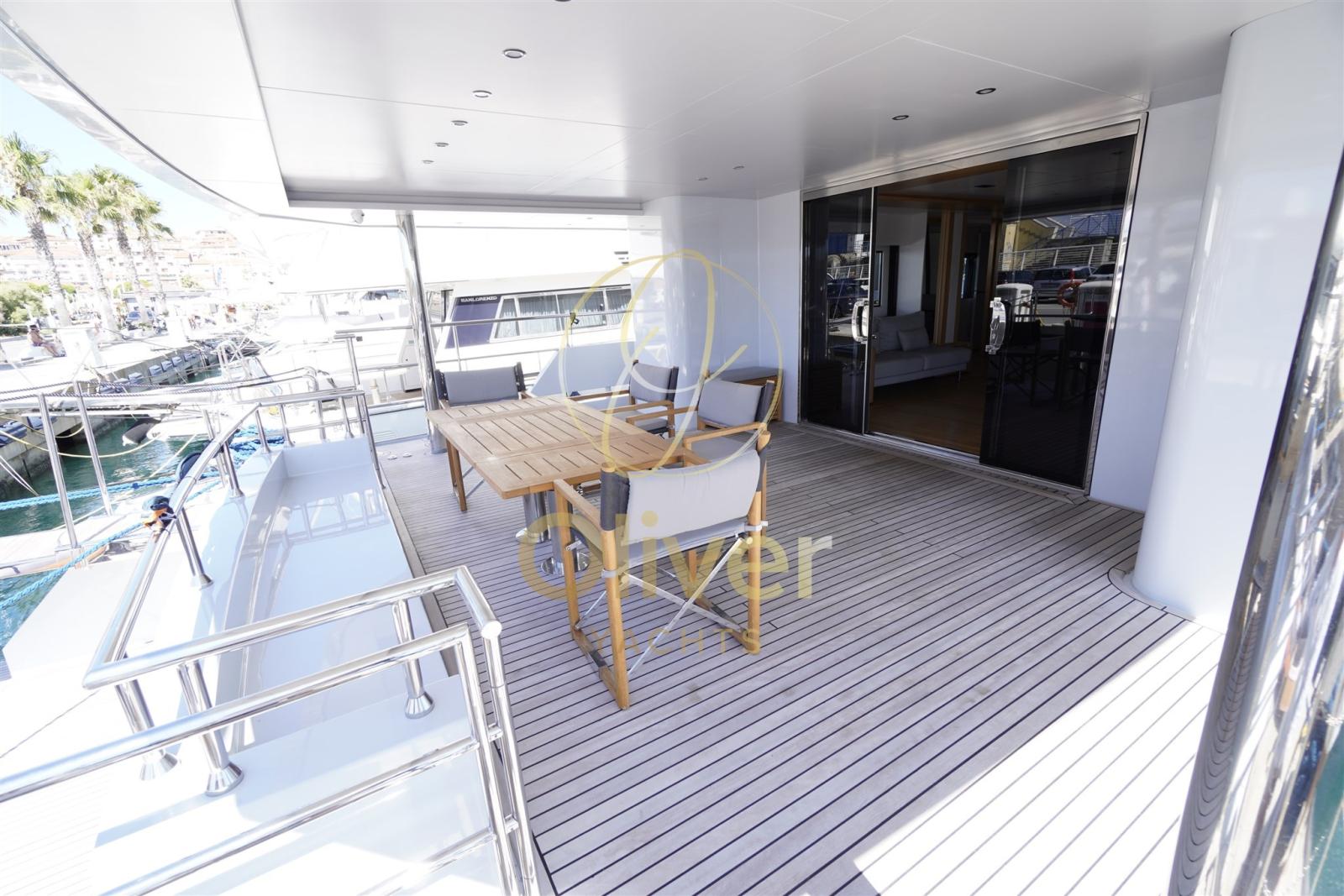 Fume/Gas Detector, Engine Alarm, Bilge Alarm, Alternator, 2 Anchor (100 KG HHP HULL TYPE), Water pressure pump, 10 Batteries, Folding cleats, Teak Side Decks, Deck Shower, Stern Thruster (29 KW), Bow Thruster (29 KW), Headlights fixed on the stem, Directional Spotlight, Hydraulic Flaps, Tender Crane, Davits for tender on fly, Hard top, Fire Extinguishing System, Compressor Air System, Anchor Chain Washdown, Washbasin in the cockpit, Courtesy Lights, Underwater lights, Gangway, Platform, Automatic Bilge Pump, Manual Bilge Pump, Teak deck, Entry door, Side door, Teak Cockpit, Shorepower connector, Water harbor connector system, Voltage Rectifier, 2 Hydraulic Windlass (DZC), swimming ladder, Saddles for tender, Waste Water Purifier System, Stabilizers (SIDE-POWER SPS94B VF1350 1,4), cockpit table, Tender, guard rails with gates, Horn, T-Top, Stern Winches, Bow Winches.