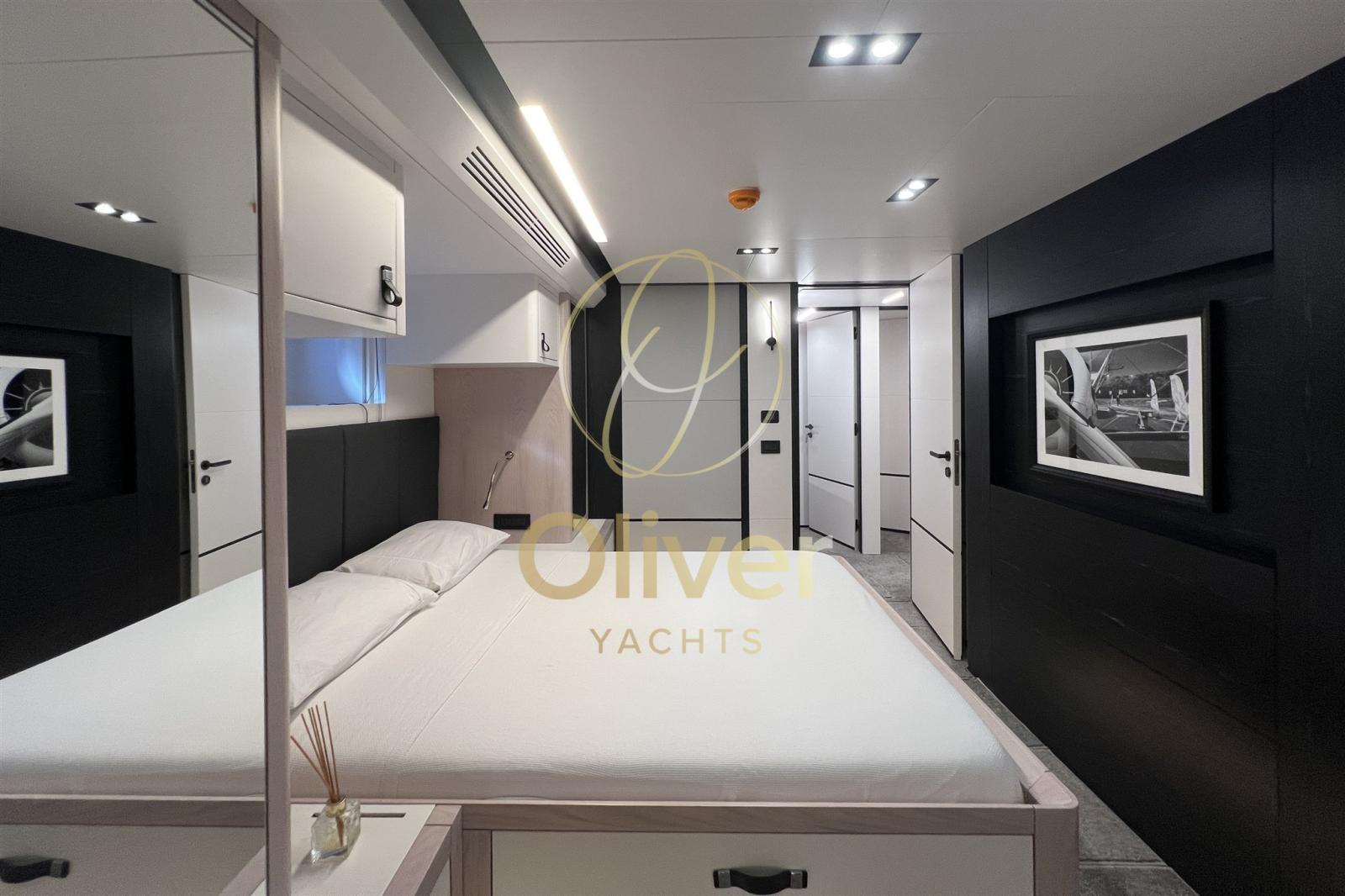 The layout includes up to 5 cabins for a total of 10 guests, including a large full beam master cabin on the main deck with en-suite bathroom, a VIP cabin in the bow, two doubles, a twin with crossed beds. All cabins are equipped with air-conditioned toilets, large wardrobes, TV and finishes with attention to detail.