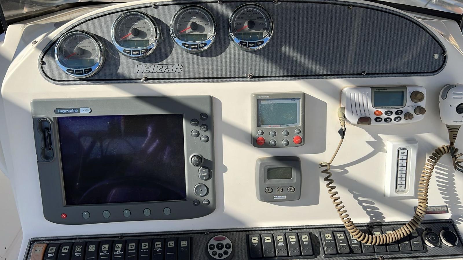 Chain counter, Autopilot (Raymarine), Plotter with GPS antenna (Raymarine), VHF Radio (Raymarine).