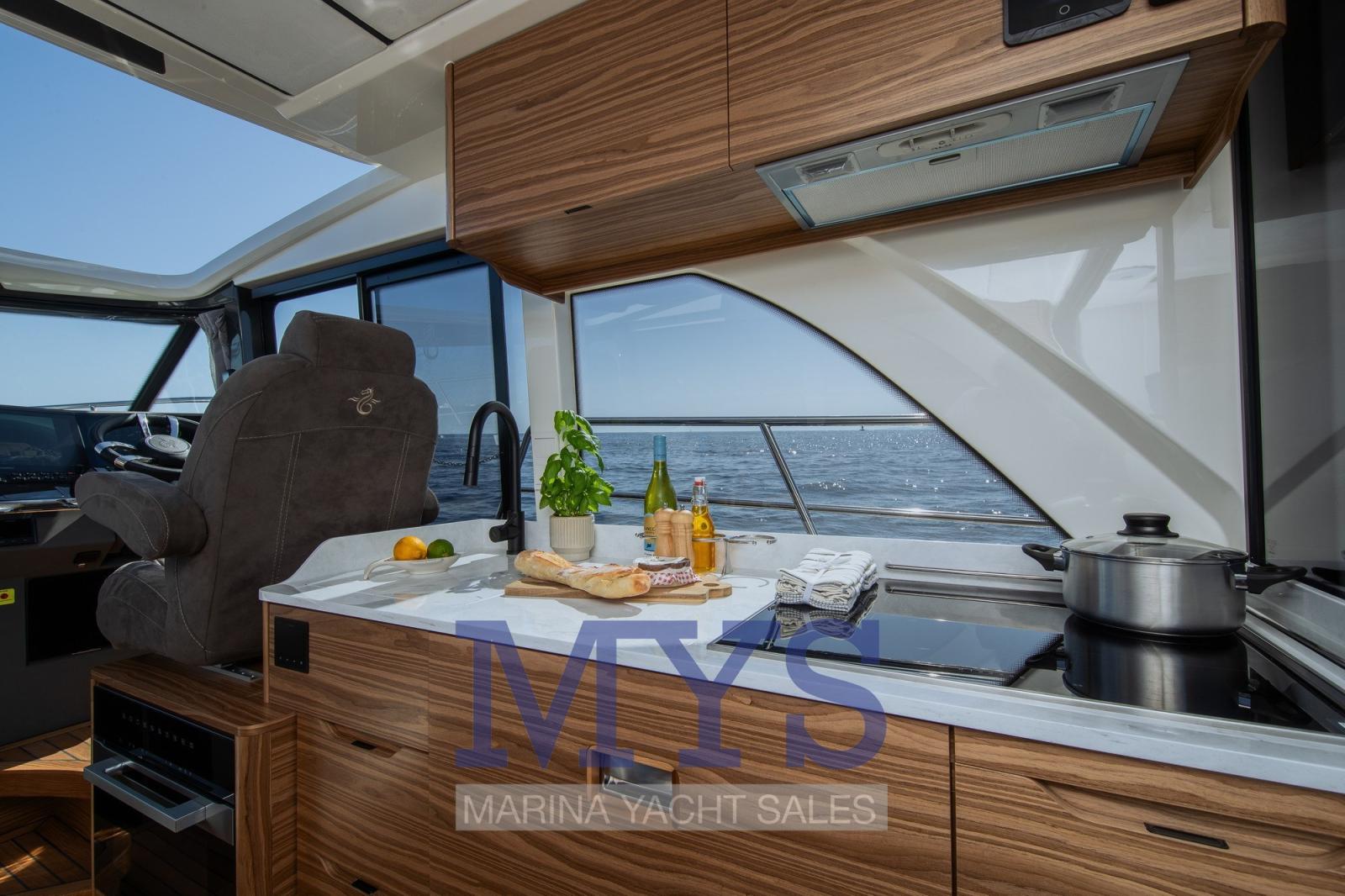 Galley on the main deck on the right side complete with sink, fridge and oven