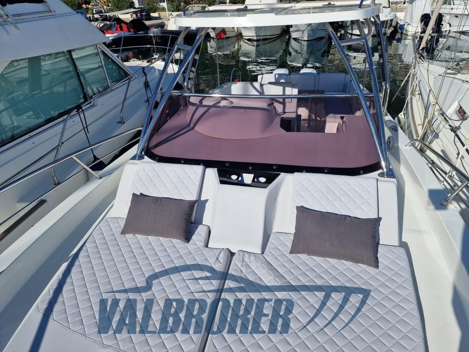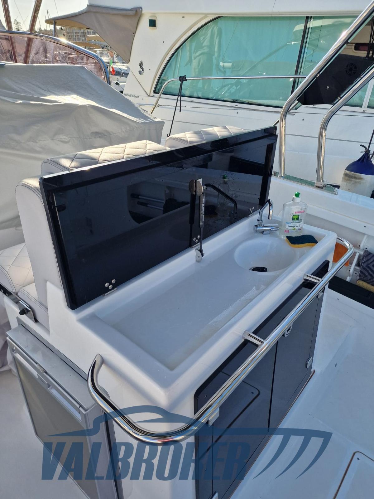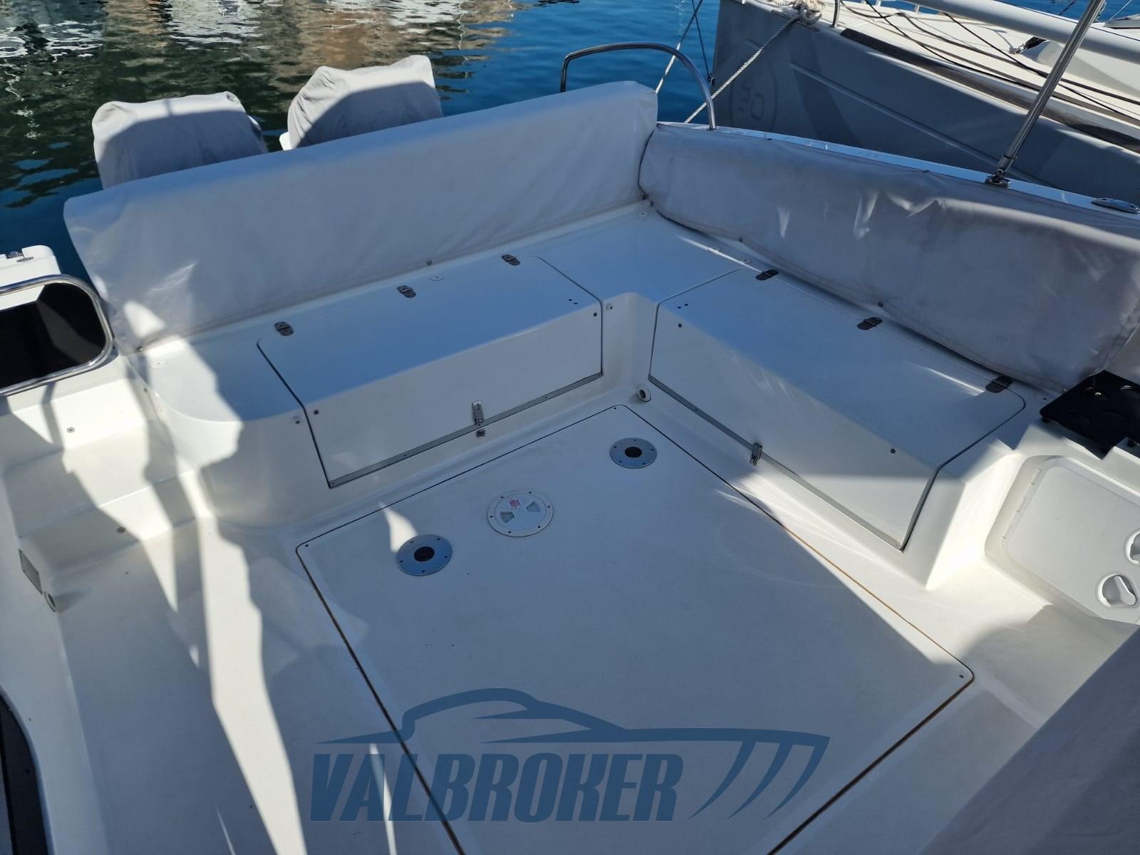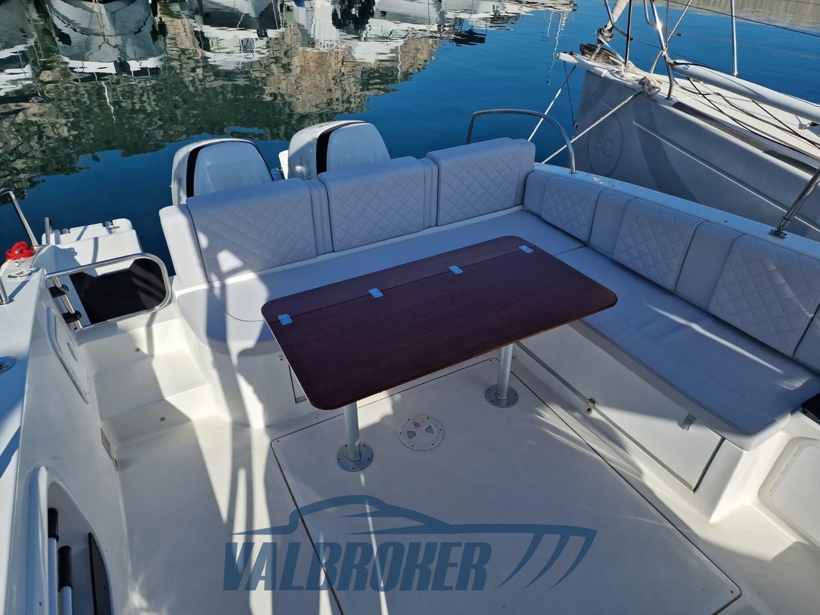 Walkaround with a modern design and optimized layout. Boat with spacious cockpit and space below deck. Powered by 2x Suzuki DF 300 V6. The engines are under warranty until July 2026. Single owner.