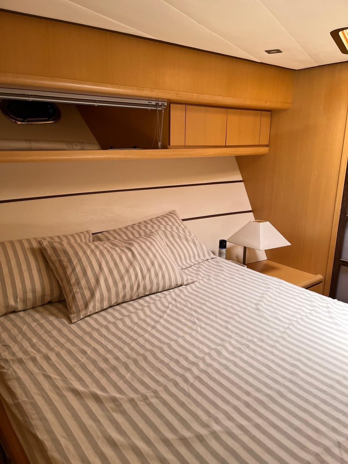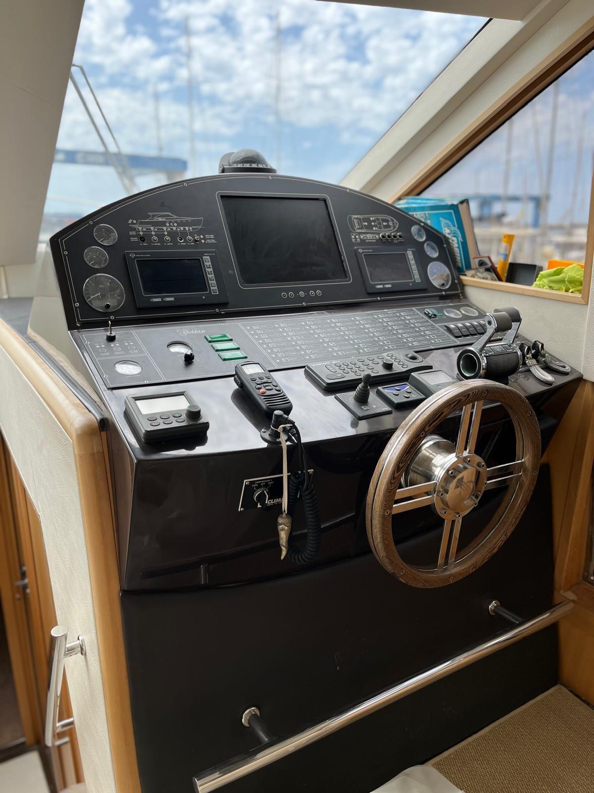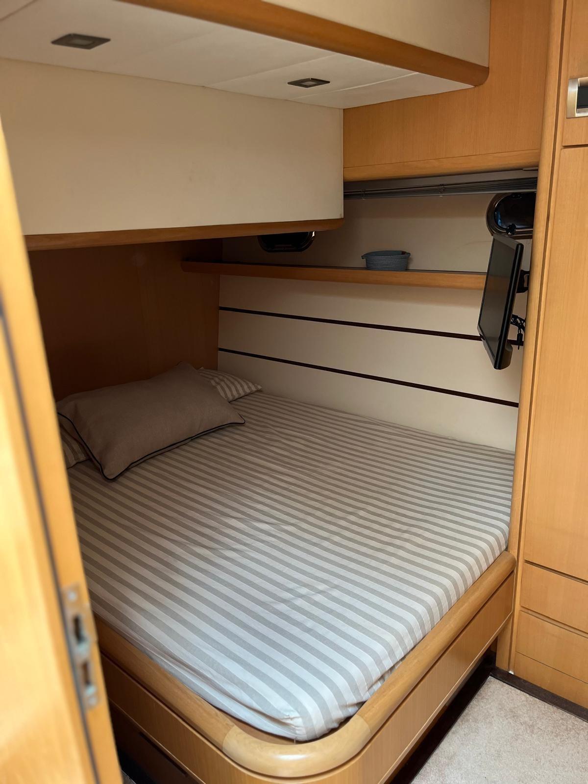 Electronic throttles, outdoor hot/cold shower, retractable bathing ladder, fiberglass flat keel tender with 6 HP outboard engine, air conditioning with fancoil in all rooms, 1 40'' TV in the dinette and 2 24'' TVs in the cabins, complete cushions with sunbathing awning in the cockpit, side covers, interceptors