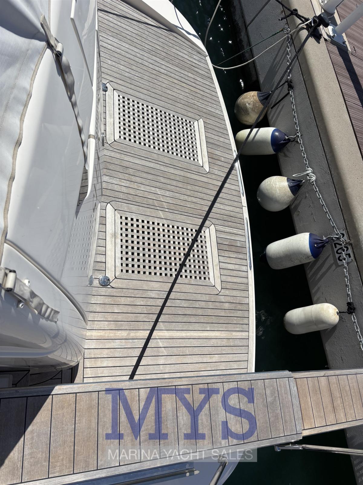 Engine Alarm, Alternator, Deck Suction of Dirty Water, Auto Dynamic Trim Interceptor, Water pressure pump, Teak Side Decks, Shore power cable, Guard rail, Deck Shower, Twin Steering, Directional Spotlight, Electric Flaps, Fire Extinguishing System, Flaps Indicators, Courtesy Lights, Underwater lights, Fenders, Gangway, Platform, Automatic Bilge Pump, Entry door, Teak Cockpit, Shorepower connector, Electronic instrumentation repeater, Rollbar, Electric Windlass, swimming ladder, cockpit table, Living Room Foldable Table, Horn, Stern Winches.