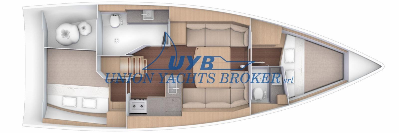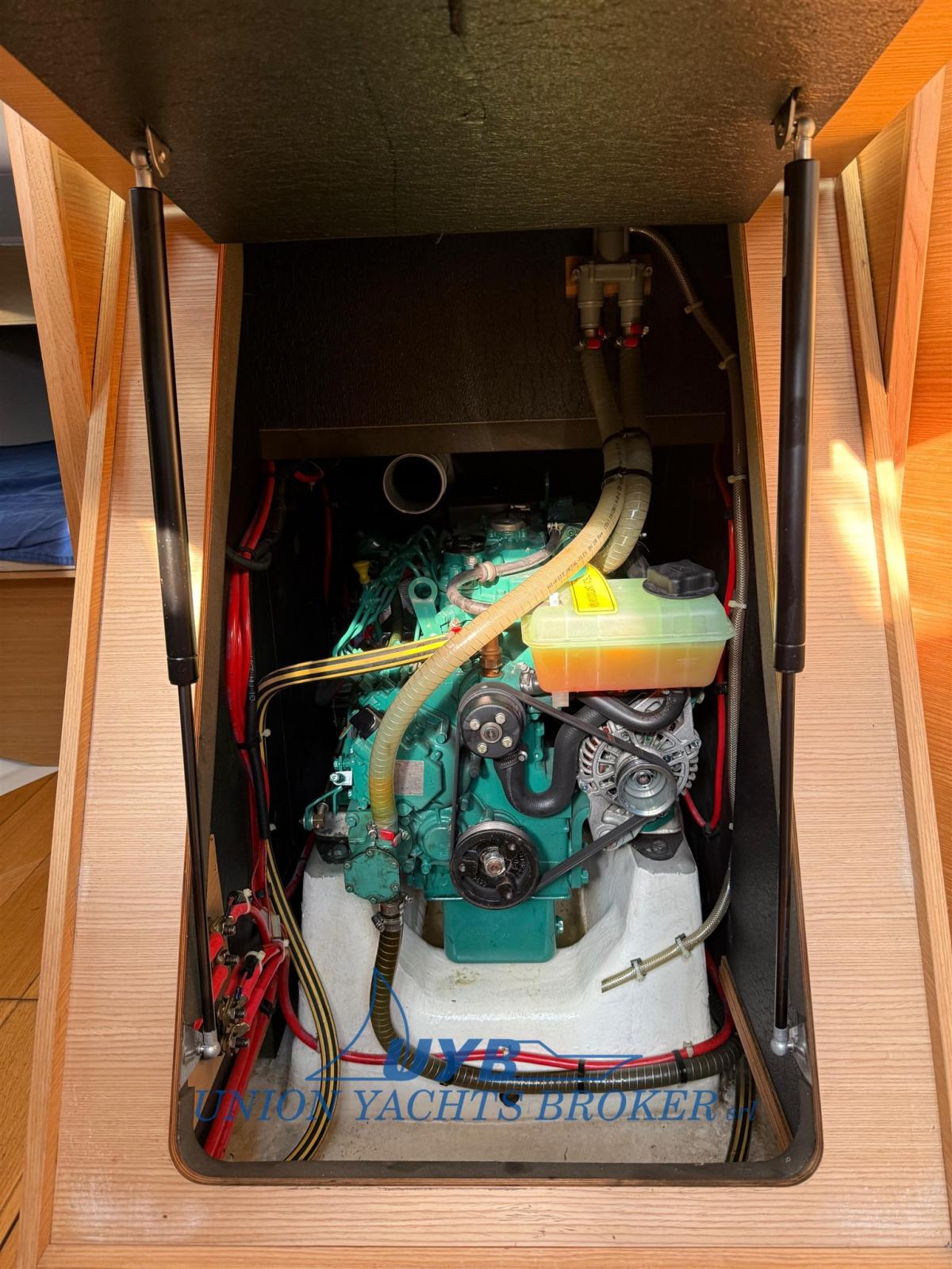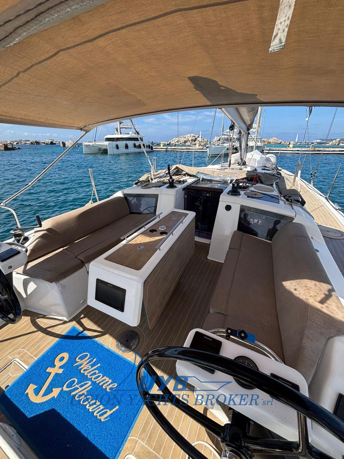 Batteries (+ batteria supplementare per servizi), Battery charger (25A), Deck Shower (calda/fredda), Twin Steering (timoni rivestiti in pelle), Bow Thruster (retraibile), Teak Cockpit, Shorepower connector, Water harbor connector system, Electric Windlass (700W), swimming ladder, Outboard Engine Support Bracket, cockpit table, 2 Winch (AR T40 per scotta randa, genoa e gennaker), Winch Electric (T40).