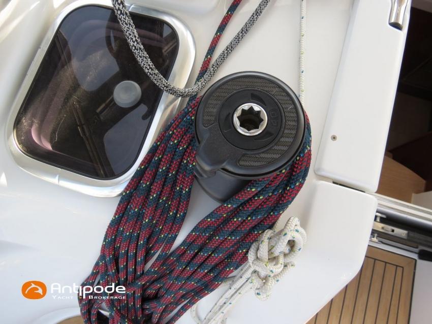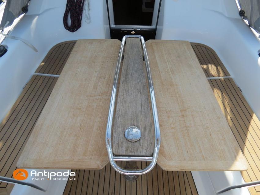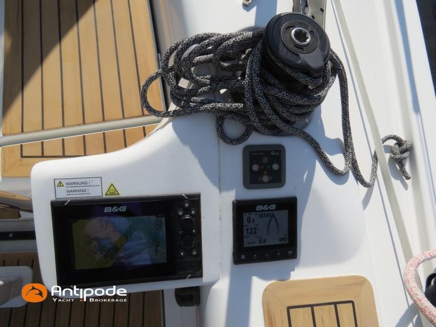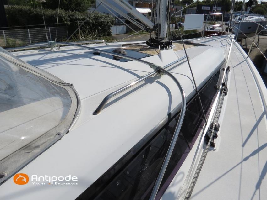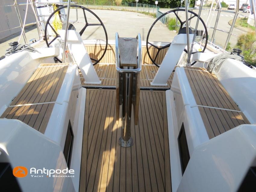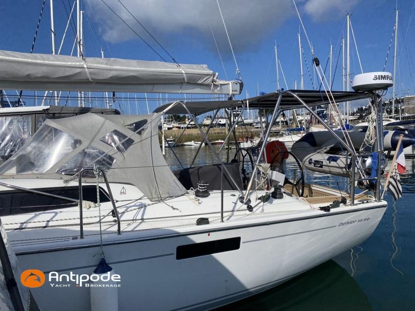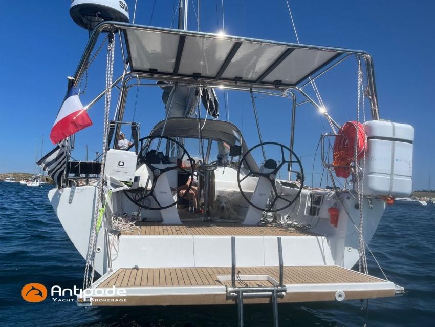 DEHLER 38 SQ, 2021, VOLVO D2-40, 40 hp (346 hrs), Bow thruster, Interior layout version 1 forward cabin, 2 aft cabins, 2 cockpit primary genoa winches - Lewmar 46ST, 2 cockpit mainsail sheet winches - Lewmar 40ST, 2 roof winches for adjustment and sail handling (1 electrical) - Lewmar 40ST, bowsprit, Stern pulpit deck support, Flexyteek top roof, Flexyteek slatted cockpit floor, Flexyteek cockpit seats, Flexyteek covered removable bathing platform, Removable cleats, Stainless steel bow & bowsprit protection, Cockpit table (wood) with 2 folding leaves, Twin steering composite wheels, Cockpit sprayhood, Cockpit bimini top, Electric windlass - Quick 800W, Aft cockpit roll bar & davits, Opening life lines, Gangway, Outboard engine bracket, Full cockpit enclosure, Keel stepped aluminium classic mast and boom - Selden, Rod standing rigging, Square top full batten main sail - Quantum, Main sail lazy bag, Main sail lazy jacks, Genoa roller furling with above deck drum - Furlex 204S, Furling genoa - Quantum, Furling staysail (never used) & Facnor FX+1500 furler, Twin adjustable backstays, In board autopilot - B&G, Navigation system - B&G, 3 x Cockpit repeaters, 2 x GPS and chartplotter (cockpit) (one per wheel station), Electronic navigation charts, Radar - Simrad, AIS Transponder CLASS B (emission and reception), DSC VHF + wireless unit - B&G V60, Fusion RA70N audio system + cockpit remote control + speakers, Fridge unit 12 V (top & front opening doors), Freezer 12 V, Lithium service batteries, 12 V to 220 V Inverter, Battery controller, Heating system EBERSPACHER, Holding tank, Solar panels - Solara 4 x 125W, Hot and cold cockpit shower, Sea water electrical pump in kitchen, Leds navigation lights, Leds interior lights, Liferaft (serviced in december 2025), 16kg delta anchor + 50m lenght of chain (2025) + rope, Fenders and warps, Dinghy (2.50m), 4 str 2.3Hp Honda outboard engine (2024), Located Brittany. For more information or to make an appointment for a visit, contact : Jean-Baptiste Lemaire +33 6 10 25 00 03 - jb@antipode-yachts.com