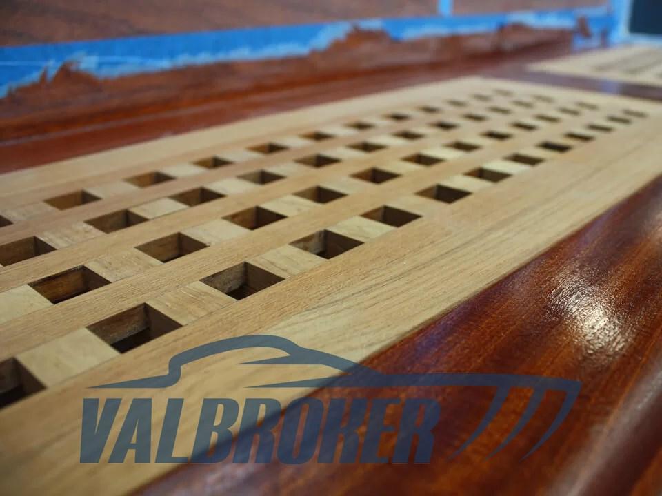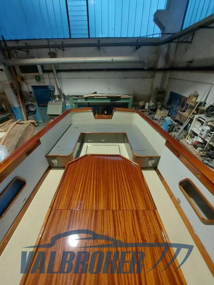 NEW BOAT. Poldo 23, the 70th Anniversary boat, built in mahogany, oak and iroko. Equipped with a diesel inboard engine and shaft line transmission. Large sundeck in the bow, the helm station with folding seat for standing driving, the central engine compartment, the aft seats with the 'U' shaped sofa and finally the swim platform with teak grating. The cushions of the forward sundeck hide a large locker for the storage of life jackets and equipment, which can become an emergency berth if necessary. It is accessed via two steps on the sides of the dashboard. The console is equipped with classic navigation instruments, including the tachometer, fuel level, oil pressure, digital hour meter. Two 80 Ah batteries each provide power for the motor and services.