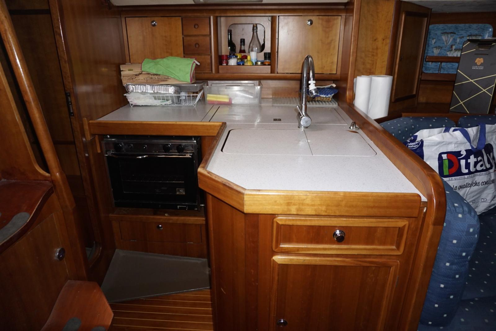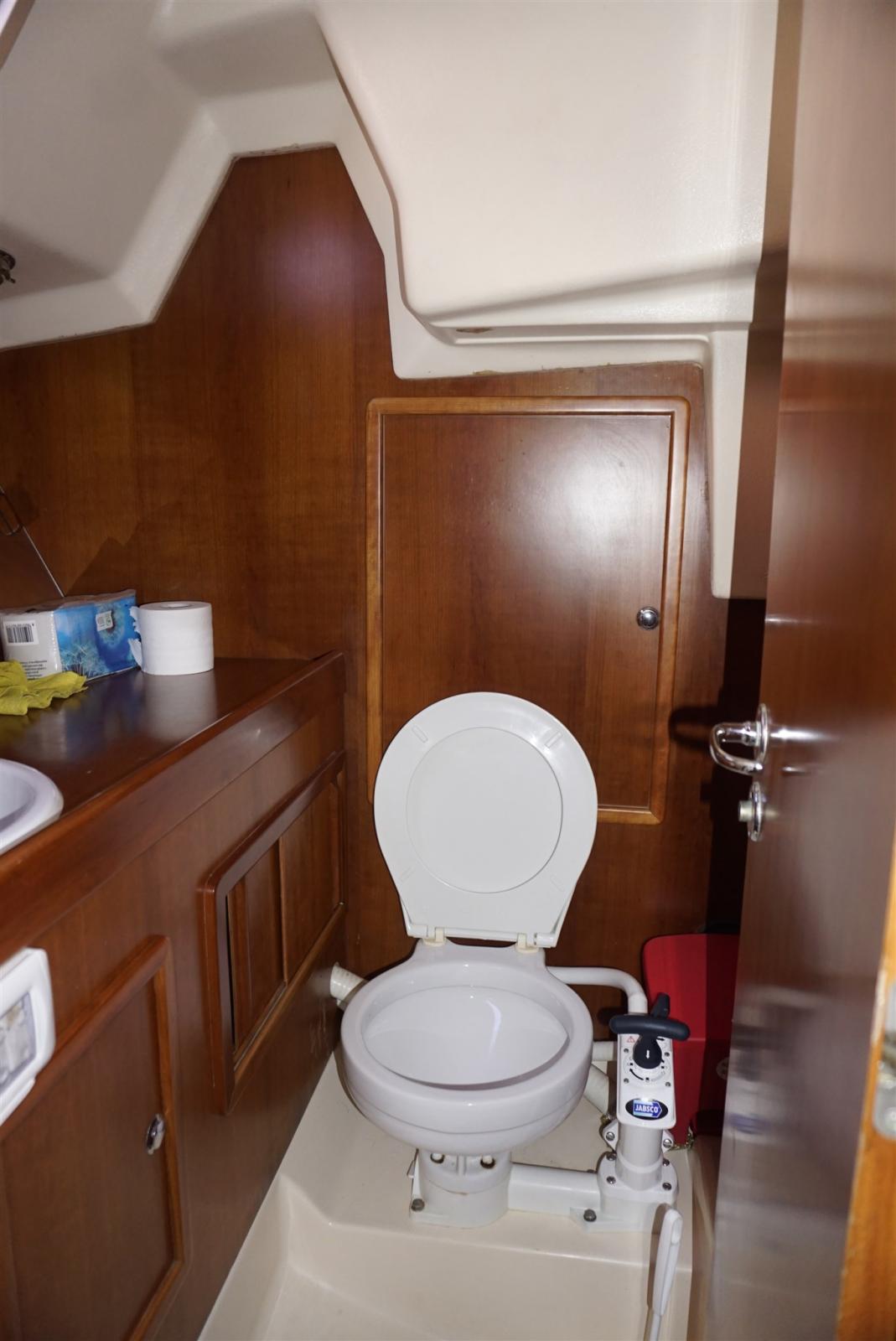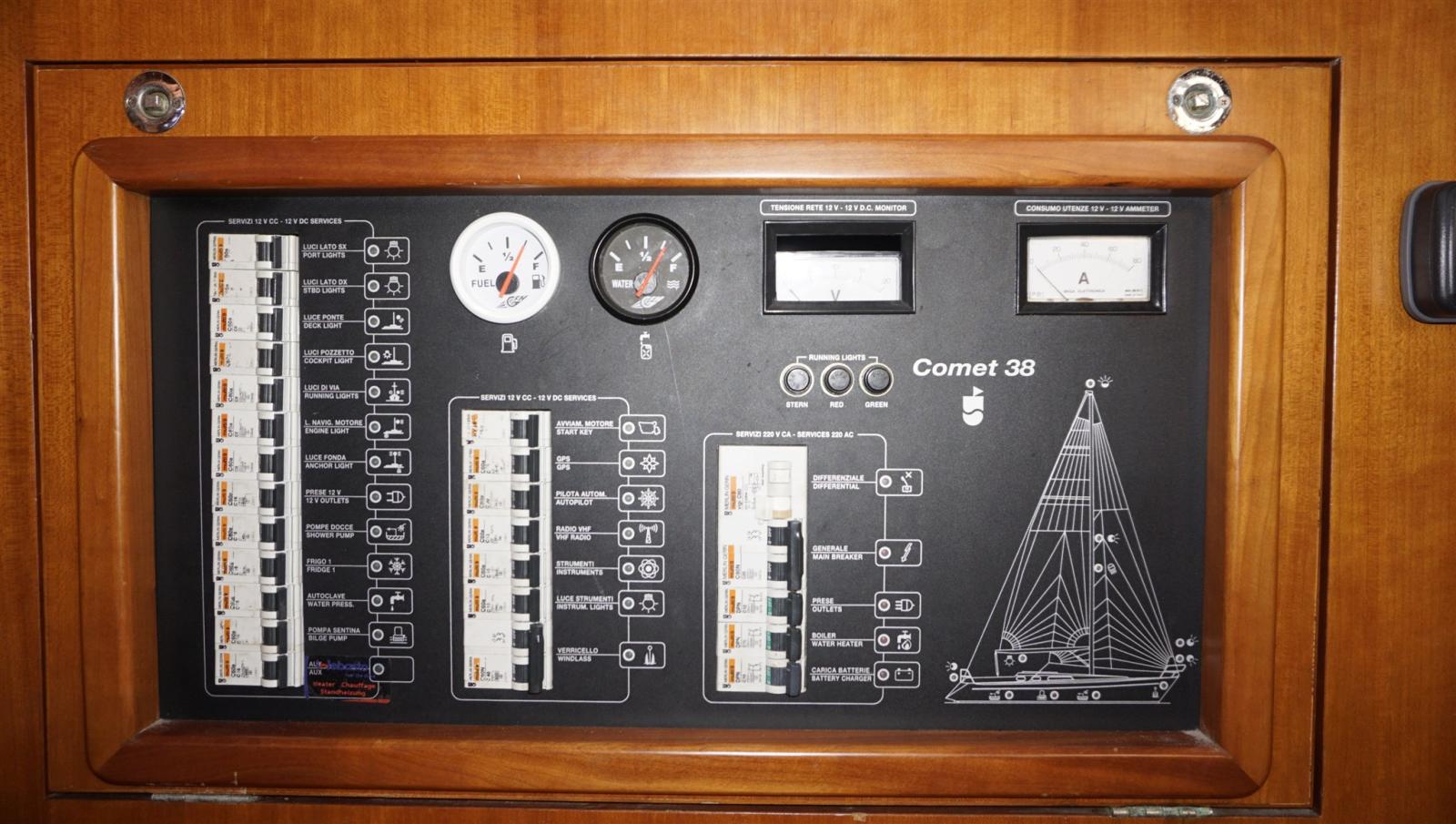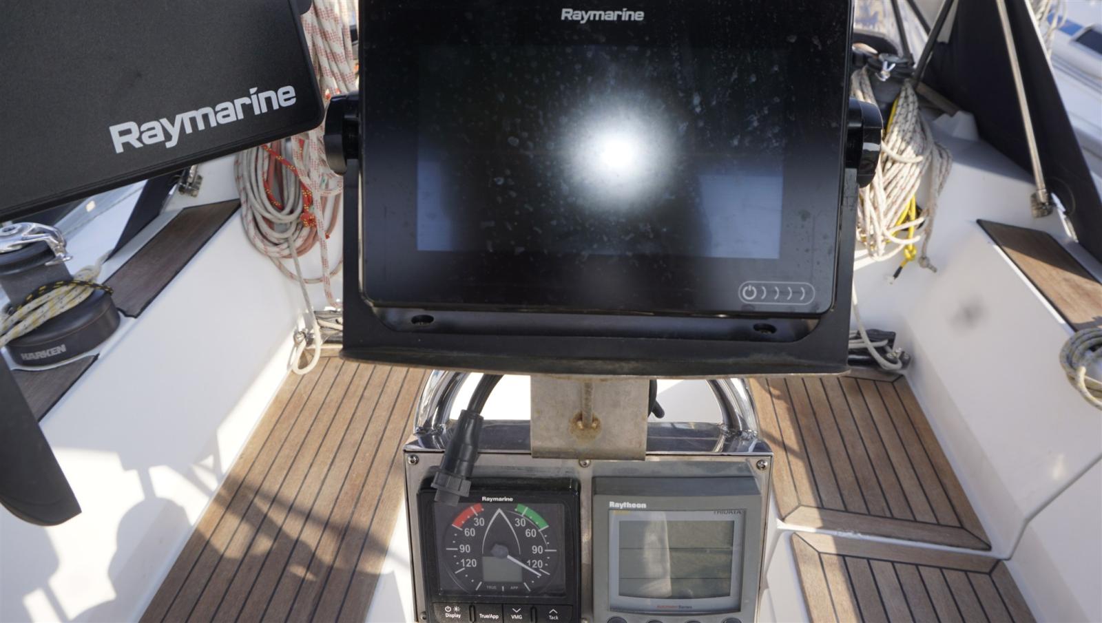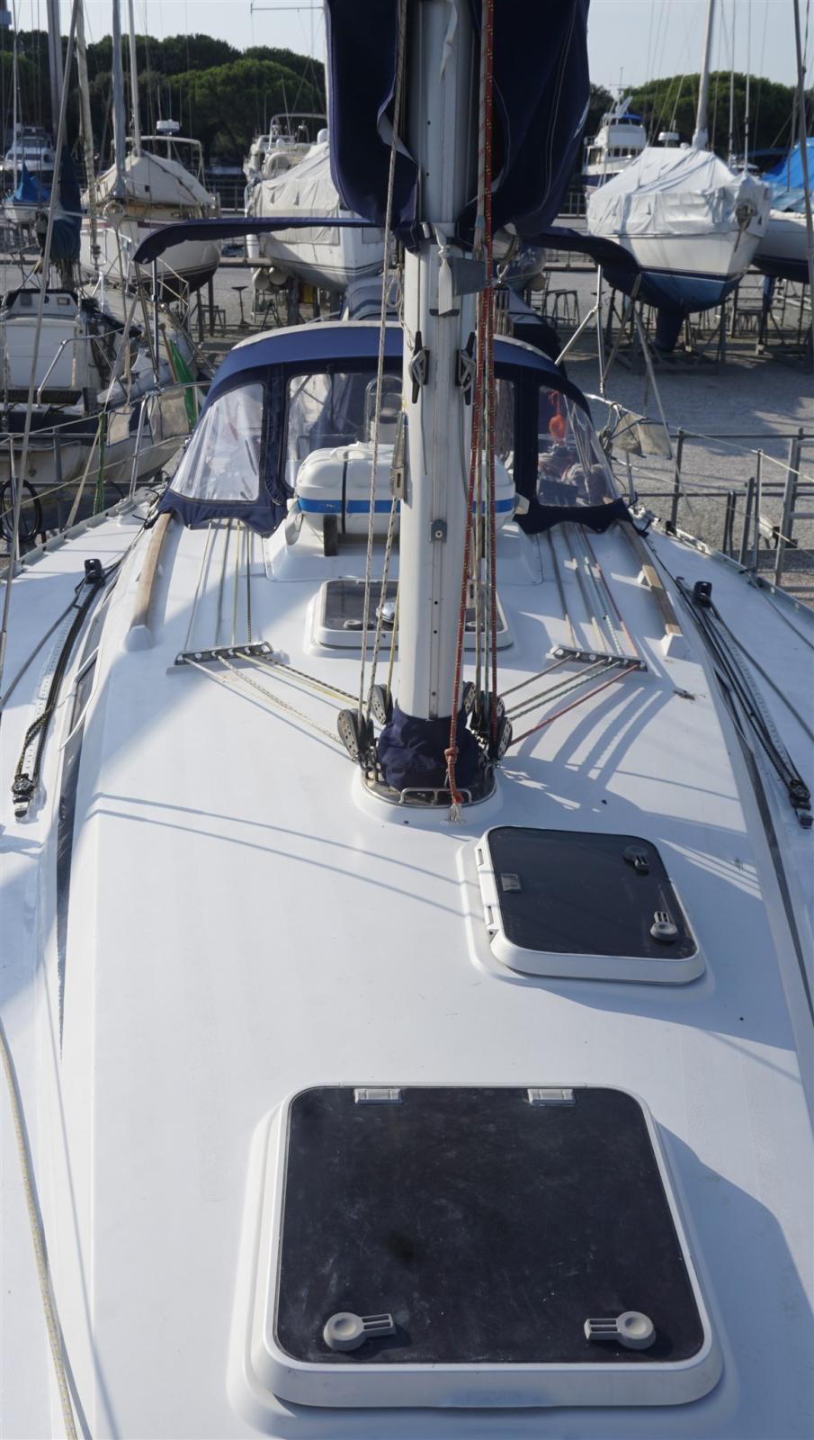 Anchor (15 kg + spare, 50 m chain), Water pressure pump, Shore power cable, Deck Shower, Solar panels, Gangway, Manual Bilge Pump, Teak Cockpit, Shorepower connector, Electric Windlass, swimming ladder, cockpit table, Winch (HARKEN), Windex.