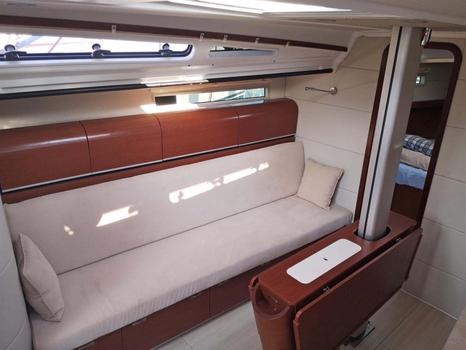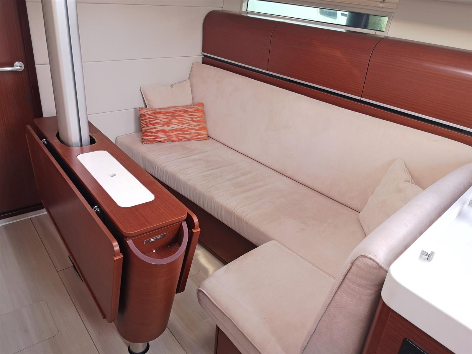 Dinette with central table with folding doors, L-shaped sofa on the starboard side and sofa on the port side