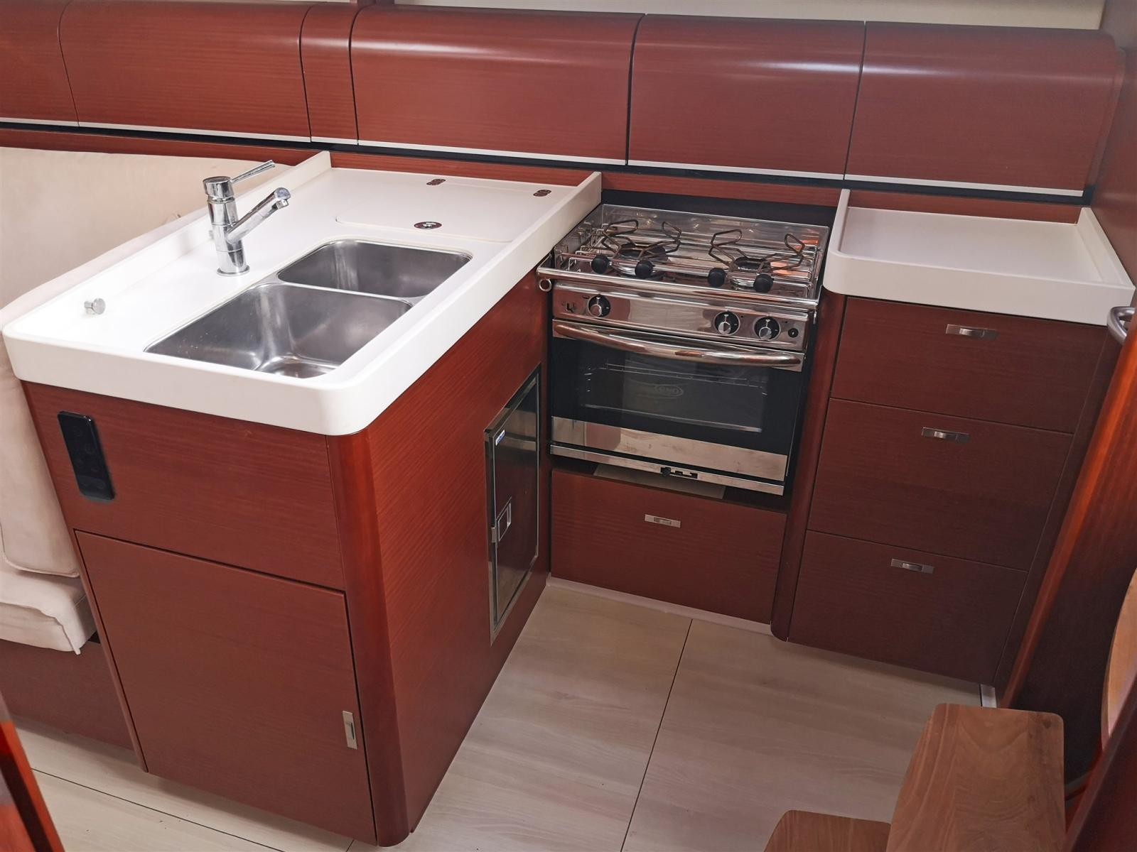 L-shaped galley complete with double sink, 2-burner gas hob, oven and cockpit refrigerator