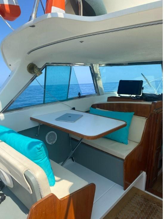 Fume/Gas Detector, Engine Alarm, Anchor (Brice da 7,5Kg), Water pressure pump, Deck Shower, Twin Steering, Hydraulic Flaps, Washbasin in the cockpit, Courtesy Lights, Platform, 2 Electric Bilge Pump, Entry door, Teak Cockpit, Shorepower connector, Electric Windlass, swimming ladder, cockpit table, Horn.