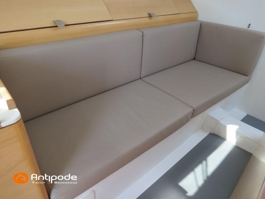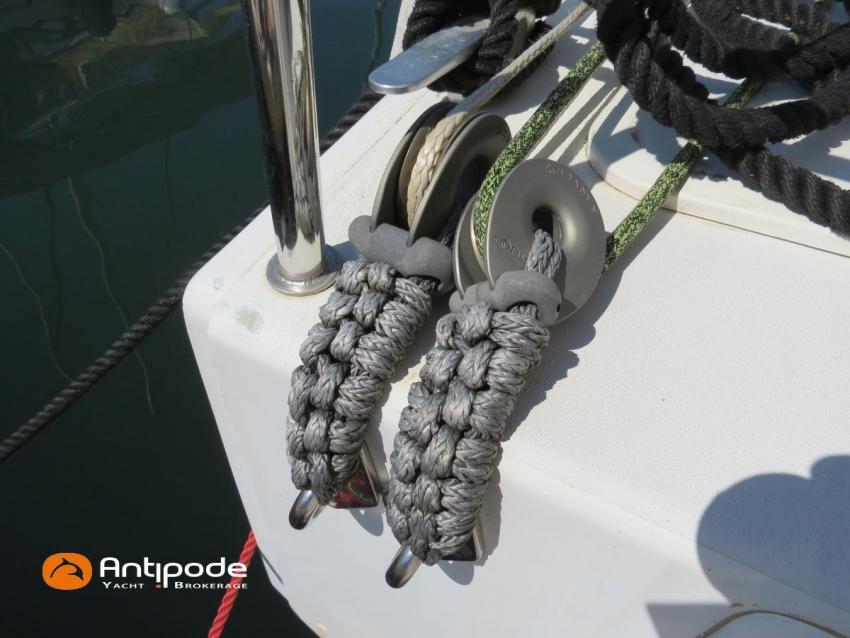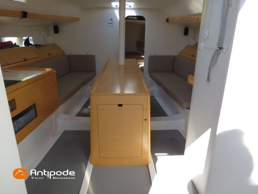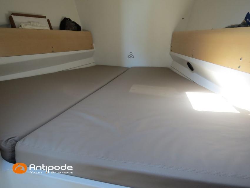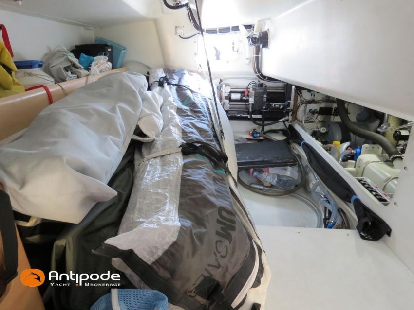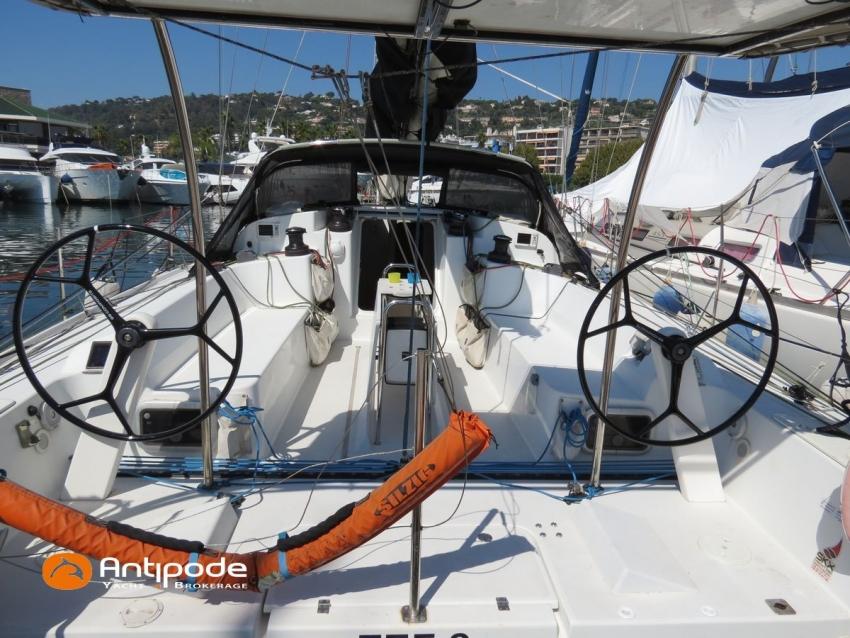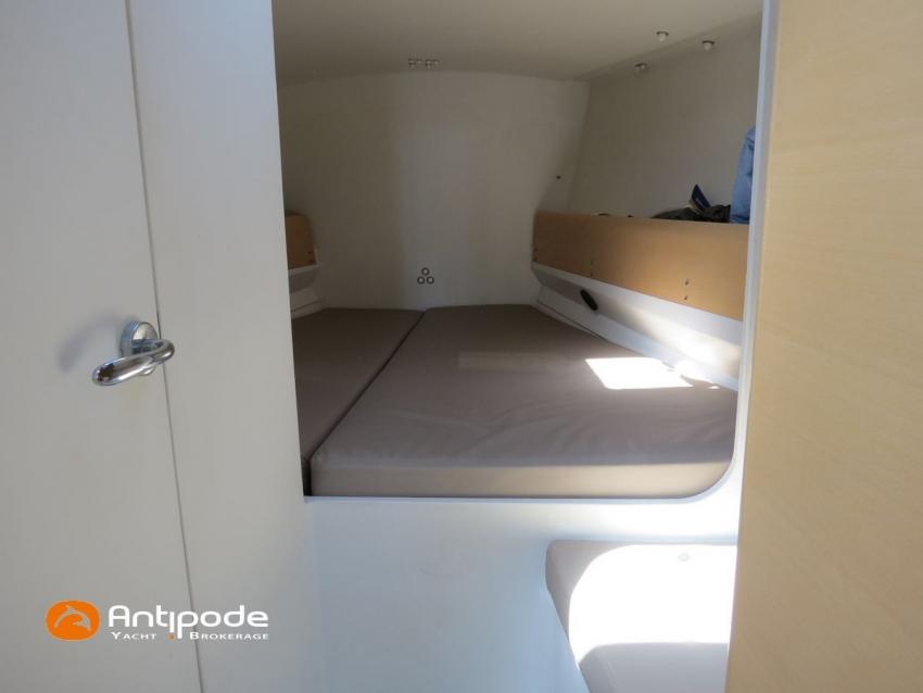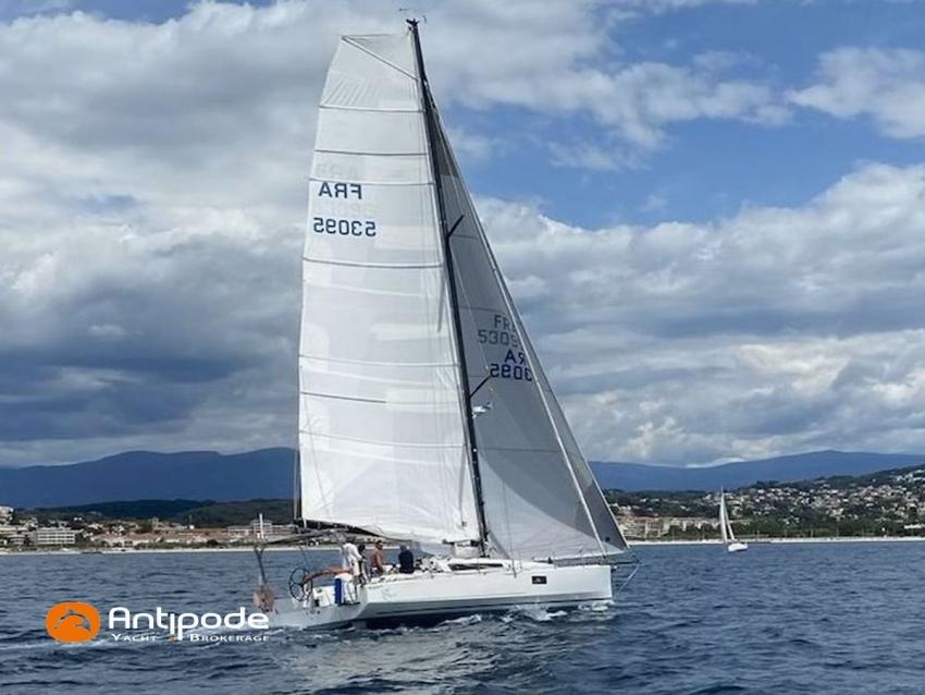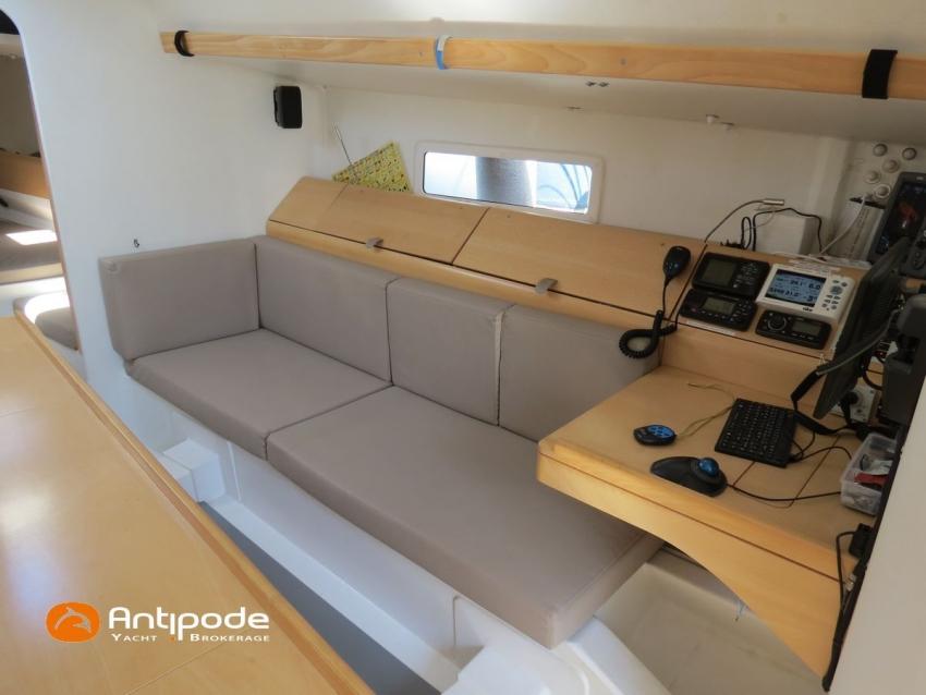 POGO 1250, 2015, VOLVO D1-30 F, 27 hp (1016 hrs), Interior layout version 1 forward cabin, 2 aft cabins, 1 heads (toilets + shower), 1 head (shower), Silvertex Extra comfort cabins upholstery, Anti roll canvas in saloon & aft cabins, UV protection on roof windows, Removable carbon bowsprit, Stern pulpit deck support, GRP cockpit table with 2 folding leaves & locker, Twin steering composite wheels, Cockpit sprayhood (renewed 2022) with UV protection on windows, Sun awning, Quick electric windlass (renewed in 2023) with counter of chain remoter control, Cockpit electric windlass remote control, Aft cockpit roll bar (2018), Outboard engine bracket, Carbon mast, Dyform cable standing rigging (from 2015, checked in 2018), Set of sails from 2015 : Square top mainsail (full batten) + asymetric spinnaker (140sqm) + staysail + lazybag, Set of sails from 2018 Quantum : 3 reefes mainsail 57.23sqm full batten MC6500 + A0 92.30sqm (code 0) + Jib top CZ90 54.91sqm + Staysail MC6000 21.80sqm + storm jib 12.97sqm + Genoa MC6500 42.47sqm + mainsail cover + lazy jacks + lazybag for sailing with halyards bags, Main sail mast track + batten cars + Karver square top system, Double lines main sail reefing system, Genoa roller furling with above deck drum - Facnor Flatdeck (2022), Genoa anti-UV protection cover, Karver F5 furler for A0 & Gennaker, Karver F2 furler for staysail & storm jib, Dyneema running rigging, Running backstays (2018), 2 x in board autopilot tillers : Raymarine & Lecomble & Schmidt, 2 x Calculator Gyropilot 2 NKE, Switchs for the 2 automatic inboard tillers or the 2 NKE Gyropilot (second autopilot works only with compas), 2 x Gyrographics on starboard + 1 on port (for the second NKE unit) + 1 at chart table, NKE Wifi box , HF GPS + HR wind sensor + HR100 barometer - NKE, True wind mode, NKE Regata compas for bus n°1 et Fluxgate for bus n°2, GPS and chartplotter (cockpit) - B&G Vulcan 7 pouces, Electronic navigation charts - C-Map for Europe, Radar with radome radar fitted on mast - Koden (2018), Echomax radar system, AIS Transponder CLASS B (emission and reception) - Icom MA500-TR, DSC GPS VHF at chart table - Icom , Fusion Hi-Fi audio system + speakers, PC + windows + TimeZero, 100 db alarm, Distress beacon - Ocean Signal (exp. Sept 2029), Fridge unit 12 V (top opening door), Hot and cold pressurized water, 2 burners cooker + oven, 220 V shore power + battery charger - Cristec 12 - 40A, 3 x Service batteries - Exide 3 x 95Ah (2022), 12 V to 220 V Inverter on chart table, Interior 220 sockets, Battery controller - Victron, Heating system EBERSPACHER, Watermaker 12 V - Aquabase 35L/h (2018), Holding tank, Solar panels - Solara - 2 x 150W + MPPT Victron (2018), Water turbine Watt & Sea 600W (2018), Hot and cold cockpit shower, Leds navigation lights, Liferaft - Seasafe 6 men - Next service date May 2026 , Offshore french safety equipments for 4 men (excl portative VHF), 15 Kg Spade anchor + 50m lenght of chain, Fenders and warps, Dinghy : Zodiac Fastroller Cadet 325, Yamaha 9.9Hp outboard engine, Actual second owner, same owner till 2018, never chartered, Located Mediterranean. For more information or to make an appointment for a visit, contact : Jean-Baptiste Lemaire +33 6 10 25 00 03 - jb@antipode-yachts.com