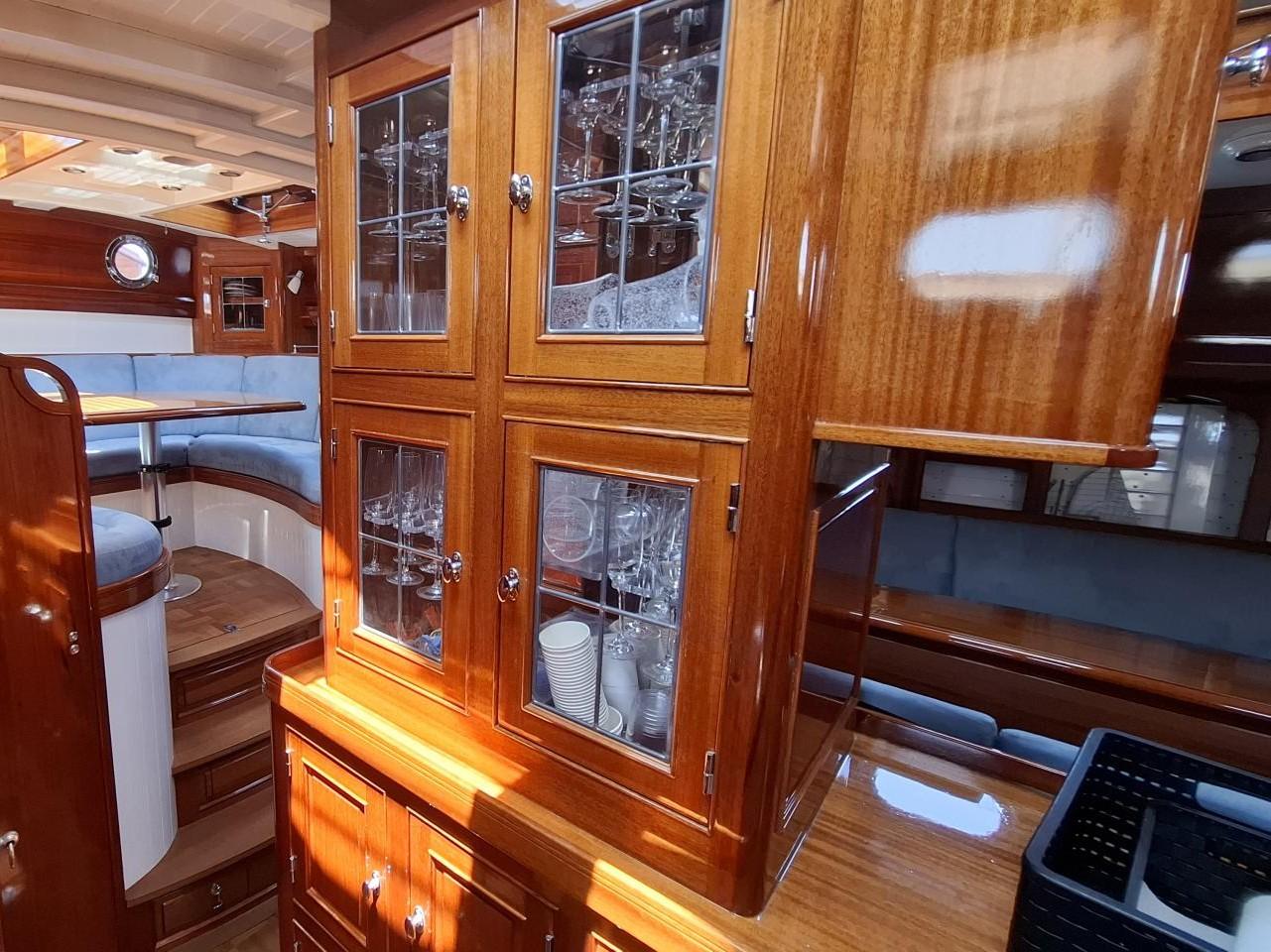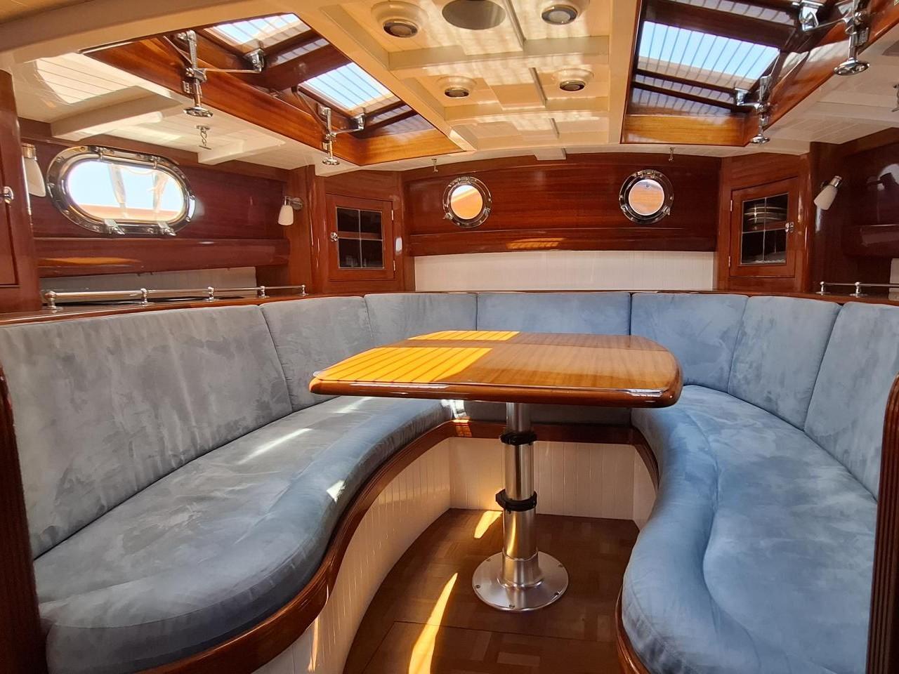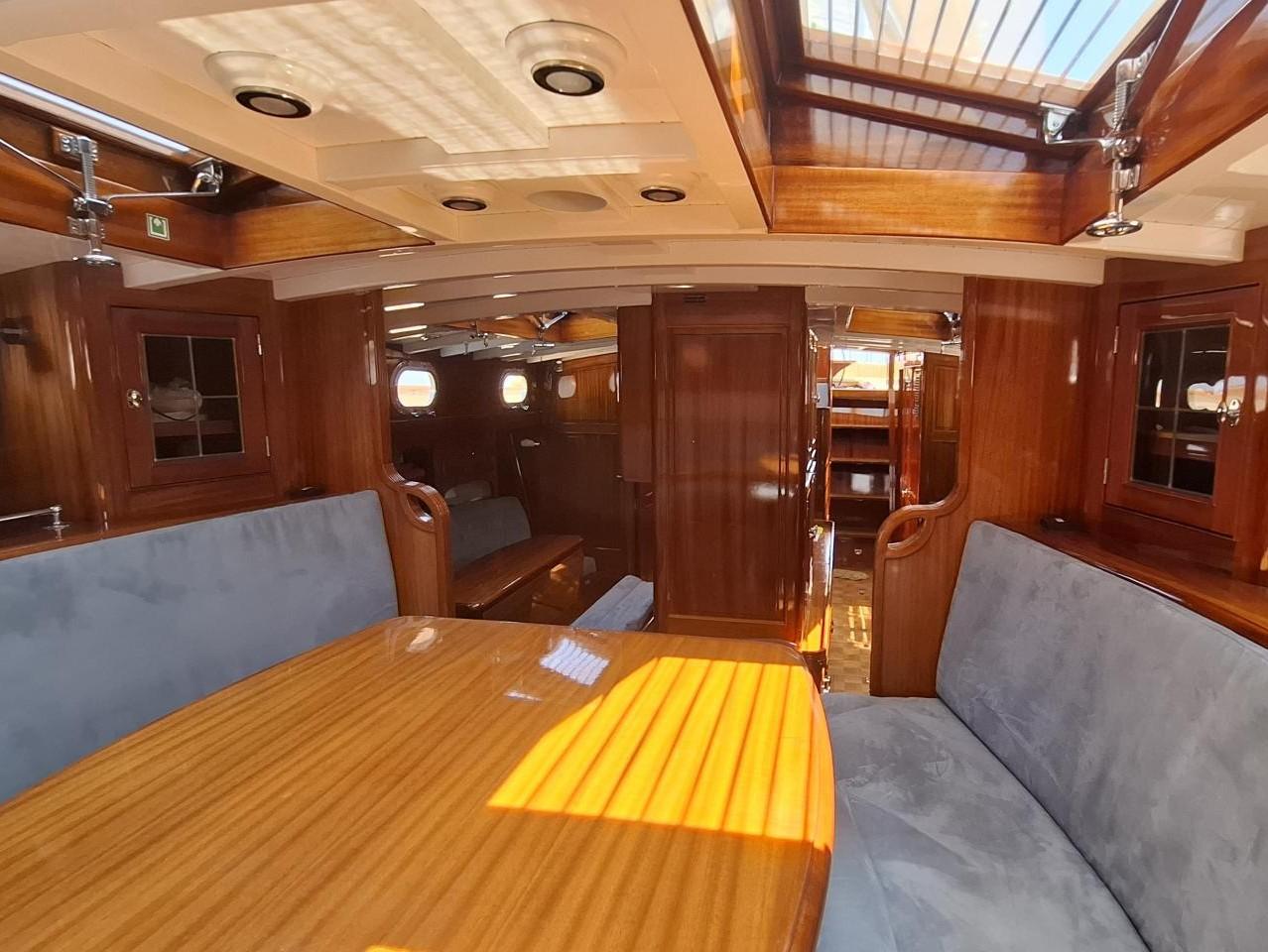 Natural mahogany finish, massive teak, white ceiling, blue-grey upholstery, classic and warm atmosphere