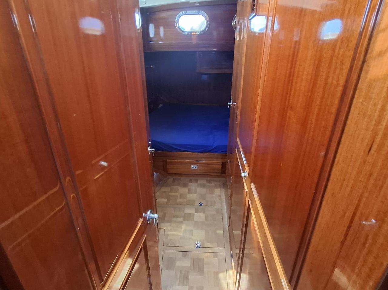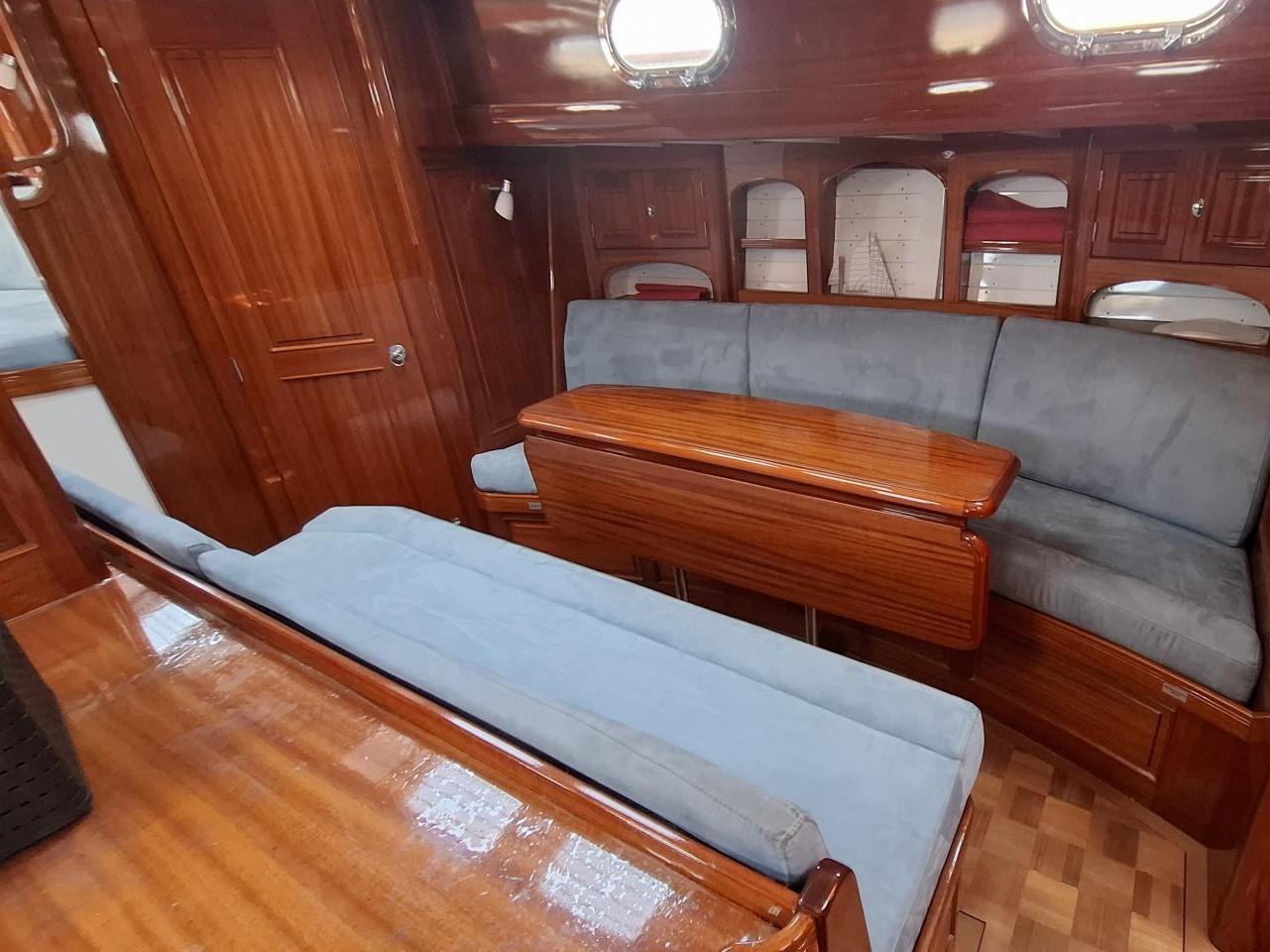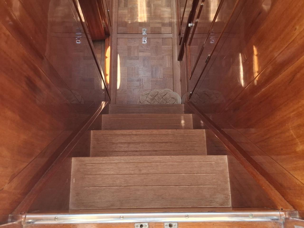 Natural mahogany finish, massive teak, white ceiling, blue-grey upholstery, classic and warm atmosphere