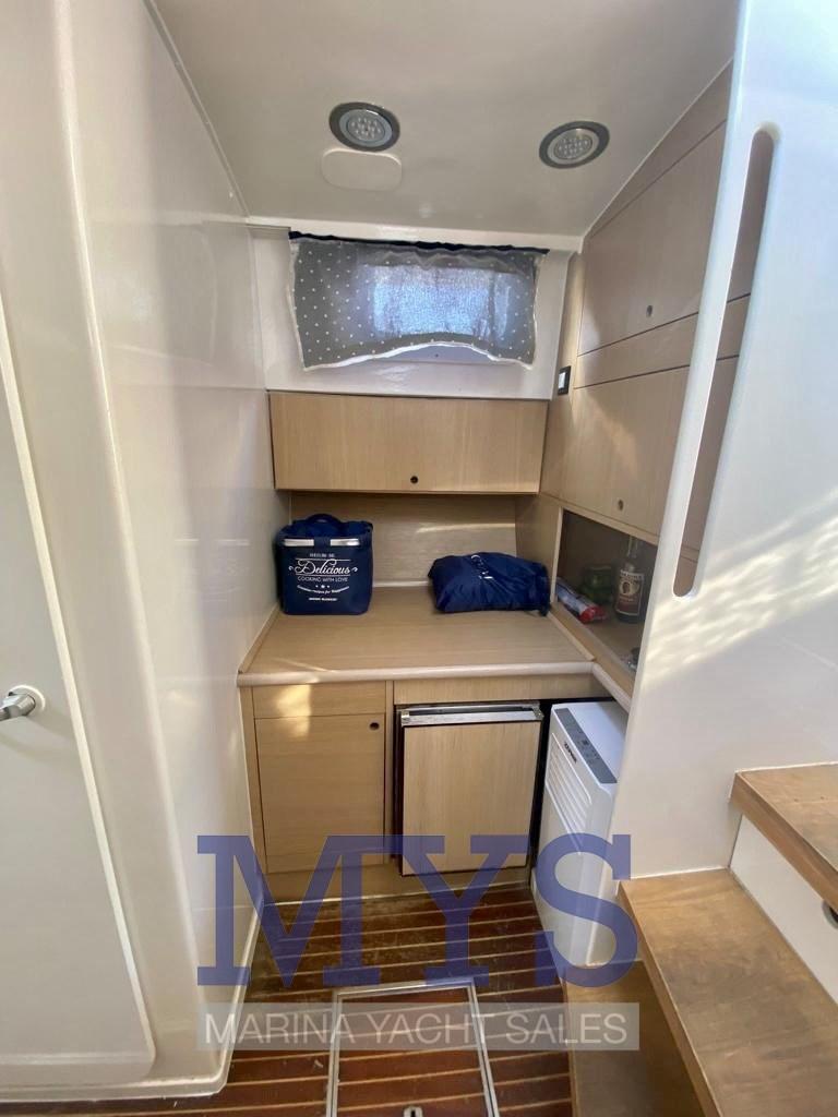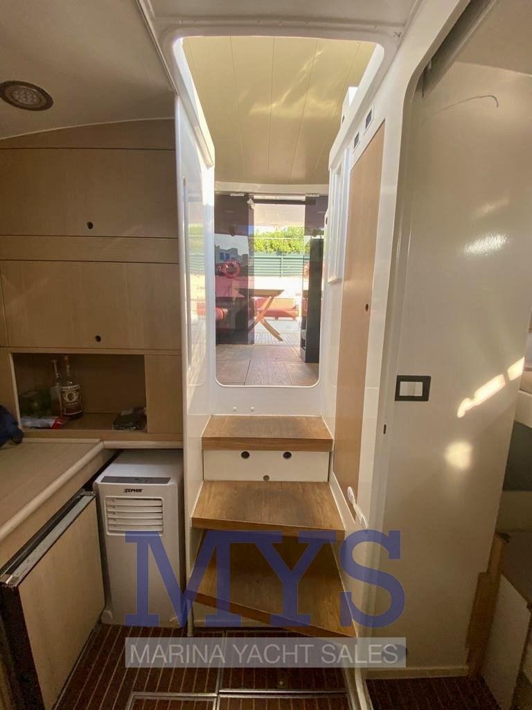 The idea behind the project was to have a comfortable boat for 4 people, with volumes and water lines designed to privilege the spaciousness of the interior spaces and safety in navigation. The cockpit is well sheltered and the interiors are really spacious and contemporary.