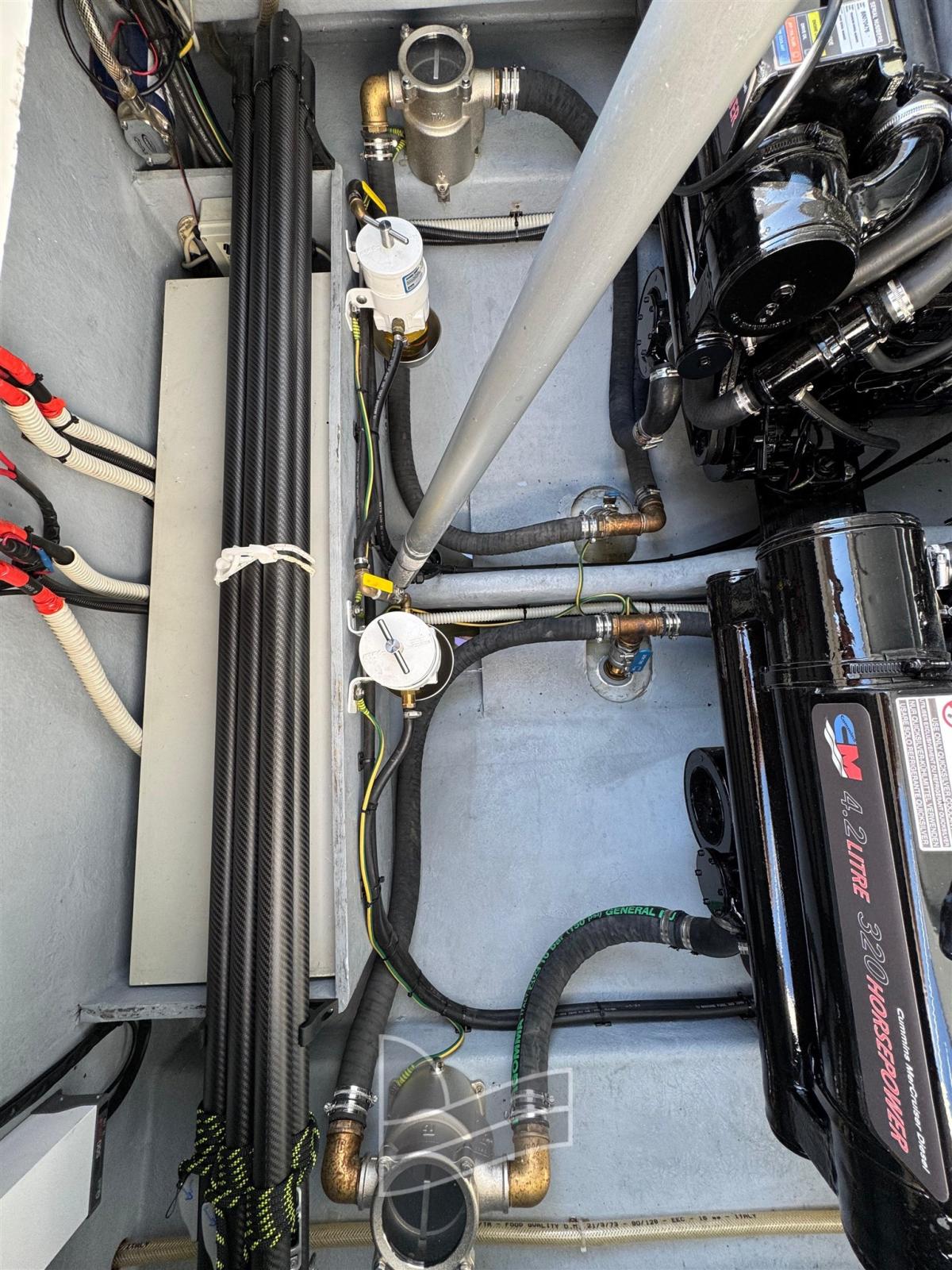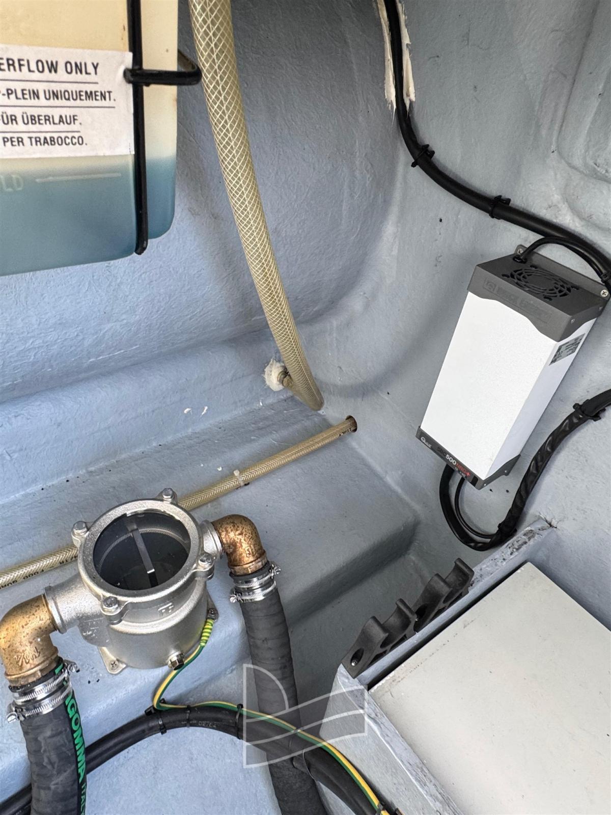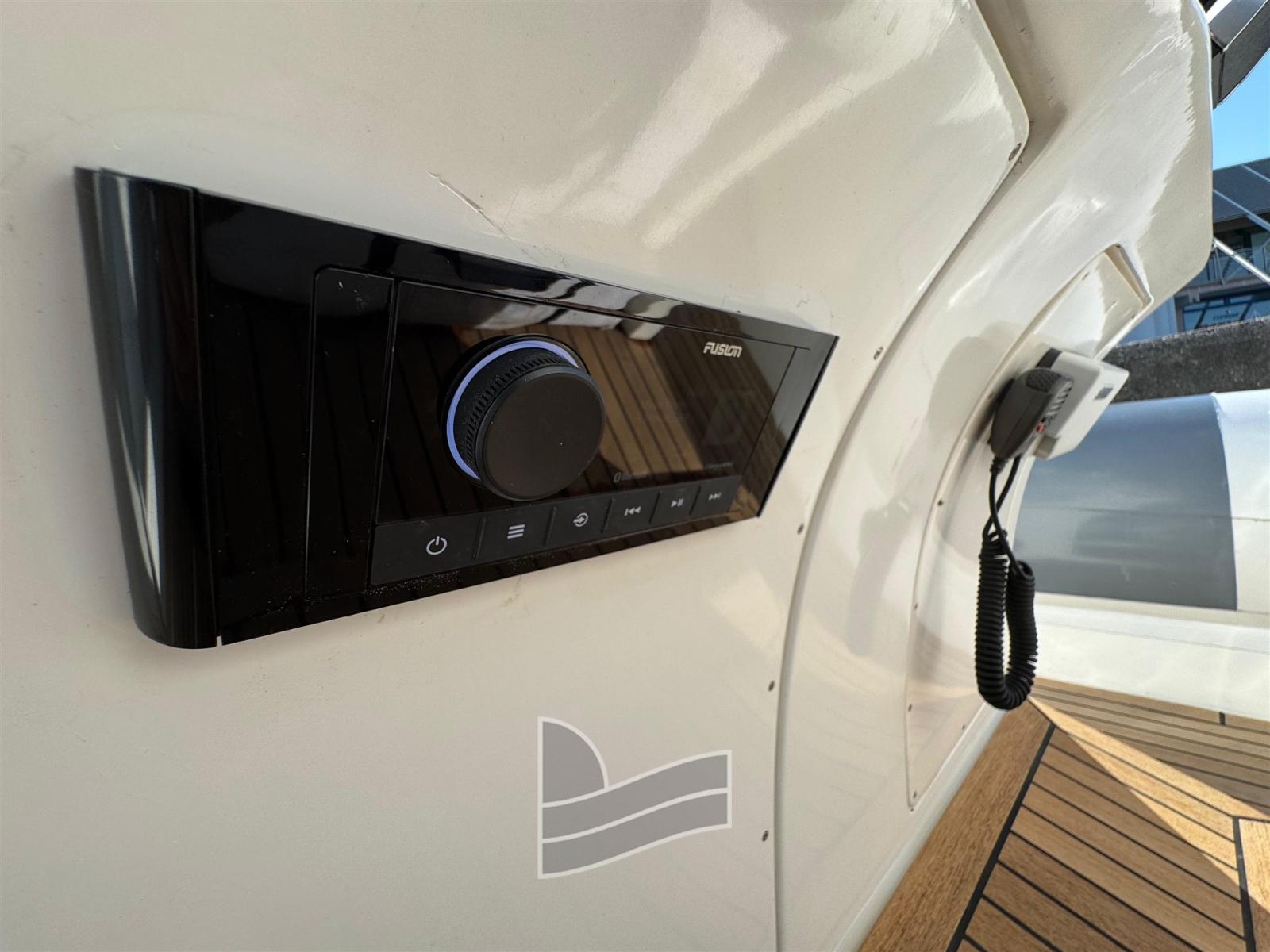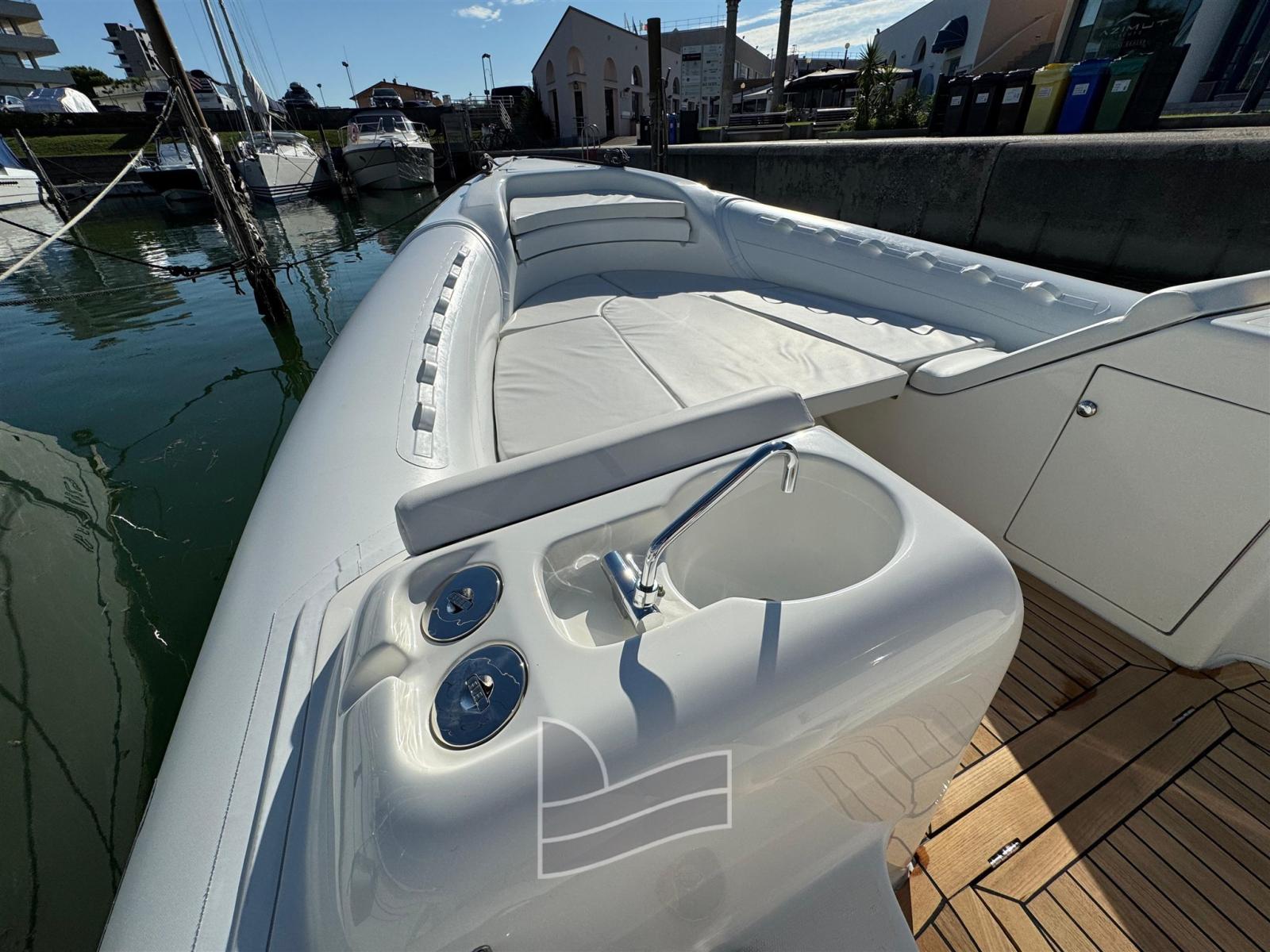 Engine Alarm, Anchor (Acciao), Water pressure pump, Teak Side Decks, Shore power cable, Deck Shower, Fire Extinguishing System, Washbasin in the cockpit, Platform (di poppa), Teak Cockpit, Shorepower connector, Electric Windlass, swimming ladder, Horn.
