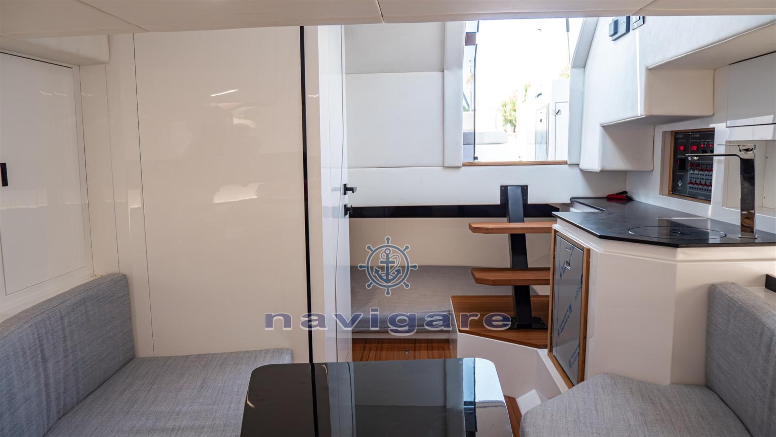 TECHNICAL COMPARTMENT • Thermo-acoustic insulation • Electrically operated bonnet • Fire extinguishing system in engine room • Automatic bilge pumps • Fuel tank capacity: 640 litres • Fuel valves with safety locks at the helm. • Water tank capacity: 200 litres • Fresh water deck flush pump* • Fresh water pump* • 80 litre dirty water tank with pump • Drain tank drain point on the side of the deck. • 2 AGM engine batteries • 2 AGM service batteries • 4 kW generator with battery* • Additional AGM battery* • Air conditioning system: 12,000 BTU*