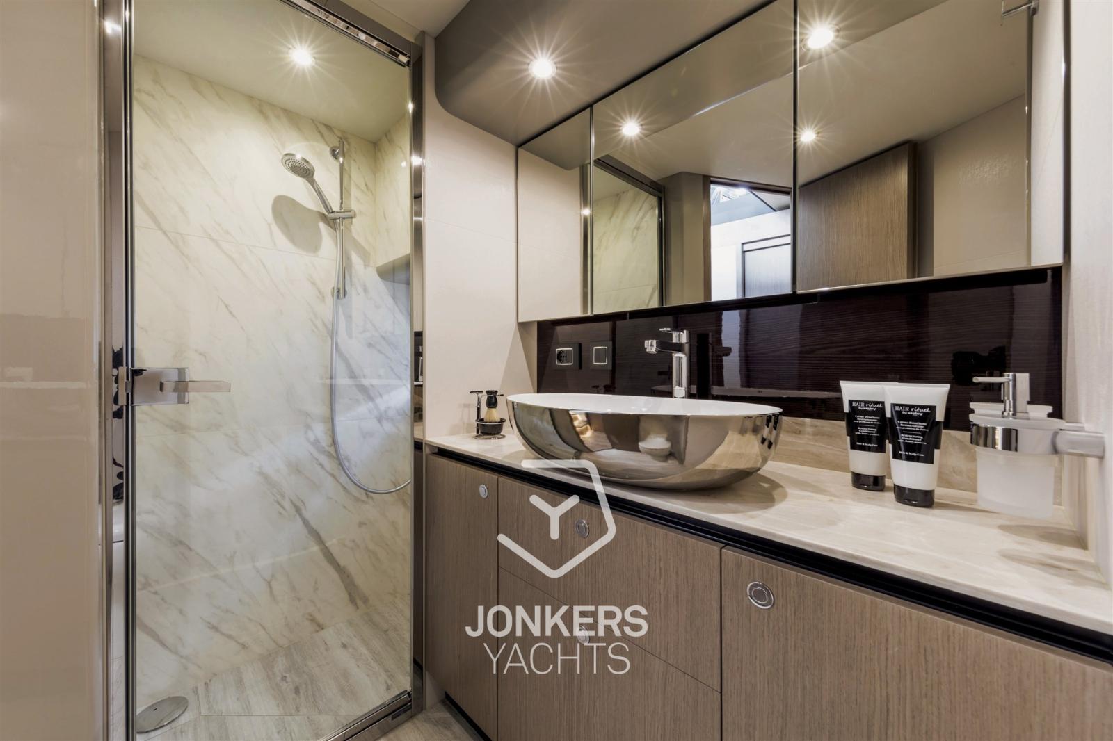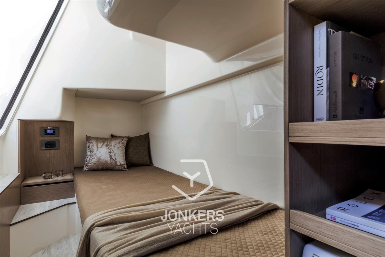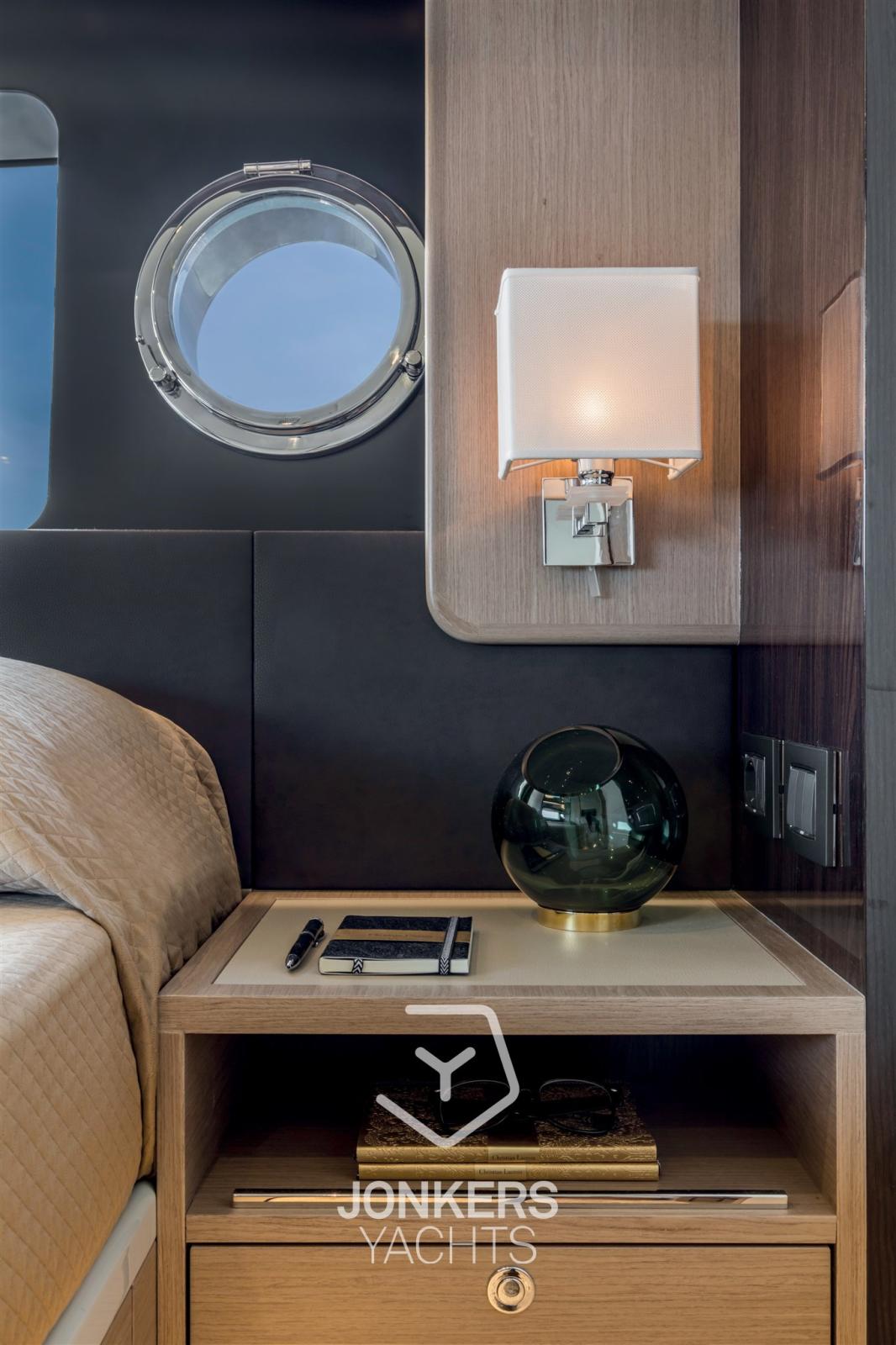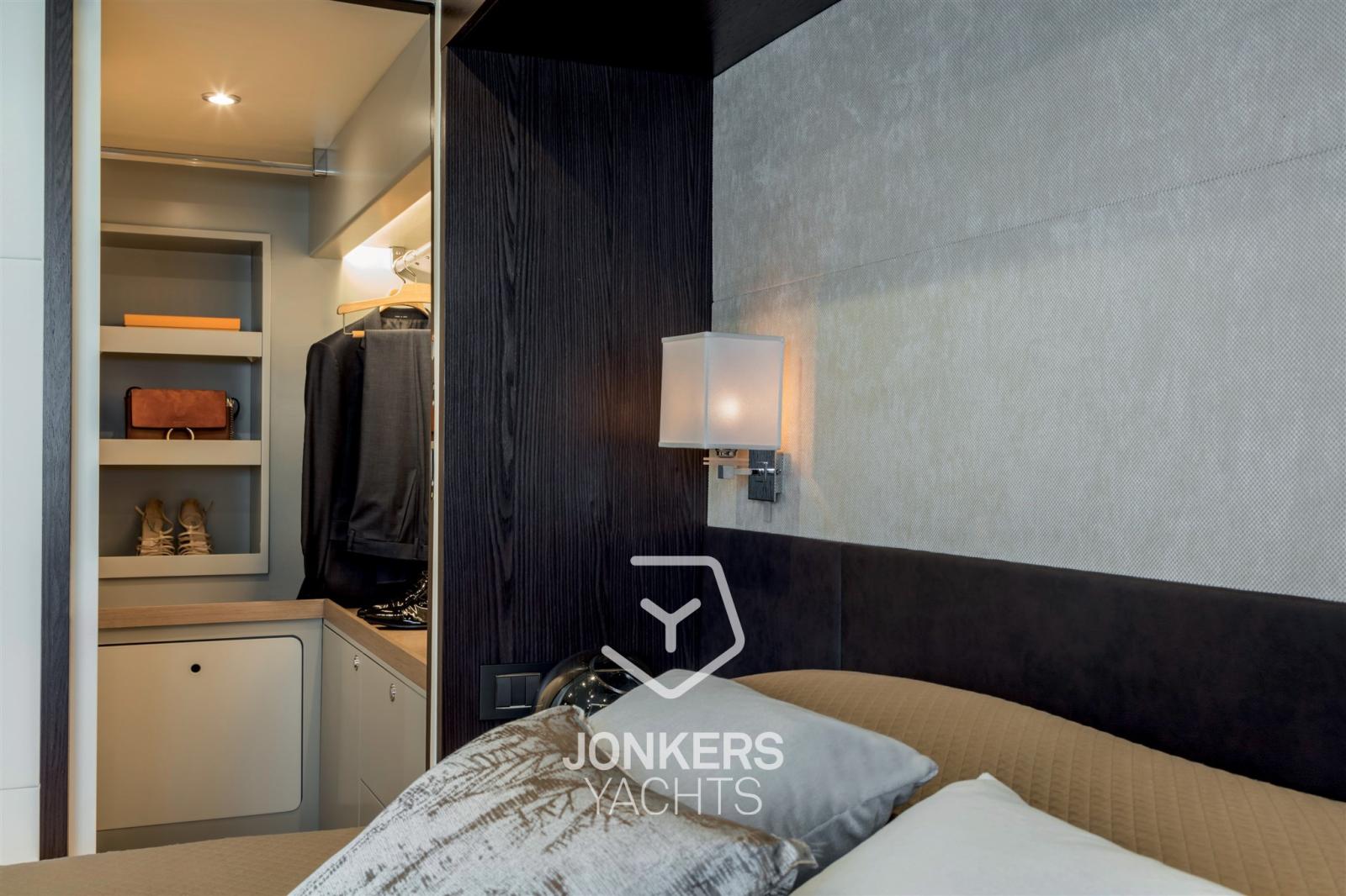 The master cabin is raised and placed transversely to the bow. This main suite represents the result of meticulous and unbiased engineering, covering a remarkable surface for yachts of this size. Its large double bed has plenty of room at the sides and the ceilings are considerably high. The furniture includes a large closet, as well as a vanity area, with a seat and a desk. Additionally, the head is en-suite and has a separate full shower.
