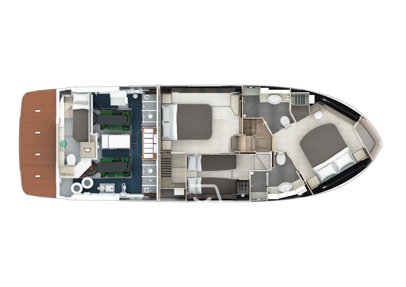 The third guest double cabin has separate berths, while the fourth cabin, placed aft, can accommodate an extra guest or crew.
