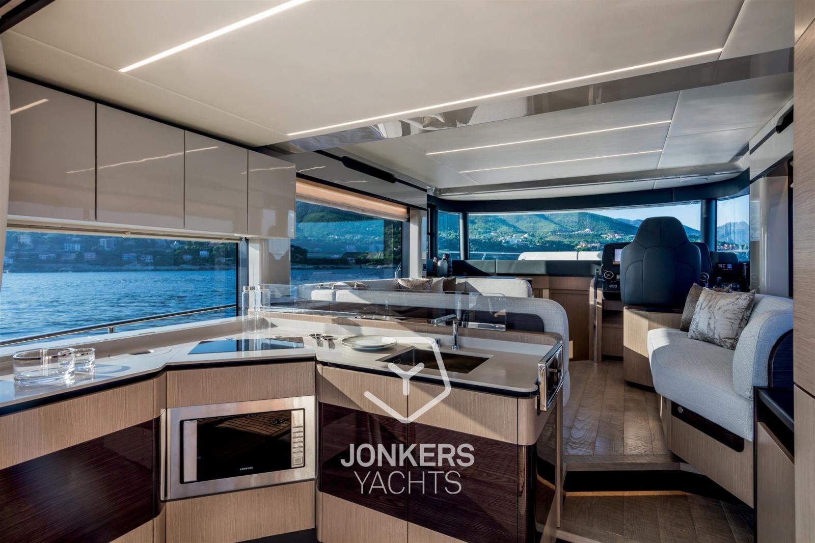 The salon continues with two elegant sofas and a starboard helm station where a side door allows you to exit directly on the walkway. Thanks to a windshield without central pillars, visibility is exceptional even when sitting.