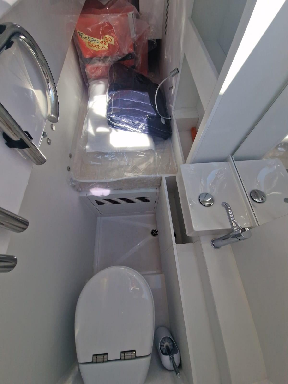Anchor (Anchor upgrade, 32 kg), Water pressure pump, Teak Side Decks, Deck Shower, Courtesy Lights, Underwater lights, Gangway, Automatic Bilge Pump, Manual Bilge Pump, Teak Cockpit, Electric Windlass (Electric anchor windlass 1500 W upgrade), swimming ladder, Stabilizers (Gyro stabilizers), cockpit table.