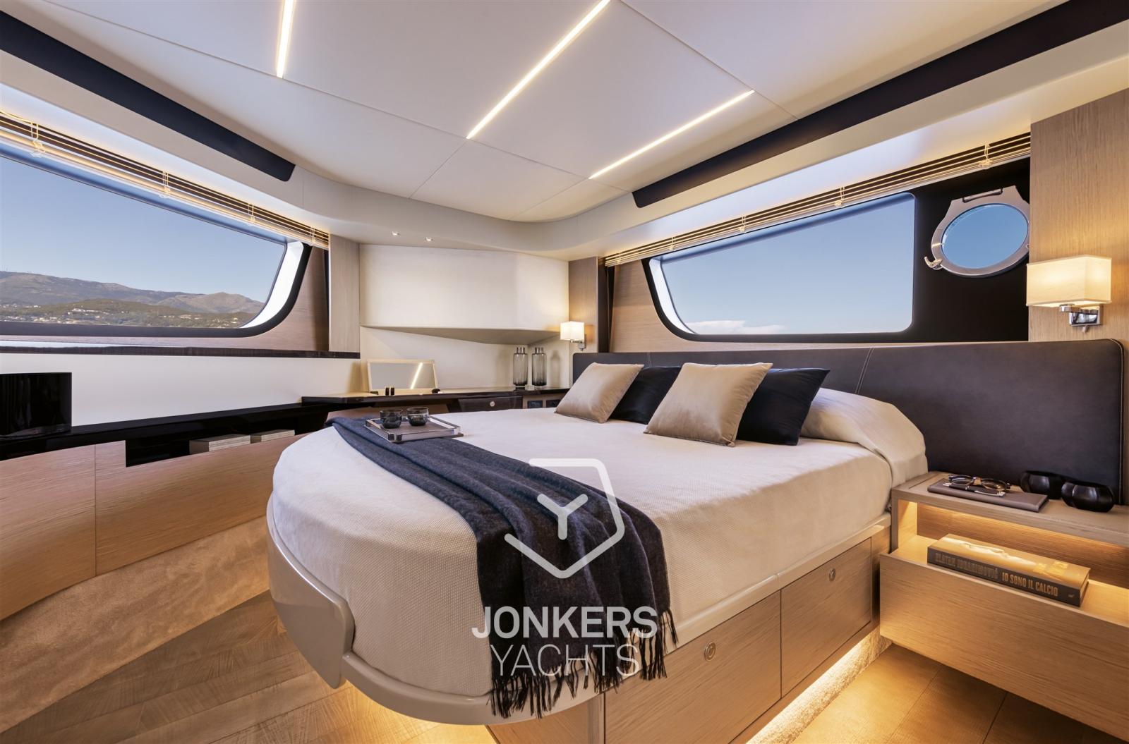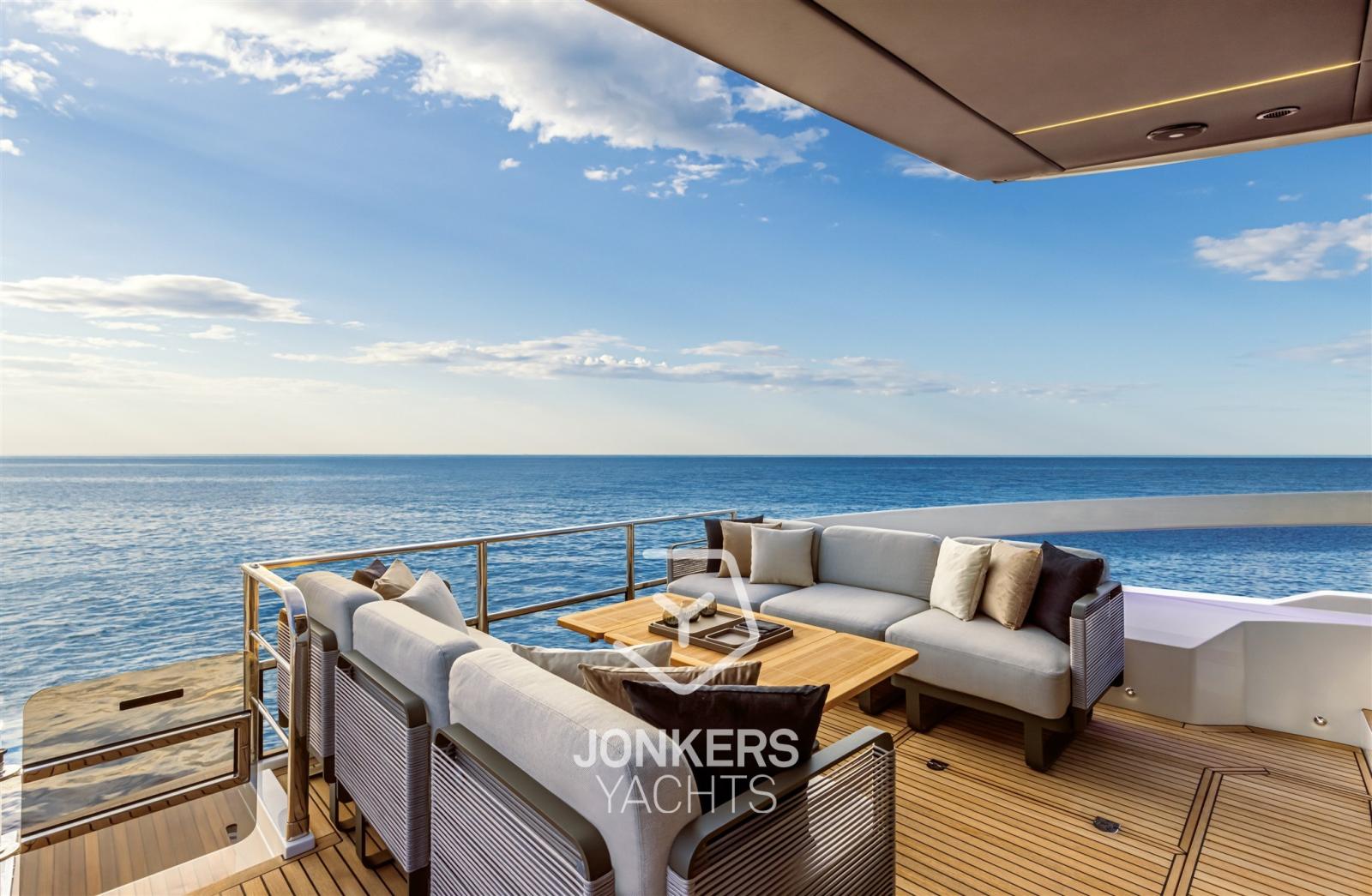 In the salon, the large side windows envelop the entire deck and, together with the panoramic windshield, offer uninterrupted visibility. From the inside, the breath-taking view turns into an actual 360-degree panorama. Moreover, the windows can be electrically opened, letting in the sea breeze and creating a pleasant, natural air recirculation.